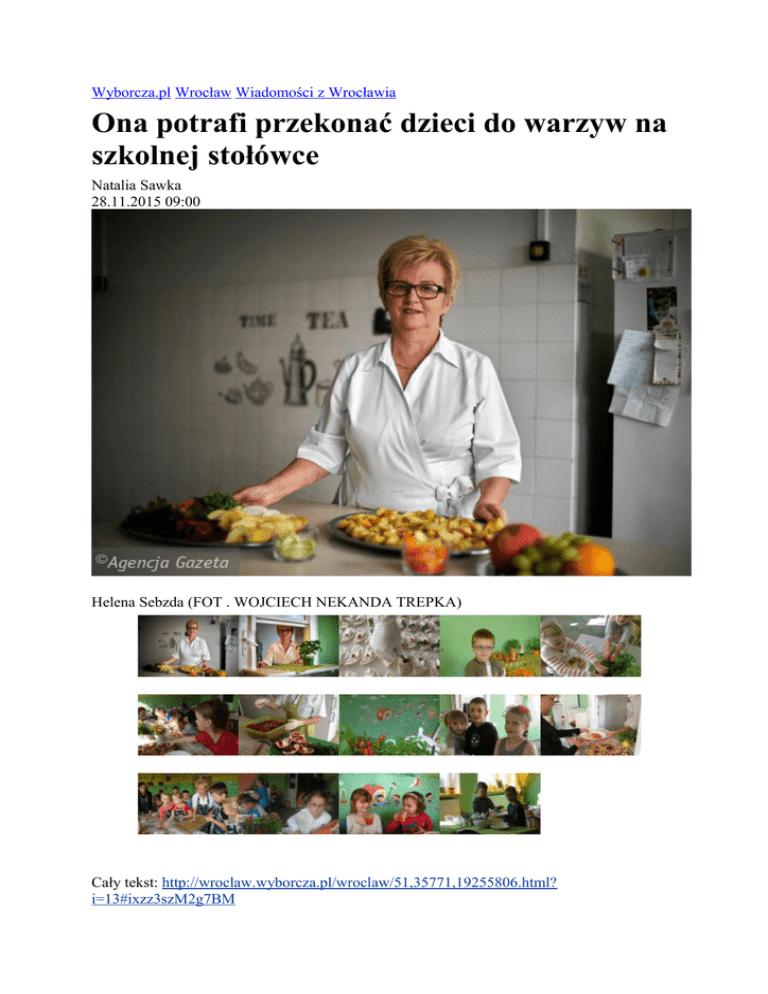 Wyborcza.pl Wrocław Wiadomości z Wrocławia Ona potrafi przekonać dzieci do warzyw na szkolnej stołówce Natalia Sawka 28.11.2015 09:00 Helena Sebzda (FOT . WOJCIECH NEKANDA TREPKA) Cały tekst: http://wroclaw.wyborcza.pl/wroclaw/51,35771,19255806.html? i=13#ixzz3szM2g7BM Z surówkami jest w stołówce największy problem, bo mięso i ziemniaki dzieci jedzą chętnie, ale do warzyw muszą się przyzwyczajać. Ostatnio dzieci robiły więc z nich własne kompozycje na talerzach, a potem zadowolone wszystko jadły - opowiada Helena Sebzda. Wchodzimy do stołówki w Szkole Podstawowej nr 98 przy ul. Sycowskiej na Psim Polu. Pani Helenka, to taka dobra osoba. Sama urządziła kuchnię. Widzi pani, jak tu pięknie? Te wszystkie firanki to sama uszyła. Nawet kolorowe obrusiki wyszły spod jej ręki. Każdy element w tym miejscu jest wyjątkowy - opowiada Anna Motak, dietetyczka i bliska przyjaciółka pani Heleny. Rzeczywiście, stołówka, w której pracuje pani Helena Sebzda, to właściwie przytulny kącik dla dzieci. Maleńkie stoliki przykryte są obrusikami. Stoją na nich doniczki z sałatą, pietruszką i bazylią, a z nich wystają główki rzodkiewek w postaci różyczek. Ściany są kolorowe, na nich zdjęcia dzieci przygotowujących surówki i kruche pierniczki. - Uczniowie, którzy są na zdjęciach, czują się wyróżnieni. Niektórzy z nich sami do mnie przychodzą i mówią, że też chcą na nich być - mówi pani Helena. Nie pracuje tu sama. W dużej kuchni, w której jest jeden wielki stół, piec gazowy, zlew z dwiema komorami i drugi trochę mniejszy, pomaga jej córka. - W przyszłym roku stołówka ma się powiększyć. Bardzo się cieszę, bo dłużej będziemy razem z dziećmi. Często tu zaglądają. Z samego rana zachęcam panie ze świetlicy, by przychodziły tu z uczniami. Wspólnie zrobimy śniadanie. Dzieci układają na kanapce ser, rukolę i pomidor. Bułeczki opiekamy w piecu. A potem zasiadamy do stołu, by ucztować opowiada. Rozmowa z Heleną Sebzdą Natalia Sawka: Co takiego wyjątkowego pani robi, że uczniowie lubią tę stołówkę? Helena Sebzda: Proszę mi wierzyć, że nic nadzwyczajnego. Kiedy rodzic przyprowadza swoje dziecko o 7 rano, a odbiera o 17, to nie mam wyboru, muszę stworzyć w tym miejscu domową atmosferę. Chcę, by dzieci czuły się jak w domu, żeby nie traktowały stołówki jak restauracji - jemy, wychodzimy i koniec. Ja też nie traktuję tej stołówki tylko jako miejsca pracy; zarabiam pieniądze, zamykam stołówkę i koniec. Dzieci są najważniejsze. Kiedy widzę, że któreś odsuwa drugie danie, bo jest niejadkiem, to próbuję z nim jakoś współpracować. Biorę talerz, nakładam sobie obiad i siadam razem z dzieckiem. Jemy razem, rozmawiając, co ciekawego było na lekcjach. Mam 300 dzieci do nakarmienia, ale większość znam i wiem, co lubią. Wspólnie gotujecie? - Tak, robię warsztaty. Chcę, żeby poczuli się kucharzami. Wszystkim rozdaję kolorowe fartuszki i papierowe białe czapeczki. Pamiętam, że takie kiedyś pół nocy robiłam. Wspólnie pieczemy owsiane ciasteczka i robimy szaszłyki z owoców. Na wykałaczki nabijamy np. ananasa, brzoskwinię, mandarynki, banana czy kiwi. Poznajemy ich smaki i o nich rozmawiamy. Jedna z mam była zaskoczona, bo jej córka nigdy nie jadła kiwi, a w stołówce spróbowała i potem już w domu też jadła. Ponoć potrafi pani dzieci zaciekawić przeróżnymi produktami. - Tego nauczyła mnie moja babcia. Przychodziła z warzywniaka i kroiła nam wszystkie kupione warzywa. Z ciekawości zjadaliśmy je wszystkie. Kiedyś dodałam do surówki ziarna dyni. Dzieci nie wiedziały, co to takiego. Następnego dnia przyniosłam im prawdziwą dynię i wyjaśniłam, że w środku ma ziarna. Każdy mógł ją dotknąć, powąchać, a potem skosztować w zupie. I jedli, bo wiedzieli, co jedzą? - Oczywiście. Nie chcę generalizować, z tą wiedzą jest różnie. Jedne dzieci znają warzywa, a inne nie. W doniczce przy wejściu stoi natka pietruszki. Każdy, kto chce, może z niej zerwać listek i go spróbować. Latem, chodziłam na działkę, do szkoły przynosiłam por, koperek i szczypiorek. Dzieci nie mają okazji zobaczyć tych warzyw przed przygotowaniem. Szczypiorek pokroi się na desce i tyle. W stołówce każdy brał go do ręki i próbował. Okazywało się, że por jest kwaśny, a szczypiorek ostry. W ten sposób dzieci mogły nauczyć się nowych smaków. Na parapecie postawiłam w ramce informację dotyczącą kiełków rzeżuchy, słonecznika i brokuła. I wie pani co? Dzieci naprawdę z zainteresowaniem to czytają. A kiedy wspólnie piekliśmy chleb, to przyniosłam do szkoły pszenicę i wyjaśniałam, z czego powstaje mąka. Podobnie było z kaszą. Do różnych miseczek wsypywałam suchą kaszę jaglaną, gryczaną, jęczmienną i kuskus. Uczniowie z zainteresowaniem poznawali ich wygląd i konsystencję. Rodzice ich tego nie uczą, bo nie mają czasu. - Ale spokojnie można go znaleźć w weekend. Wystarczy w ciągu dnia wspólnie ulepić ciasteczka. Do przyrządzenia sałatki można zaangażować maluchy, by ją mieszały. Dzieci najbardziej lubią zupę pomidorową. Nie trzeba ich długo zachęcać do jej wspólnego przygotowania. Mama może kroić pomidory, tata pietruszkę, a dziecko smakuje, czy zupa jest odpowiednio przyprawiona. Potem wszyscy razem siadają do stołu i są szczęśliwi, bo udało się coś razem zrobić. Czyli ważne jest angażowanie dzieci do pracy przy posiłkach? - Tak. U mnie każdy sam bierze łyżeczkę i widelec. Z nożem jest różnie. Niektóre dopiero uczą się go stosować. Przed obiadem dzieci same nalewają sobie kompot do szklanki, a starsze zupę do talerza. Nie ma nakazu. Nalewają tyle, ile chcą. Podczas drugiego dania surówki umieszczam w wielkiej misce, z której każdy samodzielnie nakłada sobie odpowiednią porcję. Z surówkami jest największy problem, bo mięso i ziemniaki dzieci jedzą chętnie, ale d