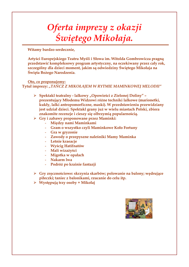 Oferta imprezy z okazji Świętego Mikołaja. Witamy bardzo serdecznie, Artyści Europejskiego Teatru Myśli i Słowa im. Witolda Gombrowicza pragną przedstawić kompleksowy program artystyczny, na oczekiwany przez cały rok, szczególny dla dzieci moment, jakim są odwiedziny Świętego Mikołaja na Święta Bożego Narodzenia. Oto, co proponujemy: Tytuł imprezy: „TAŃCZ Z MIKOŁAJEM W RYTMIE MAMINKOWEJ MELODII” ¾ Spektakl teatralny - lalkowy „Opowieści z Zielonej Doliny” – prezentujący Młodemu Widzowi różne techniki lalkowe (marionetki, kukły, lalki antropomorficzne, maski). W przedstawieniu przewidziany jest udział dzieci. Spektakl grany już w wielu miastach Polski, zbiera znakomite recenzje i cieszy się olbrzymią popularnością. ¾ Gry i zabawy proponowane przez Maminki: - Między nami Maminkami - Gram o wszystko czyli Maminkowe Koło Fortuny - Gra w gryzonie - Zawody o przepyszne naleśniki Mamy Maminka - Letnie kraeacje - Wyścig Hatifnatów - Mali wizażyści - Migotka w opałach - Nakarm lwa - Podróż po krainie fantazji ¾ Gry zręcznościowe: skrzynia skarbów; polowanie na balony; wędrujące piłeczki; taniec z balonikami, rzucanie do celu itp. ¾ Występują trzy osoby + Mikołaj IMPRESARIAT ARTYSTYCZNY TEART s.c. 30-009 KRAKÓW ul. Friedleina 4-6pok.123 tel./fax 012 633-02-02, 6322203 tel. kom. 0507 125 350, 0507 125351 strona: www.teart.art.pl, email: [email protected] Serdeczne pozdrowienia Ryszard Przybysz Ewa Gronau