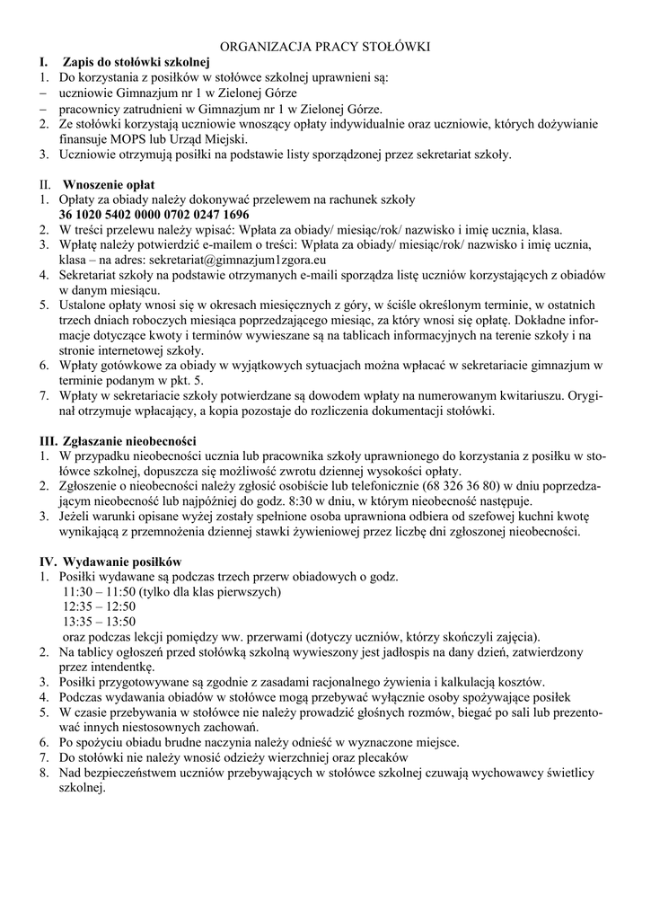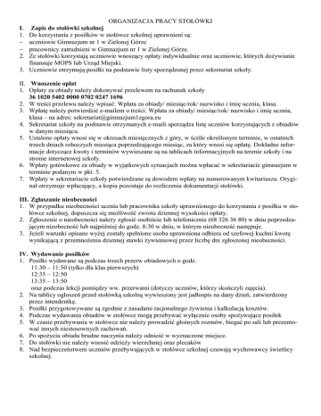 ORGANIZACJA PRACY STOŁÓWKI Zapis do stołówki szkolnej Do korzystania z posiłków w stołówce szkolnej uprawnieni są: uczniowie Gimnazjum nr 1 w Zielonej Górze pracownicy zatrudnieni w Gimnazjum nr 1 w Zielonej Górze. Ze stołówki korzystają uczniowie wnoszący opłaty indywidualnie oraz uczniowie, których dożywianie finansuje MOPS lub Urząd Miejski. 3. Uczniowie otrzymują posiłki na podstawie listy sporządzonej przez sekretariat szkoły. I. 1. 2. II. Wnoszenie opłat 1. Opłaty za obiady należy dokonywać przelewem na rachunek szkoły 36 1020 5402 0000 0702 0247 1696 2. W treści przelewu należy wpisać: Wpłata za obiady/ miesiąc/rok/ nazwisko i imię ucznia, klasa. 3. Wpłatę należy potwierdzić e-mailem o treści: Wpłata za obiady/ miesiąc/rok/ nazwisko i imię ucznia, klasa – na adres: [email protected] 4. Sekretariat szkoły na podstawie otrzymanych e-maili sporządza listę uczniów korzystających z obiadów w danym miesiącu. 5. Ustalone opłaty wnosi się w okresach miesięcznych z góry, w ściśle określonym terminie, w ostatnich trzech dniach roboczych miesiąca poprzedzającego miesiąc, za który wnosi się opłatę. Dokładne informacje dotyczące kwoty i terminów wywieszane są na tablicach informacyjnych na terenie szkoły i na stronie internetowej szkoły. 6. Wpłaty gotówkowe za obiady w wyjątkowych sytuacjach można wpłacać w sekretariacie gimnazjum w terminie podanym w pkt. 5. 7. Wpłaty w sekretariacie szkoły potwierdzane są dowodem wpłaty na numerowanym kwitariuszu. Oryginał otrzymuje wpłacający, a kopia pozostaje do rozliczenia dokumentacji stołówki. III. Zgłaszanie nieobecności 1. W przypadku nieobecności ucznia lub pracownika szkoły uprawnionego do korzystania z posiłku w stołówce szkolnej, dopuszcza się możliwość zwrotu dziennej wysokości opłaty. 2. Zgłoszenie o nieobecności należy zgłosić osobiście lub telefonicznie (68 326 36 80) w dniu poprzedzającym nieobecność lub najpóźniej do godz. 8:30 w dniu, w którym nieobecność następuje. 3. Jeżeli warunki opisane wyżej zostały spełnione osoba uprawniona odbiera od szefowej kuchni kwotę wynikającą z przemnożenia dziennej stawki żywieniowej przez liczbę dni zgłoszonej nieobecności. IV. Wydawanie posiłków 1. Posiłki wydawane są podczas trzech przerw obiadowych o godz. 11:30 – 11:50 (tylko dla klas pierwszych) 12:35 – 12:50 13:35 – 13:50 oraz podczas lekcji pomiędzy ww. przerwami (dotyczy uczniów, którzy skończyli zajęcia). 2. Na tablicy ogłoszeń przed stołówką szkolną wywieszony jest jadłospis na dany dzień, zatwierdzony przez intendentkę. 3. Posiłki przygotowywane są zgodnie z zasadami racjonalnego żywienia i kalkulacją kosztów. 4. Podczas wydawania obiadów w stołówce mogą przebywać wyłącznie osoby spożywające posiłek 5. W czasie przebywania w stołówce nie należy prowadzić głośnych rozmów, biegać po sali lub prezentować innych niestosownych zachowań. 6. Po spożyciu obiadu brudne naczynia należy odnieść w wyznaczone miejsce. 7. Do stołówki nie należy wnosić odzieży wierzchniej oraz plecaków 8. Nad bezpieczeństwem uczniów przebywających w stołówce szkolnej czuwają wychowawcy świetlicy szkolnej.