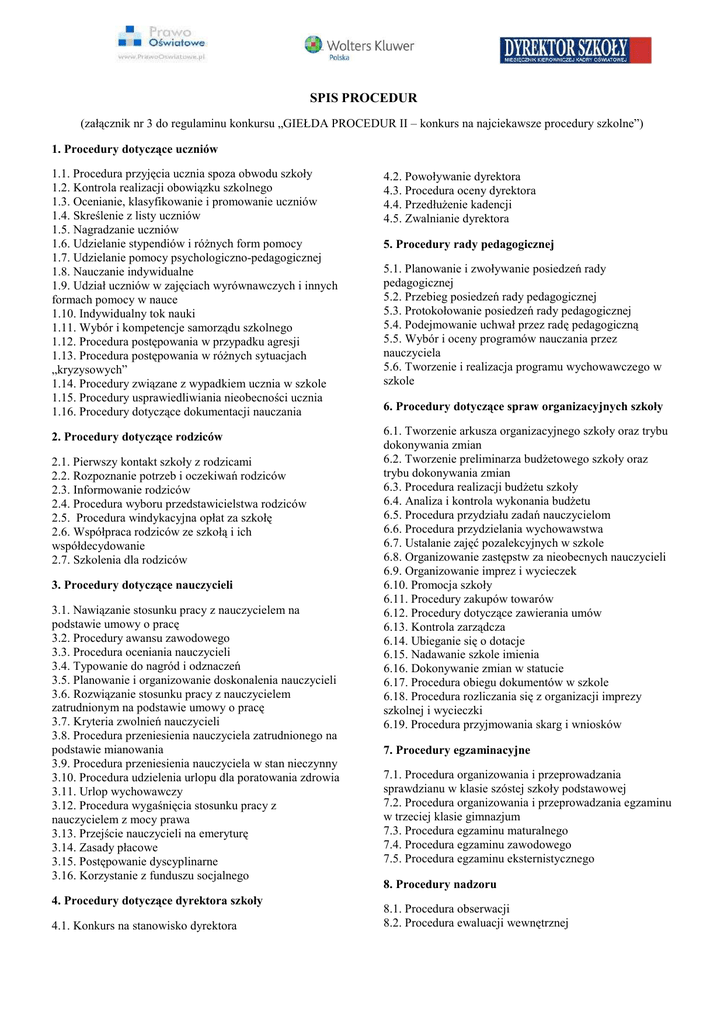SPIS PROCEDUR (załącznik nr 3 do regulaminu konkursu „GIEŁDA PROCEDUR II – konkurs na najciekawsze procedury szkolne”) 1. Procedury dotyczące uczniów 1.1. Procedura przyjęcia ucznia spoza obwodu szkoły 1.2. Kontrola realizacji obowiązku szkolnego 1.3. Ocenianie, klasyfikowanie i promowanie uczniów 1.4. Skreślenie z listy uczniów 1.5. Nagradzanie uczniów 1.6. Udzielanie stypendiów i różnych form pomocy 1.7. Udzielanie pomocy psychologiczno-pedagogicznej 1.8. Nauczanie indywidualne 1.9. Udział uczniów w zajęciach wyrównawczych i innych formach pomocy w nauce 1.10. Indywidualny tok nauki 1.11. Wybór i kompetencje samorządu szkolnego 1.12. Procedura postępowania w przypadku agresji 1.13. Procedura postępowania w różnych sytuacjach „kryzysowych” 1.14. Procedury związane z wypadkiem ucznia w szkole 1.15. Procedury usprawiedliwiania nieobecności ucznia 1.16. Procedury dotyczące dokumentacji nauczania 2. Procedury dotyczące rodziców 2.1. Pierwszy kontakt szkoły z rodzicami 2.2. Rozpoznanie potrzeb i oczekiwań rodziców 2.3. Informowanie rodziców 2.4. Procedura wyboru przedstawicielstwa rodziców 2.5. Procedura windykacyjna opłat za szkołę 2.6. Współpraca rodziców ze szkołą i ich współdecydowanie 2.7. Szkolenia dla rodziców 3. Procedury dotyczące nauczycieli 3.1. Nawiązanie stosunku pracy z nauczycielem na podstawie umowy o pracę 3.2. Procedury awansu zawodowego 3.3. Procedura oceniania nauczycieli 3.4. Typowanie do nagród i odznaczeń 3.5. Planowanie i organizowanie doskonalenia nauczycieli 3.6. Rozwiązanie stosunku pracy z nauczycielem zatrudnionym na podstawie umowy o pracę 3.7. Kryteria zwolnień nauczycieli 3.8. Procedura przeniesienia nauczyciela zatrudnionego na podstawie mianowania 3.9. Procedura przeniesienia nauczyciela w stan nieczynny 3.10. Procedura udzielenia urlopu dla poratowania zdrowia 3.11. Urlop wychowawczy 3.12. Procedura wygaśnięcia stosunku pracy z nauczycielem z mocy prawa 3.13. Przejście nauczycieli na emeryturę 3.14. Zasady płacowe 3.15. Postępowanie dyscyplinarne 3.16. Korzystanie z funduszu socjalnego 4. Procedury dotyczące dyrektora szkoły 4.1. Konkurs na stanowisko dyrektora 4.2. Powoływanie dyrektora 4.3. Procedura oceny dyrektora 4.4. Przedłużenie kadencji 4.5. Zwalnianie dyrektora 5. Procedury rady pedagogicznej 5.1. Planowanie i zwoływanie posiedzeń rady pedagogicznej 5.2. Przebieg posiedzeń rady pedagogicznej 5.3. Protokołowanie posiedzeń rady pedagogicznej 5.4. Podejmowanie uchwał przez radę pedagogiczną 5.5. Wybór i oceny programów nauczania przez nauczyciela 5.6. Tworzenie i realizacja programu wychowawczego w szkole 6. Procedury dotyczące spraw organizacyjnych szkoły 6.1. Tworzenie arkusza organizacyjnego szkoły oraz trybu dokonywania zmian 6.2. Tworzenie preliminarza budżetowego szkoły oraz trybu dokonywania zmian 6.3. Procedura realizacji budżetu szkoły 6.4. Analiza i kontrola wykonania budżetu 6.5. Procedura przydziału zadań nauczycielom 6.6. Procedura przydzielania wychowawstwa 6.7. Ustalanie zajęć pozalekcyjnych w szkole 6.8. Organizowanie zastępstw za nieobecnych nauczycieli 6.9. Organizowanie imprez i wycieczek 6.10. Promocja szkoły 6.11. Procedury zakupów towarów 6.12. Procedury dotyczące zawierania umów 6.13. Kontrola zarządcza 6.14. Ubieganie się o dotacje 6.15. Nadawanie szkole imienia 6.16. Dokonywanie zmian w statucie 6.17. Procedura obiegu dokumentów w szkole 6.18. Procedura rozliczania się z organizacji imprezy szkolnej i wycieczki 6.19. Procedura przyjmowania skarg i wniosków 7. Procedury egzaminacyjne 7.1. Procedura organizowania i przeprowadzania sprawdzianu w klasie szóstej szkoły podstawowej 7.2. Procedura organizowania i przeprowadzania egzaminu w trzeciej klasie gimnazjum 7.3. Procedura egzaminu maturalnego 7.4. Procedura egzaminu zawodowego 7.5. Procedura egzaminu eksternistycznego 8. Procedury nadzoru 8.1. Procedura obserwacji 8.2. Procedura ewaluacji wewnętrznej