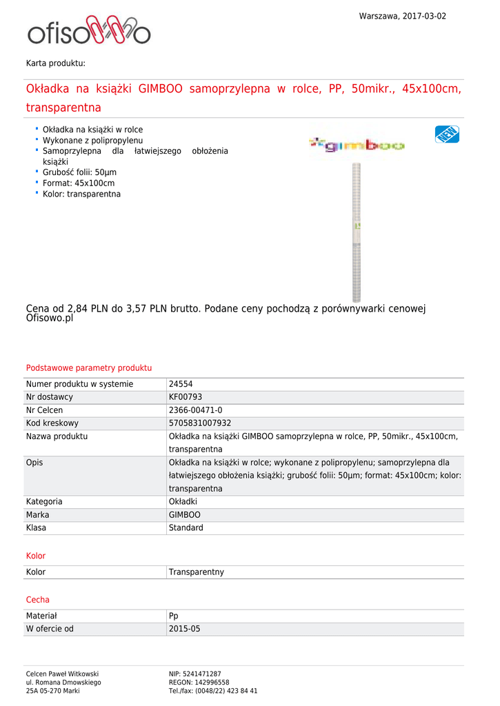 Warszawa, 2017-03-02 Karta produktu: Okładka na książki GIMBOO samoprzylepna w rolce, PP, 50mikr., 45x100cm, transparentna Okładka na książki w rolce Wykonane z polipropylenu Samoprzylepna dla łatwiejszego książki Grubość folii: 50μm Format: 45x100cm Kolor: transparentna obłożenia Cena od 2,84 PLN do 3,57 PLN brutto. Podane ceny pochodzą z porównywarki cenowej Ofisowo.pl Podstawowe parametry produktu Numer produktu w systemie 24554 Nr dostawcy KF00793 Nr Celcen 2366-00471-0 Kod kreskowy 5705831007932 Nazwa produktu Okładka na książki GIMBOO samoprzylepna w rolce, PP, 50mikr., 45x100cm, transparentna Opis Okładka na książki w rolce; wykonane z polipropylenu; samoprzylepna dla łatwiejszego obłożenia książki; grubość folii: 50μm; format: 45x100cm; kolor: transparentna Kategoria Okładki Marka GIMBOO Klasa Standard Kolor Kolor Transparentny Cecha Materiał Pp W ofercie od 2015-05 Celcen Paweł Witkowski ul. Romana Dmowskiego 25A 05-270 Marki NIP: 5241471287 REGON: 142996558 Tel./fax: (0048/22) 423 84 41 Warszawa, 2017-03-02 Karta katalogowa produktu cd. Okładka na książki GIMBOO samoprzylepna w rolce, PP, 50mikr., 45x100cm, transparentna Produkt Okładka Typ W rolce Wymiary Grubość (mm) 50μm Rozmiar 45x100cm Certyfikaty Hit Standard Nowy produkt w ofercie Standard Wspólny słownik zamówień CPV 30192000-1 Serdecznie zapraszamy do współpracy zespół. Ofisowo.pl Celcen Paweł Witkowski ul. Romana Dmowskiego 25A 05-270 Marki NIP: 5241471287 REGON: 142996558 Tel./fax: (0048/22) 423 84 41