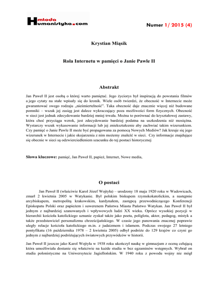 Numer 1/ 2015 (4) Krystian Miąsik Rola Internetu w pamięci o Janie Pawle II Abstrakt Jan Paweł II jest osobą o której warto pamiętać. Jego życiorys był inspiracją do powstania filmów a jego cytaty na stałe wpisały się do kronik. Wiele osób twierdzi, że obecność w Internecie może gwarantować swego rodzaju „nieśmiertelność”. Taka obecność daje znacznie więcej niż budowane pomniki – wszak jej zasięg jest dalece wykraczający poza możliwości form fizycznych. Obecność w sieci jest jednak zdecydowanie bardziej mniej trwała. Można to porównać do kryształowej zastawy, która choć przyciąga wzrok, jest zdecydowanie bardziej podatna na uszkodzenia niż mosiężna. Wystarczy wszak wykasowanie informacji lub jej zniekształcenie aby zachwiać takim wizerunkiem. Czy pamięć o Janie Pawle II może być propagowana za pomocą Nowych Mediów? Jak kreuje się jego wizerunek w Internecie i jakie skojarzenia z nim możemy znaleźć w sieci. Czy informacje znajdujące się obecnie w sieci są odzwierciedleniem szacunku do tej postaci historycznej Słowa kluczowe: pamięć, Jan Paweł II, papież, Internet, Nowe media, O postaci Jan Paweł II (właściwie Karol Józef Wojtyła) – urodzony 18 maja 1920 roku w Wadowicach, zmarł 2 kwietnia 2005 w Watykanie. Był polskim biskupem rzymskokatolickim, a następnie arcybiskupem, metropolitą krakowskim, kardynałem, zastępcą przewodniczącego Konferencji Episkopatu Polski oraz papieżem i suwerenem Państwa Miasta Państwo Watykan. Jan Paweł II był jednym z najbardziej szanowanych i wpływowych ludzi XX wieku. Oprócz wysokiej pozycji w hierarchii kościoła katolickiego uznanie zyskał także jako poeta, poliglota, aktor, pedagog, mistyk a także przedstawiciel personalizmu chrześcijańskiego. W czasie jego panowania znacznej poprawie uległy relacje kościoła katolickiego m.in. z judaizmem i islamem. Podczas swojego 27 letniego pontyfikatu (16 października 1978 – 2 kwietnia 2005) odbył podróże do 129 krajów co czyni go jednym z najbardziej podróżujących światowych przywódców w historii. Jan Paweł II jeszcze jako Karol Wojtyła w 1938 roku ukończył naukę w gimnazjum z oceną celującą która umożliwiała dostanie się właściwie na każde studia w bez egzaminów wstępnych. Wybrał on studia polonistyczne na Uniwersytecie Jagiellońskim. W 1940 roku z powodu wojny nie mógł Rola Internetu w pamięci o Janie Pawle II kontynuować nauki i podjął pracę fizyczną. W 1941 roku wraz z przyjaciółmi założył „Teatr rapsodyczny” gdzie w tym samym roku wystawił swoje pierwsze przedstawienie. W 1942 roku wybierając ponowieni studia – tym razem teologiczne, zrezygnował z teatru. Wstąpił do Metrepolitalnego Seminarium Duchownego w Krakowie gdzie w latach 1945-1946 pracował w roli asystenta. W tym okresie dał się także poznać jako poeta i napisał swój pierwszy tomik wierszy „renesansowy psałterz” (wydani dopiero w 1999 roku). Tworzył poezję metafizyczną. W 1946 roku został wyświecony na księdza a dwa lata później ukończył studia na Papieskim Uniwersytecie Świętego Tomasza z Akwinu w Rzymie. W tym samym roku otrzymał tytuł doktora za dysertację pod tytułem „Problem wiary u św. Jana od Krzyża”. Na potrzeby przygotowania rozprawy nauczył się języka hiszpańskiego. Okazało się to niezbędne aby czytać testy mistyka w oryginale. Po powrocie do Polski został skierowany do pracy w parafii Wniebowzięcia Najświętszej Maryi Panny w Nieowici gdzie pełnił rolę wikariusza i katechety. W 1951 roku został skierowany na urlop którego celem było ukończenie pracy habilitacyjnej. Mimo iż jego praca został przyjęta przez rade wydziału teologicznego UJ to habilitacji nie uzyskał z powodu odmowy Ministerstwa Oświaty. W 9158 roku w katedrze na Wawelu został konsekrowany na biskupa. Zgodnie ze zwyczajem biskupim przyjął hasło przewodnie swojej posługi – Totus Tuus (łac. Cały Twój). W 1964 roku został mianowany arcybiskupem i metrpolitą krakowskim a podczas konsystorza z 1967 został nominowany kardynałem. 16 października 1978 roku na zwołanym po śmierci papieża Jana Pawła I, w ósmym losowaniu podczas drugiego konklawe został wybrany na papieża i przybrał imię Jan Paweł II. Podczas swojego pontyfikatu uważał iż rolą nadrzędną są pielgrzymki. Odbywał bardzo wiele podróży zagranicznych. Został nazwany papieżem-pielgrzymem. Wielokrotnie odwiedzał również Polskę, targana licznymi konfliktami politycznymi i klasowymi. Za każdym razem jednoczył tłumy i dawał ludziom nadzieje na rychłe zmiany. Zdaniem historyków pielgrzymki Jana Pawła II i jego nieskrywane poparcie dla niezależnych i wolnych związków zawodowych przyczyniły się do upadku komunizmu w Europie. Dzięki jego staraniom w 1990 roku Stolica Apostolska nawiązała stosunki dyplomatyczne z Federacją Rosyjską. Jan Paweł II był także częstym gościem i prelegentem na Zgromadzeniach Ogólnych Narodów Zjednoczonych gdzie apelował o wolność i równość na świecie. Ważnym celem papieża Polaka okazało się wprowadzenie kościoła katolickiego w nowe tysiąclecie a tuż przed obchodami tegoż Roku Jubileuszowego odbył pielgrzymkę do Ziemi Świętej gdzie modlił się m.in. przy ścianie płaczu w Jerozolimie. W ostatnich latach pontyfikatu znacznie dokuczała mu jego przewlekła i postępująca choroba – choroba Parkinsona. Jan Paweł II nie poddawał się i mimo licznych spekulacji nie zamierzał odchodzić ze stanowiska. Nagłe pogorszenie stanu zdrowia 1 lutego 2015 roku spowodowało, że wiele czasu spędził w szpitalu. Zmarł 2 kwietnia 2005 roku w wyniku wstrząsu septycznego. Został beatyfikowany 1 maja 2011 roku a następnie kanonizowany 27 kwietnia 2014 roku w Niedzielą Miłosierdzia Bożego. 2 Rola Internetu w pamięci o Janie Pawle II Rola w społeczeństwie W tym artykule postaram się rozpoznać jak wygląda pamięć o tak wiel