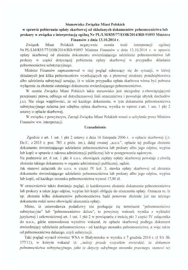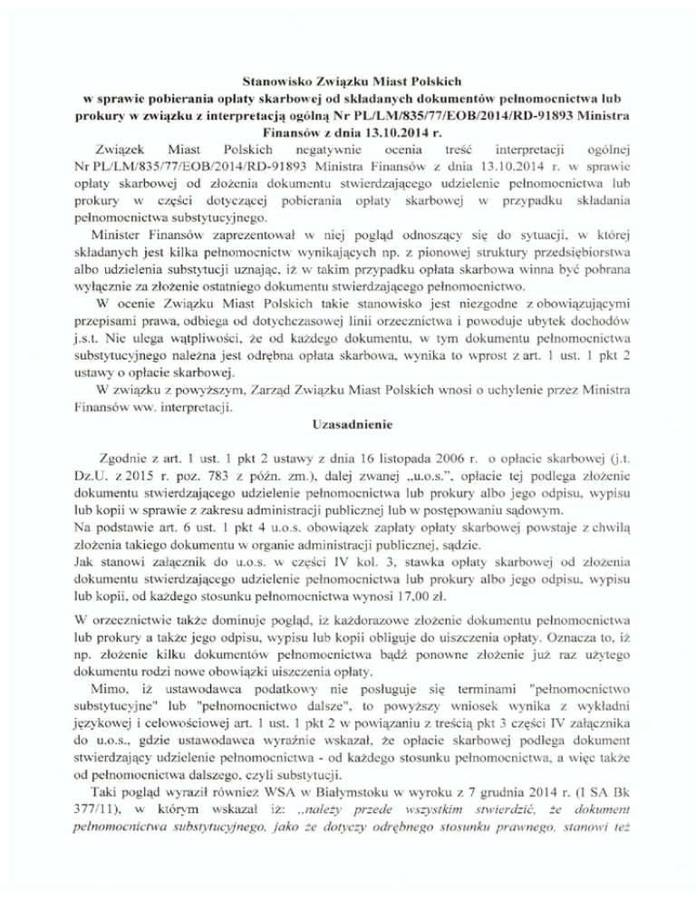 Stanowisko Związku Miast Polskich w sprawie pobierania opłaty skarbowej od składanych dokumentów pełnomocnictwa łub prokury w związku z interpretacją ogólną Nr PL/LM/835/77/EOB/2014/RD-91893 Ministra Finansów z dnia 13.10.2014 r. Związek Miast Polskich negatywnie ocenia treść interpretacji ogólnej NrPL/LM/835/77/EOB/2014/RD-91893 Ministra Finansów z dnia 13.10.2014 r. w sprawie opłaty skarbowej od złożenia dokumentu stwierdzającego udzielenie pełnomocnictwa łub prokury w części dotyczącej pobierania opłaty skarbowej w przypadku składania pełnomocnictwa substytucyjnego. Minister Finansów zaprezentował w niej pogląd odnoszący się do sytuacji, w której składanych jest kilka pełnomocnictw wynikających np. z pionowej struktury przedsiębiorstwa albo udzielenia subst>tucji uznając, iż w takim przypadku opłata skarbowa winna być pobrana wyłącznie za złożenie ostatniego dokumentu stwierdzającego pełnomocnictwo. W ocenie Związku Miast Polskich takie stanowisko jest niezgodne z obowiązującymi przepisami prawa, odbiega od dotychczasowej łinii orzecznictwa i powoduje ubytek dochodów j.s.t. Nie ulega wątpliwości, że od każdego dokumentu, w tym dokumentu pełnomocnictwa substytucyjnego należna jest odrębna opłata skarbowa, wynika to wprost z art. ł ust. ł pkt 2 ustawy o opłacie skarbowej. W związku z powyższym. Zarząd Związku Miast Polskich wnosi o uchylenie przez Ministra Finansów ww. interpretacji. Uzasadnienie Zgodnie z art. ł ust. ł pkt 2 ustawy z dnia 16 listopada 2006 r. o opłacie skarbowej (j.t. Dz.U. z 2015 r. poz. 783 z późn. zm.), dalej zwanej „u.o.s.", opłacie tej podlega złożenie dokumentu stwierdzającego udzielenie pełnomocnictwa łub prokury albo jego odpisu, wypisu łub kopii w sprawie z zakresu administracji publicznej łub w postępowaniu sądowym. Na podstawie art. 6 ust. ł pkt 4 u.o.s. obowiązek zapłaty opłaty skarbowej powstaje z chwiłą złożenia takiego dokumentu w organie administracji publicznej, sądzie. Jak stanowi załącznik do u.o.s. w części IV kol. 3, stawka opłaty skarbowej od złożenia dokumentu stwierdzającego udzielenie pełnomocnictwa łub prokury albo jego odpisu, wypisu łub kopii, od każdego stosunku pełnomocnictwa wynosi 17,00 zł. W orzecznictwie także dominuje pogląd, iż każdorazowe złożenie dokumentu pełnomocnictwa łub prokury a także jego odpisu, wypisu łub kopii obliguje do uiszczenia opłaty. Oznacza to, iż np. złożenie kilku dokumentów pełnomocnictwa bądź ponowne złożenie już raz użytego dokumentu rodzi nowe obowiązki uiszczenia opłaty. Mimo, iż ustawodawca podatkowy nie posługuje się terminami "pełnomocnictwo substytucyjne" łub "pełnomocnictwo dalsze", to powyższy wniosek wynika z wykładni językowej i cełowościowej art. ł ust. ł pkt 2 w powiązaniu z treścią pkt 3 części IV załącznika do u.o.s., gdzie ustawodawca wyraźnie wskazał, że opłacie skarbowej podlega dokument stwierdzający udzielenie pełnomocnictwa - od każdego stosunku pełnomocnictwa, a więc także od pełnomocnictwa dalszego, czyli substytucji. Taki pogląd wyraził również WSA w Białymstoku w wyroku z 7 grudnia 2014 r. (I SA Bk 377/11), w którym wskazał iż: ,,należy przede wszystkim stwierdzić, że dokument pełnomocnictwa substytucyjnego. Jako że dotyczy odrębnego stosunku prawnego, stanowi też odrębny przedmiot opodatkowania opłatą skarbową (o iłe oczywiście zostanie złożony w sprawie z zakresu administracji publicznej łub w postępowaniu sądowym ". Stanowisko takie zawarte jest także w wyroku Naczelnego Sądu Administracyjnego z 18 lutego 2014 r. (II FSK 444/12). W sprawach sądowych czy administracyjnych dochodzi do ustanawiania tzw. pełnomocników substytucyjnych - ich działanie uwarunkowane jest udzieloną wcześniej zgodą mocodawcy na powołanie przez pełnomocnika głównego dalszych pełnomocników. Podjęcie działania przez pełnomocnika substytucyjnego wymaga złożenia do akt dokumentu pełnomocnictwa substytucyjnego wraz z pełnomocnictwem głównym powodując, iż opłata skarbowa jest należna za dwa złożone dokumenty, bowiem występują dwa stosunki prawne: łączące mocodawcę z pełnomocnikiem głównym oraz pełnomocnikiem substytucyjnym. Z niezrozumiałych względów Minister Finansów powołując się w przedmiotowej interpretacji na treści wyroków WSA w Białymstoku i NSA w Warszawie (o sygn. akt I SA/Bk 377/ł ł i I I FSK 444/12), wyciągnął odmienne wnioski. Wskazane orzeczenia prezentują jedynie pogląd, iż ustanowienie substytuta rodzi stosunek prawny między nim a mocodawcą, a nie pełnomocnikiem głównym, oraz że dokument pełnomocnictwa substytucyjnego, jako że dotyczy odrębnego stosunku prawnego, stanowi też odrębny (ale nie jedyny) przedmiot opodatkowania opłatą skarbową. Piaseczno, 22 stycznia 2016 r. \