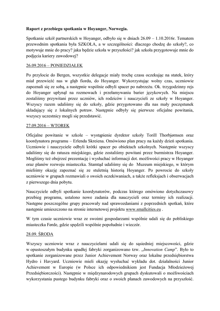 Raport z przebiegu spotkania w Hoyanger, Norwegia. Spotkanie szkół partnerskich w Hoyanger, odbyło się w dniach 26.09 – 1.10.2016r. Tematem przewodnim spotkania była SZKOŁA, a w szczególności: dlaczego chodzę do szkoły?, co motywuje mnie do pracy? jaka będzie szkoła w przyszłości? jak szkoła przygotowuje mnie do podjęcia kariery zawodowej? 26.09.2016 – PONIEDZIAŁEK Po przylocie do Bergen, wszystkie delegacje miały trochę czasu oczekując na statek, który miał przewieźć nas w głąb fiordu, do Hoyanger. Wykorzystując wolny czas, uczniowie zapoznali się ze sobą, a następnie wspólnie odbyli spacer po nabrzeżu. Ok. trzygodzinny rejs do Hoyanger upłynął na rozmowach i przełamywaniu barier językowych. Na miejscu zostaliśmy przywitani przez uczniów, ich rodziców i nauczycieli ze szkoły w Hoyanger. Wszyscy razem udaliśmy się do szkoły, gdzie przygotowano dla nas mały poczęstunek składający się z lokalnych potraw. Następnie odbyły się pierwsze oficjalne powitania, wszyscy uczestnicy mogli się przedstawić. 27.09.2016 – WTOREK Oficjalne powitanie w szkole – wystąpienie dyrektor szkoły Torill Thorbjørnsen oraz koordynatora programu – Erlenda Skreiena. Omówiono plan pracy na każdy dzień spotkania. Uczniowie i nauczyciele odbyli krótki spacer po obiektach szkolnych. Następnie wszyscy udaliśmy się do ratusza miejskiego, gdzie zostaliśmy powitani przez burmistrza Hoyanger. Mogliśmy też obejrzeć prezentację i wysłuchać informacji dot. możliwości pracy w Hoyanger oraz planów rozwoju miasteczka. Stamtąd udaliśmy się do Muzeum miejskiego, w którym mieliśmy okazję zapoznać się ze stuletnią historią Hoyanger. Po powrocie do szkoły uczniowie w grupach rozmawiali o swoich oczekiwaniach, a także refleksjach i obserwacjach z pierwszego dnia pobytu. Nauczyciele odbyli spotkanie koordynatorów, podczas którego omówiono dotychczasowy przebieg programu, ustalono nowe zadania dla nauczycieli oraz terminy ich realizacji. Następne poszczególne grupy pracowały nad sprawozdaniami z poprzednich spotkań, które następnie umieszczono na stronie internetowej projektu www.smallcities.eu . W tym czasie uczniowie wraz ze swoimi gospodarzami wspólnie udali się do pobliskiego miasteczka Førde, gdzie spędzili wspólnie popołudnie i wieczór. 28.09. ŚRODA Wszyscy uczniowie wraz z nauczycielami udali się do sąsiedniej miejscowości, gdzie w opustoszałym budynku upadłej fabryki zorganizowano tzw. „Innovation Camp”. Było to spotkanie zorganizowane przez Junior Achievement Norway oraz lokalne przedsiębiorstwa Hydro i Havyard. Uczniowie mieli okazję wysłuchać wykładu dot. działalności Junior Achievement w Europie (w Polsce ich odpowiednikiem jest Fundacja Młodzieżowej Przedsiębiorczości). Następnie w międzynarodowych grupach dyskutowali o możliwościach wykorzystania pustego budynku fabryki oraz o swoich planach zawodowych na przyszłość. Ich zadaniem było też stworzenie projektu wynalazku przy użyciu łyżki i plasteliny. Końcowym etapem była prezentacja efektów pracy każdej z grup, które były oceniane przez przedstawicieli Hydro i Havyard. Najlepsze pomysły zostały nagrodzone. W tym czasie nauczyciele uczestniczyli w warsztatach prowadzonych przez Knuta Roalda (z University College of Sogn&Fjordane) na temat roli szkoły i nauczycieli w przyszłości. Warsztaty składały się z wykładu i części praktycznej, podczas której nauczyciele dyskutowali różne kwestie w grupach międzynarodowych, dzieląc się swoimi obserwacjami i doświadczeniem. Warsztaty okazały się bardzo cennym doświadczeniem i stały się inspiracją do dalszych dyskusji. Wieczorem uczniowie spotkali się w szkole w Hoyanger, by wspólnie oglądać filmy. 29.09. – CZWARTEK Rano uczniowie i nauczycieli wzięli udział w lekcjach zgodnie z harmonogramem szkoły. Po południu, ze względu na deszczową pogodę odwołano planowaną wycieczkę w góry. W tym czasie uczniowie pracowali w grupach i wspólnie starali się znaleźć odpowiedź na pytania: Po co chodzę do szkoły? Dlaczego szkoła jest ważna? Co motywuje mnie do pracy? Ze swojej dyskusji sporządzili raporty i mini-prezentacje. W tym czasie nauczyciele kontynuowali dyskusję z dnia poprzedniego dot. roli nauczyciela w dzisiejszej szkole i sposobach motywowania uczniów do nauki. Wieczorem uczniowie przebywali u swoich gospodarzy. Nauczyciele odwiedzili sąsiednią wioskę Lavik, gdzie mogli odwiedzić warsztat kowalski oraz tradycyjny norweski kościół. 30.09. – PIĄTEK Dzień rozpoczął się od wysłuchania wykładu – prezentacji prowadzonej przez Kristine Kopperund Timberlid z organizacji Innovation Norway. Następnie uczniowie pracowali w grupach próbując odpowiedzieć na pytania: Jak najlepiej wykorzystać czas spędzony w szkole, by być dobrze przygotowanym do życia w Europie? Czy są jakieś różnice w podejściu do tematu w poszczególnych krajach? W tym czasie nauczyciele odwiedzili lokalny zakład produkujący felgi samochodowe dla znanych koncernów samochodowych. Po powrocie do szkoły wspólnie nauczyciele i uczniowie wysłuchali prezentacji wyników dyskusji uczniowskiej oraz jej krótkiego podsumowania przez K. Kopperud Timberlid. Po lunchu wszyscy spotkali się w Audytorium, by wspólnie podsumować cały tydzień pracy. Ze względu na deszczową pogodę odwołano planowaną wycieczkę w góry. Uczniowie spędzili ostatni wieczór w domach rodzinnych swoich gospodarzy. 1.10. – SOBOTA Wyjazd wczesny rankiem na lotnisko w Bergen i przylot do Gdańska.