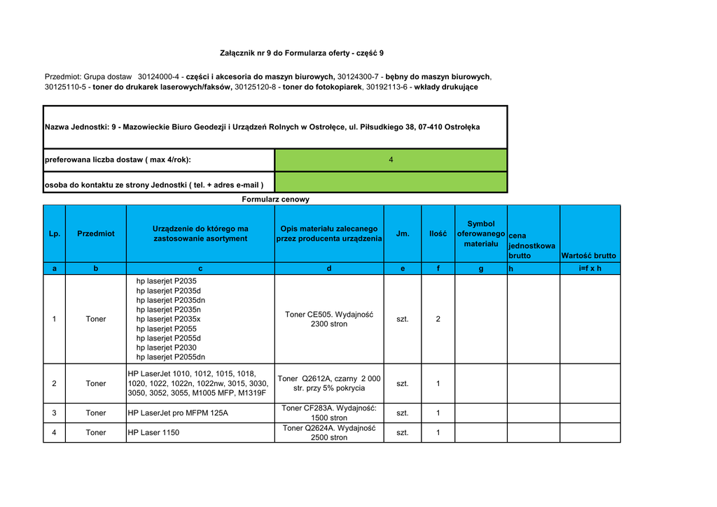 Za cznik nr 9 do Formularza oferty - cz 9 Przedmiot: Grupa dostaw 30124000-4 - cz ci i akcesoria do maszyn biurowych, 30124300-7 - bny do maszyn biurowych, 30125110-5 - toner do drukarek laserowych/faksów, 30125120-8 - toner do fotokopiarek, 30192113-6 - wk ady drukuj ce Nazwa Jednostki: 9 - Mazowieckie Biuro Geodezji i Urz dze Rolnych w Ostro ce, ul. Pi sudkiego 38, 07-410 Ostro ka preferowana liczba dostaw ( max 4/rok): 4 osoba do kontaktu ze strony Jednostki ( tel. + adres e-mail ) Formularz cenowy Lp. a Przedmiot Urz dzenie do którego ma zastosowanie asortyment b c hp laserjet P2035 hp laserjet P2035d hp laserjet P2035dn hp laserjet P2035n hp laserjet P2035x hp laserjet P2055 hp laserjet P2055d hp laserjet P2030 hp laserjet P2055dn 1 Toner 2 Toner HP LaserJet 1010, 1012, 1015, 1018, 1020, 1022, 1022n, 1022nw, 3015, 3030, 3050, 3052, 3055, M1005 MFP, M1319F 3 Toner HP LaserJet pro MFPM 125A 4 Toner HP Laser 1150 Opis materia u zalecanego przez producenta urz dzenia d Toner CE505. Wydajno 2300 stron Toner Q2612A, czarny 2 000 str. przy 5% pokrycia Toner CF283A. Wydajno : 1500 stron Toner Q2624A. Wydajno 2500 stron Jm. Ilo e f szt. 2 szt. 1 szt. 1 szt. 1 Symbol oferowanego cena materia u jednostkowa brutto Warto g h brutto i=f x h Tusz hp color copier :140,145,150,155,160,170,260,270 hp deskjet :1120c,1125c,1170cxi,1180c,710c,712c,7 20c,722c,810c,812,815c,830c,832c,880c, 882c,890c,895 hp officejet pro: 1170c,1170cse, 1170cxi,1175c,1175cse,1175cxi hp officejet:r40,r45,r60,r65,r80,t45,t45xi,t65,t 65xi hp psc 500, hp psc 500xi Tusz C 1823DE, kolor szt. 1 6 Tusz DeskJet 916c,DeskJet 920c DeskJet 930c, DeskJet 932c DeskJet 935c, DeskJet 940c DeskJet 940crv, DeskJet 950c DeskJet 952c, DeskJet 959c DeskJet 960c, DeskJet 960cse DeskJet 960cxi,DeskJet 970c DeskJet 970cse,DeskJet 970cxi DeskJet 980c,DeskJet 990cm, DeskJet 990cse, DeskJet 990cxi, DeskJet 995c, DeskJet 995ck DeskJet 1180, DeskJet 1220c, DeskJet 1220ps, DeskJet 1280 DeskJet 3810, DeskJet 3816, DeskJet 3820, DeskJet 3822, DeskJet 6120, DeskJet 6122,DeskJet 6127 DeskJet 9300 Tusz C6578 AE, kolor szt. 1 7 Tusz HP DJ 850/1600 szt. 1 8 Tusz HP Deskjet D2460 szt. 1 9 Tusz HP Officejet Pro 8620 szt. 1 10 Tusz HP Officejet Pro 8620 kpl. 1 11 Tusz HP Officejet 7110 szt. 1 5 Tusz 51645 AE, czarny 42 ml pokrycie oko o 830 str. Tusz C 9351 CE, Wydajno 200 stron Tusz CN 045A, Wydajno 2300 stron Tusz C2P43AE, Wydajno 1500 stron kolor: M+C+Y, czarny Tusz CN053AE, Kolor: czarny Wydajno : 1000 stron 12 Tusz HP Officejet 7110 13 Tusz HP Officejet 7110 14 Tusz HP Officejet 7110 15 Tusz Epson SC P600 16 Tusz Epson SC P600 17 Tusz Epson SC P600 18 Tusz Epson SC P600 19 Tusz Epson SC P600 20 Tusz 21 Tusz CN054AE, Kolor niebieski Wydajno 825 stron szt. 1 szt. 1 szt. 1 szt. 1 szt. 1 szt. 1 szt. 1 Tusz T7605, Kolor jasny cyjan Wydajno 2400 stron szt. 1 Epson SC P600 Tusz T7606, Kolor : jasna magenta Wydajno 2800 stron szt. 1 Tusz Epson SC P600 Tusz T7607, Kolor: jasny czarny Wydajno 10000 stron szt. 1 22 Tusz Epson SC P600 szt. 1 23 Tusz Epson SC P600 szt. 1 24 Tusz HP DesignJet T770 szt. 2 25 Tusz HP DesignJet T770 Tusz C9371A, Kolor niebieski szt. 2 26 Tusz HP DesignJet T770 Tusz C9372A, Kolor czerwony szt. 3 27 Tusz HP DesignJet T770 szt. 2 28 Tusz HP DesignJet T770 szt. 4 29 Tusz Ploter HP Designjet 500ps Tusz C9374A, Kolor szary Tusz C9403A, Kolor czarny matowy Tusz C4844A, Kolor czarny Wydajno 1750 stron szt. 1 Tusz CN055AE, Kolor czerwony Wydajno 825 stron Tusz CN056AE, Kolor ty Wydajno 825 stron Tusz T7601, Kolor czarny Tusz T7602, kolor cyjan Wydajno 2200 stron Tusz T7603, kolor magenta Wydajno 1400 stron Tusz T7604, Kolor ty : Wydajno 825 stron Tusz T7608, Kolor: czarny matowy Wydajno 1100 stron Tusz T7609, Kolor bardzo jasny czarny Wydajno 12000 stron Tusz C9370A, Kolor czarny foto 30 Tusz Ploter HP Designjet 500ps Tusz C4911A, Kolor niebieski szt. 1 31 Tusz Ploter HP Designjet 500ps Tusz C4912A, Kolor czerwony szt. 1 32 Tusz Ploter HP Designjet 500ps Tusz C4913A, Kolor szt. 1 33 owica Ploter HP Designjet 500ps owica C4810A, Kolor czarny Wydajno 16000 stron szt. 1 34 owica Ploter HP Designjet 500ps owica C4811A, Kolor Cyan Wydajno 24000 stron szt. 1 35 owica Ploter HP Designjet 500ps szt. 1 36 owica Ploter HP Designjet 500ps szt. 1 szt. 2 szt. 1 szt. 1 37 Toner KYOCERA - MITA KM 1620/2020/2050/1650 38 Tusz Urz dzenie wielofunkcyjne HP DeskJet Ink Advantage 2515 All in One. 39 Tusz Urz dzenie wielofunkcyjne HP DeskJet Ink Advantage 2515 All in One. 40 Toner 42 Toner C-EXV21 Black, Wydajno 26000 kopii szt. 2 Canon iRC2380i Toner C-EXV21 Yellow, Wydajno 14000 kopii szt. 3 Canon iRC2380i Toner CEXV21 Magenta, Wydajno 14000 kopii szt. 2 Canon iRC2380i Toner CEXV21 Cyan, Wydajno 14000 kopii szt. 2 Toner 43 Toner owica C4812A, Kolor magenta Wydajno 24000 stron owica C4813A, Kolor yellow Wydajno 24000 stron Toner Tk-410, czarny, wydajno : 15 000 stron HP tusz CZ101AE (black) nr 650 . Wydajno 360 stron, Pojemno 6.5 ml ,Kolor Czarny HP Tusz CZ102AE (cyan, magenta, yellow) nr 650, wydajno 200 str. A4 (wg normy producenta, wydruk ci y) kolory w pojemniku cyan magenta yellow Canon iRC2380i Toner 41 ty Toner do urzadzenia faksowego FAT 411 E, czarny, Wydajno 2.000 stron A4 przy 5% pokryciu szt. 1 44 Toner Panasonic KX-MB 2000, KX-MB 2010, KX-MB 2025, KX-MB 2030 45 ben Panasonic KX-MB 2000, KX-MB 2010, KX-MB 2025, KX-MB 2030 ben do urzadzenia faksowego FAD 412 E, Wydajno do 6000 kopii szt. 1 Canon FAX-JX210P Tusz PG-40 , kolor czarny szt. 1 46 Tusz razem