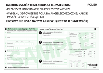 POLISH JAK KORZYSTAĆ Z TEGO ARKUSZA TŁUMACZENIA: • PRZECZYTAJ INFORMACJĘ NA PONIŻSZYM WZORZE • WYPEŁNIJ ODPOWIEDNIE POLA NA ANGIELSKOJĘZYCZNEJ KARCIE PASAŻERA WYJEŻDŻAJĄCEGO PROSIMY NIE PISAĆ NA TYM ARKUSZU (JEST TO JEDYNIE WZÓR) Karta pasażera wyjeżdżającego • Australia Imiona I WYPEŁNIĆ D LUB E LUB F E L P M A S PROSIMY WYPEŁNIĆ PO ANGIELSKU NIEBIESKIM LUB CZARNYM DŁUGOPISEM Nazwisko Dzień Miesiąc Rok Data urodzenia PROSIMY WSTAWIĆ D Osoba wyjeżdżająca po odwiedzinach lub pobycie czasowym Kraj zamieszkania E Mieszkaniec Australii wyjeżdżający czasowo Podaj, gdzie spędziłeś większość czasu w Australii W którym stanie mieszkasz? Kraj, w którym spędzisz większość czasu za granicą Numer paszportu Planowany okres pobytu za granicą Narodowość, jak w paszporcie Lat Miesięcy Dni LUB Numer lotu lub nazwa statku Kraj, w którym zakończysz ten lot lub podróż statkiem F Jaki jest wykonywany przez ciebie zawód? PROSIMY WYPEŁNIĆ OBIE STRONY TEJ KARTY Mieszkaniec Australii wyjeżdżający na stałe Kraj przyszłego zamieszkania NSW SA NT Vic WA ACT Qld Tas Inne NSW SA NT Vic WA ACT Qld Tas Inne Główny cel podróży (zaznacz tylko jeden) Zjazd/konferencja Praca 1 Biznes Edukacja 2 Wystawa Odwiedziny przyjaciół lub rodziny 3 Wakacje Inny 4 5 6 7 8 W którym stanie mieszkałeś? NSW SA NT Vic WA ACT Qld Tas Inne ODWRÓĆ KARTĘ NA DRUGĄ STRONĘ Polish E L P M A S PROSIMY ODPOWIEDZIEĆ WPISUJĄC Czy wywozisz z Australii 10.000 dolarów australijskich lub więcej w walucie australijskiej lub ekwiwalent w obcej walucie? Jeżeli odpowiedziałeś „Tak”, musisz wypełnić Raport Przekroczenia Granicy – Gotówka (Cross Border Movement – Physical Cash Report) dla AUD$10,000 lub więcej i przedstawić go wraz z tą kartą. Tak Nie Uwaga: Jeżeli zostaniesz poproszony przez celnika lub policjanta, musisz zgłosić posiadanie swoich czeków podróżnych, czeków, przekazów pieniężnych lub innych dokumentów zbywalnych jakiejkolwiek wartości. OŚWIADCZENIE Podane przeze mnie informacje są prawdziwe, poprawne i kompletne. TWÓJ PODPIS ✍ Dzień Miesiąc Nie pozostawiaj swojego funduszu emerytalnego w Australii Jeśli pracowałeś w Australii na czasowej wizie pobytowej (z wyjątkiem pod-klas 405 i 410), możesz po wyjeździe z Australii i wygaśnięciu wizy ubiegać się o wypłatę swojego funduszu emerytalnego. Najprostszym sposobem jest bezpłatne wypełnienie elektronicznego formularza podaniowego Australijskiego Urzędu Skarbowego (ATO), który również potwierdza twój status imigracyjny. Ewentualnie możesz wystąpić bezpośrednio do swojego funduszu. Będziesz musiał przedstawić dowód opuszczenia Australii. Jeśli ubiegasz się o: •ponad AUD$5,000 środków z funduszu emerytalnego, wymagane jest Certification of Immigration Status (Zaświadczenie o Statusie Imigracyjnym) z Departamentu Imigracji i Ochrony Granicznej (co obecnie wiąże się z opłatą), lub •AUD$5,000 lub mniej z funduszu emerytalnego, wymagana jest poświadczona kopia stempla paszportowego z portem i datą wyjazdu, oraz kopia właściwej wizy, która utraciła ważność lub została anulowana. Musisz poprosić o stempel paszportowy przy wyjeździe z Australii, ponieważ Department of Immigration and Border Protection (Departament Imigracji i Ochrony Granicznej) nie wystawia już automatycznie tych stempli wyjazdowych. Ewentualnie będziesz musiał uzyskać Certification of Immigration Status. Aby uzyskać dostęp do elektronicznego formularza podaniowego oraz dodatkowych informacji, odwiedź stronę ato.gov.au/departaustralia Możesz również znaleźć zagubiony lub przechowywany w ATO fundusz emerytalny, odwiedzając ato.gov.au/superseeker Rok Informacje, o które zwracamy się w tym formularzu potrzebne są w celach zarządzania australijskimi przepisami imigracyjnymi, celnymi, statystycznymi, zdrowotnymi, dotyczącymi kwarantanny, flory i fauny oraz waluty. Ich zbieranie zgodne jest z ustawodawstwem. Zostaną one udostępnione jedynie agencjom zajmującym się tymi sprawami oraz uprawnionym lub zobowiązanym do ich otrzymywania zgodnie z prawem australijskim. Form 1442i Privacy notice (Oświadczenie o prywatności) dostępne jest na stronie internetowej Departamentu www.border.gov.au/allforms/ UPEWNIJ SIĘ, ŻE WYPEŁNIŁEŚ OBYDWIE STRONY TEJ KARTY. WRĘCZ TĘ KARTĘ PRZY WYJEŹDZIE RAZEM ZE SWOJĄ KARTĄ POKŁADOWĄ I PASZPORTEM. 06151609 © Commonwealth of Australia 2015 16 POL (Design date 06/15)