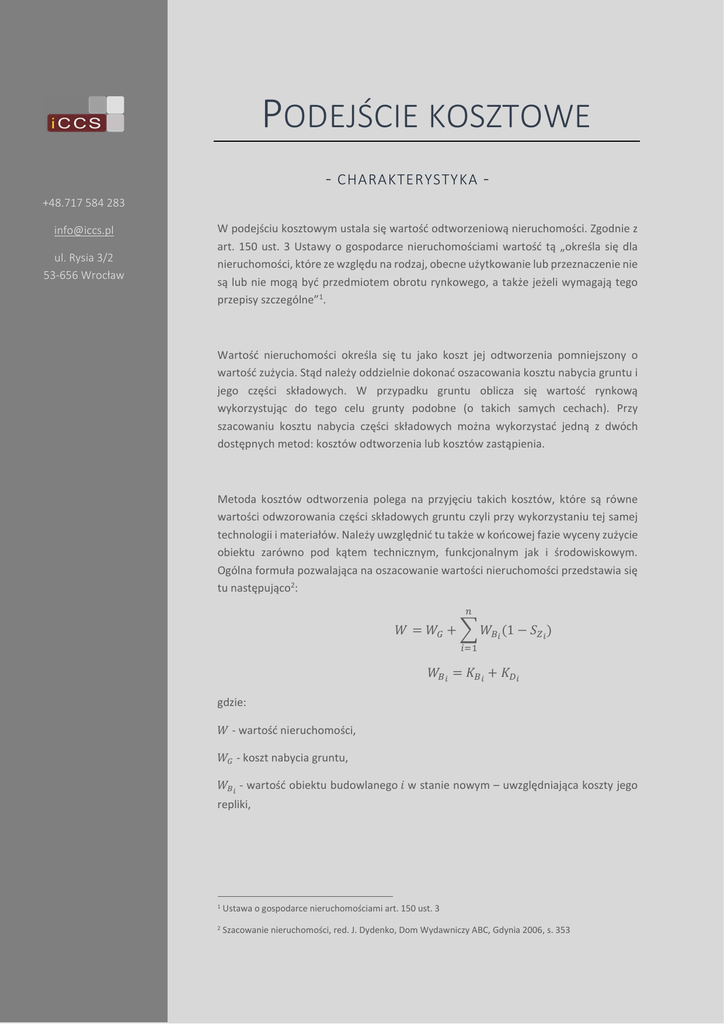 PODEJŚCIE KOSZTOWE - CHARAKTERYSTYKA +48.717 584 283 [email protected] ul. Rysia 3/2 53-656 Wrocław W podejściu kosztowym ustala się wartość odtworzeniową nieruchomości. Zgodnie z art. 150 ust. 3 Ustawy o gospodarce nieruchomościami wartość tą „określa się dla nieruchomości, które ze względu na rodzaj, obecne użytkowanie lub przeznaczenie nie są lub nie mogą być przedmiotem obrotu rynkowego, a także jeżeli wymagają tego przepisy szczególne”1. Wartość nieruchomości określa się tu jako koszt jej odtworzenia pomniejszony o wartość zużycia. Stąd należy oddzielnie dokonać oszacowania kosztu nabycia gruntu i jego części składowych. W przypadku gruntu oblicza się wartość rynkową wykorzystując do tego celu grunty podobne (o takich samych cechach). Przy szacowaniu kosztu nabycia części składowych można wykorzystać jedną z dwóch dostępnych metod: kosztów odtworzenia lub kosztów zastąpienia. Metoda kosztów odtworzenia polega na przyjęciu takich kosztów, które są równe wartości odwzorowania części składowych gruntu czyli przy wykorzystaniu tej samej technologii i materiałów. Należy uwzględnić tu także w końcowej fazie wyceny zużycie obiektu zarówno pod kątem technicznym, funkcjonalnym jak i środowiskowym. Ogólna formuła pozwalająca na oszacowanie wartości nieruchomości przedstawia się tu następująco2: 1 gdzie: - wartość nieruchomości, - koszt nabycia gruntu, - wartość obiektu budowlanego w stanie nowym – uwzględniająca koszty jego repliki, 1 Ustawa o gospodarce nieruchomościami art. 150 ust. 3 2 Szacowanie nieruchomości, red. J. Dydenko, Dom Wydawniczy ABC, Gdynia 2006, s. 353 - koszty bezpośrednie wykonania -tego obiektu budowlanego uwzględniające aktualne dla daty wyceny i podstaw opracowania zasady ustalania składników wartości kosztorysowej robót budowlanych, - koszty inwestycyjne (dodatkowe) dla obiektu , - stopień zużycia obiektu , wyrażony w postaci dziesiętnej, - oznaczenie (kolejny numer) obiektu wchodzącego w skład nieruchomości. W skład kosztów odtworzenia obiektu budowlanego wchodzą koszty bezpośrednie takie jak koszt robót budowlanych czy materiałów oraz koszty dodatkowe związane z opracowaniem dokumentacji, nadzorem budowlanym, przygotowaniem terenu i inne. W przypadku metody kosztów zastąpienia odtwarzane obiekty budowlane muszą również mieć taką samą funkcję i podobne parametry użytkowe co obiekt wyceniany, ale szacuje się je przy zastosowaniu aktualnie wykorzystywanej technologii i materiałów. Koniecznie jest tu uzasadnienie wyboru tej właśnie metody a więc wskazanie z jakich przyczyn nie dokonuje się dokładnego odwzorowania wycenianej nieruchomości. Nowy obiekt powinien nie tylko być nowocześniejszy od obecnego pod względem technologii ale także wymagań użytkowych. Formuły stosowane w przypadku omawianej metody są tożsame do formuł wykorzystywanych w metodzie kosztów odtworzenia. Podejście kosztowe w ramach stosowanych metod wyróżnia obecnie trzy techniki: • szczegółową, • elementów scalonych, • wskaźnikową. Ich charakterystyki przedstawia sumarycznie tabela nr 1. Technika szczegółowa jak sama jej nazwa wskazuje wymaga bardzo szczegółowej inwentaryzacji obiektu, na podstawie której można ustalić rodzaj i ilość robót na nim przeprowadzonych. Rzeczoznawca majątkowy bazuje tu więc na dokumentach zakładając, iż nie zawierają one żadnych znaczących błędów. Informacje brakujące musi natomiast przyjąć arbitralnie, w wysokości standardowej dla danego typu obiektu. Technika elementów scalonych wykorzystuje możliwość pewnego powiązania ze sobą różnych elementów nieruchomości. Do wyceny wykorzystuje się tu (podobnie jak w przypadku techniki szczegółowej) specjalistyczne katalogi ze wskaźnikami cen3. Mimo stosowanych uproszczeń, technika elementów scalonych również wymaga dogłębnej analizy dokumentów technicznych nieruchomości wycenianej i dokonania jej inwentaryzacji. Tabela 1. Sposoby szacowania kosztów w poszczególnych technikach podejścia kosztowego Technika Sposób szacowania kosztów odtworzenia/zastąpienia szczegółowa elementów scalonych wskaźnikowa suma iloczynów ilości niezbędnych robót budowlanych i ich cen jednostkowych suma iloczynów ilości scalonych elementów robót budowlanych i ich cen scalonych suma iloczynów ceny wskaźnikowej i liczby jednostek odniesienia, dla których ta cena została ustalona Formuła4 ∗ ∗ ∗ gdzie: - koszty wykonania obiektu, - oznaczenie kolejnych robót budowlanych do wykonania, - ilość roboty „ ” w jednostkach technicznych, - cena jednostkowa roboty w zł/jednostkę odniesienia, - oznaczenie kolejnego elementu scalonego, - ilość robót elementu „ ” w przyjętych jednostkach, - cena jednostkowa w zł/jedn. elementu scalonego, - wielkość wskaźnika na jednostkę odniesienia dla danego obiektu, - cena jednostkowa wskaźnika. Źródło: opracowanie własne na podstawie Szacowanie nieruchomości, red. J. Dydenko, Dom Wydawniczy ABC, Gdynia 2006, s. 296. 3 Katalogi o których mowa są ogólnodostępne na rynku i stale aktualizowane. Należą do nich między innymi: − „Zbiór jednostkowych wskaźników cenowych z zakresu budownictwa ogólnego, mieszkaniowego oraz przemysłowego na roboty inwestycyjne” (wyd. Bistyp - Consulting sp. z o.o.), − „Informacyjny zestaw Wskaźników Nakładów na obiekty budowlane” (wyd. Orgbud Serwis), − „Biuletyn cen robót” (wyd. Sekocenbud), − „Scalone normatywy do wyceny budynków i budowli” (wyd. Wacetob). 4 Szacowanie nieruchomości, red. J. Dydenko, Dom Wydawniczy ABC, Gdynia 2006, ss. 355 - 357 Technika wskaźnikowa wymaga ustalenia pewnej jednostki technicznej nieruchomości jako podstawy obliczeń. Może nią być na przykład kubatura budynku, powierzchnia użytkowa lub całkowita. Następnie odszukuje się cenę jednostkową dla konkretnej jednostki tech