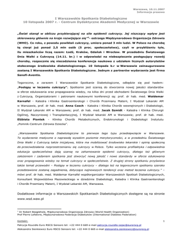 Warszawa, 10.11.2007 Informacja prasowa I Warszawskie Spotkania Diabetologiczne 10 listopada 2007 r. - Centrum Dydaktyczne Akademii Medycznej w Warszawie „Świat stanął w obliczu przybierającej na sile epidemii cukrzycy. Jej niszczący wpływ jest skierowany głównie na kraje rozwijające się”1- ostrzega Międzynarodowa Organizacja Zdrowia (WHO). Co roku, z powodu powikłań cukrzycy, umiera ponad 3 mln ludzi. W Polsce na chorobę tę cierpi już ponad 2,5 mln osób (5 proc. społeczeństwa), czyli w przybliżeniu tyle, ilu mieszkańców liczą razem: Łodź, Kraków, Gdańsk i Wrocław. W przededniu Światowego Dnia Walki z Cukrzycą (14.11. br.) i w odpowiedzi na niebezpiecznie postępujący rozwój choroby, rozpocznie się niecodzienna konferencja naukowa z udziałem licznych autorytetów stołecznego środowiska diabetologicznego. 10 listopada b.r w Warszawie zainaugurowane zostaną I Warszawskie Spotkania Diabetologiczne. Jednym z partnerów wydarzenia jest firma Sanofi-Aventis. Tegoroczne, a zarazem I Warszawskie Spotkanie Diabetologiczne, odbędzie się pod hasłem: „Postępy w leczeniu cukrzycy”. Spotkanie jest szansą do stworzenia nowej jakości standardów w sferze edukowania oraz propagowania wiedzy, na kilka dni przed obchodami Światowego Dnia Walki z Cukrzycą. Organizatorami i patronami naukowymi konferencji są: prof. dr hab. med. Waldemar Karnafel - Katedra i Klinika Gastroenterologii i Chorób Przemiany Materii, I Wydział Lekarski AM w Warszawie, prof. dr hab. med. Anna Czech - Katedra i Klinika Chorób wewnętrznych i Diabetologii, II Wydział Lekarski AM w Warszawie; prof. dr hab. med. Jacek Szmidt - Katedra i Klinika Chirurgii Ogólnej, Naczyniowej i Transplantacyjnej, I Wydział lekarski AM w Warszawie; prof. dr hab. med. Elżbieta Piontek - Klinika Chorób Metabolicznych, Endokrynologii i Diabetologii Instytutu „Pomnik-Centrum Zdrowia Dziecka”. „Warszawskie Spotkania Diabetologiczne to pierwsze tego typu przedsięwzięcie w Warszawie. To wydarzenie medyczne o naprawdę wysokim poziomie merytoryczności, a w przededniu Światowego Dnia Walki z Cukrzycą także inicjatywa, która ma mobilizować środowisko lekarskie i opinię społeczną do przeciwdziałania rozprzestrzenianiu się cukrzycy w Polsce. Tylko wczesna profilaktyka i odpowiednia edukacja społeczeństwa dają szansę na zahamowanie epidemii cukrzycy, dlatego też głównym założeniem i zadaniem spotkania jest stworzyć nową jakość i nowe standardy w sferze edukowania oraz propagowania wiedzy na temat cukrzycy w społeczeństwie. Z drugiej strony spotkaniu przyświeca także temat przewodni – Postępy w leczeniu cukrzycy – dlatego też na tegorocznym spotkaniu szeroko przedstawione zostaną zagadnienia, dotyczące najnowszych tendencji oraz metod leczenia cukrzycy.” – mówi prof. dr hab. med. Waldemar Karnafel współorganizator Warszawskich Spotkań Diabetologicznych, Konsultant Województwa Mazowieckiego w dziedzinie Diabetologii, Katedra i Klinika Gastroenterologii i Chorób Przemiany Materii, I Wydział Lekarski AM, Warszawa. Dodatkowe informacje o Warszawskich Spotkaniach Diabetologicznych dostępne są na stronie www.wsd.waw.pl 1 Dr Robert Beaglehole, Międzynarodowa Organizacja Zdrowia (World Health Organization) Prof Pierre Lefebvre, Międzynarodowa Federacja Diabetyków (International Diabetes Federation) Kontakt: Patrycja Rzucidło Euro RSCG Sensors tel: +22 444 0 669 e-mail [email protected] Aleksandra Sienkiewicz Euro RSCG Sensors tel: +22 444 0 665 e-mail [email protected] 1 Warszawa, 10.11.2007 Informacja prasowa I Warszawskie Spotkania Diabetologiczne 10 listopada 2007 r. - Centrum Dydaktyczne Akademii Medycznej w Warszawie PROGRAM I WARSZAWSKICH SPOTKAŃ DIABETOLOGICZNYCH Centrum Dydaktyczne Akademii Medycznej w Warszawie ul. Księcia Trojdena 2a 02-091 Warszawa Część wykładowa – prowadzący: Prof. dr hab. med. Elżbieta Piontek oraz Prof. dr hab. med. Waldemar Karnafel 8.30-9.00 - Rejestracja uczestników 9.00-9.30 – „Przeszczepianie trzustki” Dr hab.med Tadeusz Grochowiecki, Prof. dr hab. med. Jacek Szmidt 9.30-9.45 – „Krytyczne ujęcie klasyfikacji cukrzycy –pilna potrzeba zmian” Dr med. Sylwia Zawada-Targoni, Prof. dr hab. med. Jan Tatoń Prof dr hab. med. Anna Czech 9.45-10.00 – „Badania dokomórkowego transportu glukozy – nowe implikacje patogenetyczne cukrzycy” Dr med. Paweł Piątkiewicz, Prof. dr hab. med. Jan Tatoń, Prof dr hab. med. Anna Czech 10.00-10.30 – „Prewencja cukrzycy typu 2” Dr med. Beata Mrozikiewicz - Rakowska 10.30-11.00 –„Leczenie otyłości u osób z cukrzycą” Prof. dr hab. med. Jan Tatoń, Dr med. Małgorzata Bernas 11.00 – 11.30 – „Nowe ujęcie celów, metod, zasad i algorytmów insulinoterapii cukrzycy” Dr med. Szczeklik-Kumala 11.30-12.00 – „Cukrzyca typu 1 u dzieci i młodzieży. Modele leczenia i edukacji” Prof. dr hab. med. Elżbieta Piontek, Mgr Alicja Szewczyk 12.00-13.00 – Przerwa kawowa 13.00-13.30 – „Postępy farmakoterapii doustnymi lekami hipoglikemizującymi – Kontakt: Patrycja Rzucidło Euro RSCG Sensors tel: +22 444 0 669 e-mail [email protected] Aleksandra Sienkiewicz Euro RSCG Sensors tel: +22 444 0 665 e-mail [email protected] 2 Warszawa, 10.11.2007 Informacja prasowa I Warszawskie Spotkania Diabetologiczne 10 listopada 2007 r. - Centrum Dydaktyczne Akademii Medycznej w Warszawie zmiany w rekomendacjach na 2007 rok” Dr med. Anna Rubiec -Niemirowska, Prof. dr hab. med. Anna Czech 13.30 – 14.00 - „Postępowanie u chorych na cukrzycę w szczególnych sytuacjach” Prof. dr hab. med. Danuta Janeczko 14.00- 14.30 – „Czy pacjent z cukrzycą wymaga hospitalizacji z powodu trudności w utrzymaniu odpowiedniej kontroli metabolicznej” Dr med. Janusz Krzymień 14.30- 15.00 - „Niealkoholowe uszkodzenie wątroby u chorych na cukrzycę” Prof. dr hab. med. Waldemar Karnafel 15.00 – 15.30 – „Postępowanie u chorych z nadciśnieniem tętniczym