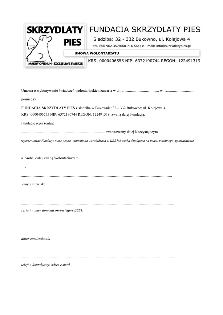 Umowa o wykonywanie świadczeń wolontariackich zawarta w dniu: .................................... w …............................ pomiędzy FUNDACJĄ SKRZYDLATY PIES z siedzibą w Bukownie: 32 – 332 Bukowno; ul. Kolejowa 4. KRS: 0000406555 NIP: 6372190744 REGON: 122491319 zwaną dalej Fundacją. Fundację reprezentuje: ......................................................................................... zwana/zwany dalej Korzystającym. reprezentować Fundację może osoba wymieniona we władzach w KRS lub osoba działająca na podst. pisemnego upoważnienia a osobą, dalej zwaną Wolontariuszem: . ................................................................................................................................................................. Imię i nazwisko ................................................................................................................................................................... seria i numer dowodu osobistego/PESEL .............................................................................................................................................................. adres zamieszkania .................................................................................................................................................................... telefon kontaktowy, adres e-mail zważywszy, że: • Fundacja oświadcza, że jest podmiotem, na rzecz którego zgodnie z art. 42 ust. 1 Ustawy z dnia 24 kwietnia 2003 r. o działalności pożytku publicznego i o wolontariacie (Dz. U. Nr 96, poz. 873) mogą być wykonywane świadczenia przez wolontariuszy. • Wolontariusz oświadcza, że posiada kwalifikacje i spełnia wymagania niezbędne do wykonywania powierzonych mu czynności. • Wolontariusz oświadcza, że zapoznał się z Regulaminem dotyczącym wykonywania świadczeń wolontariackich i przyjmuje jego warunki. • Ilekroć w umowie jest mowa o Statucie – dotyczy to statutu FUNDACJI SKRZYDLATY PIES. • Ilekroć w umowie jest mowa o Fundacji – dotyczy to FUNDACJI SKRZYDLATY PIES. • Ilekroć w umowie jest mowa o Zarządzie – dotyczy Zarządu FUNDACJI SKRZYDLATY PIES • Ilekroć w umowie jest mowa o Koordynatorze ds. wolontariatu – dotyczy członka Zarządu FUNDACJI SKRZYDLATY PIES wyznaczonego do nadzorowania działań Wolontariuszy. • Mając na względzie idee wolontariatu, u podstaw której stoi dobrowolne, bezpłatne wykonywanie czynności, a także biorąc pod uwagę charytatywny, pomocniczy i uzupełniający charakter wykonywanych przez wolontariuszy świadczeń, Strony umowy uzgadniają co następuje: §1 1. Korzystający powierza wykonywanie Wolontariuszowi, a Wolontariusz dobrowolnie podejmuje się wykonania na rzecz Korzystającego czynności obejmujących zmierzanie do celów opisanych w Statucie, a Wolontariusz oświadcza, że treść Statutu jest mu znana. 2. Czynności, o których mowa obejmują miedzy innymi: informowanie Fundacji o istnieniu potencjalnych zainteresowanych współpracą, promowanie Fundacji i jej działalności, udział w akcjach organizowanych przez Fundacje, niesienie pomocy zwierzętom, pomoc w ich leczeniu, szkoleniu, adopcji i inne czynności wynikające ze Statutu, a podejmowane w porozumieniu z Koordynatorem ds. wolontariatu, który działa z upoważnienia Zarządu. 3. Wolontariusz może działać jako Dom Tymczasowy dla zwierząt, którym Fundacja niesie pomoc. 4. Wolontariusz może na swoje nazwisko a za zgodą i wiedzą Fundacji, dokonywać adopcji, wykupu etc. zwierząt, pod warunkiem, że są one przeznaczone do dalszej adopcji za pośrednictwem Fundacji lub wymaga tego ratowanie ich zdrowia i życia. 5. Zakres działań i odpowiedzialności Wolontariusza określa Regulamin dotyczący wykonywania świadczeń wolontariackich. Wolontariusz oświadcza, że zapoznał się z nim. 6. Wolontariusz zobowiązuje się do wykonywania czynności, których zakres ustala z Koordynatorem ds. wolontariatu. 7. Praca Wolontariusza wykonywana na rzecz Fundacji podlega miesięcznej ocenie w formie miesięcznego raportu, na zasadach określonych w Regulaminie dotyczącym wykonywania świadczeń wolontariackich. §2 1. Strony uzgadniają, że czynności określone w § 1 będą wykonywane od dnia podpisania umowy przez okres: ….............................................. / przez czas nieokreślony*. 2. Miejscem wykonywania czynności będzie zwłaszcza region zamieszkania Wolontariusza, jednak Wolontariusz może działać na terenie całego kraju oraz poza granicami Polski. 3. Wolontariusz podlega i odpowiada przed Zarządem Fundacji. §3 Z uwagi na charakter i ideę wolontariatu: Wolontariusz jest zobowiązany wykonywać uzgodnione czynności osobiście. Wolontariusz za swoje czynności nie otrzyma wynagrodzenia. §4 Fundacja zobowiązuje się pokrywać niezbędne koszty ponoszone przez Wolontariusza, związane z wykonywaniem świadczeń na rzecz Fundacji, tylko za wcześniejszym porozumieniem z Fundacją, po udokumentowaniu poniesionych kosztów, w szczególności w przypadku: 1. pomocy zwierzętom i ponoszonym z tego tytułu kosztów leczenia, wyżywienia, wykupu, itp. 2. umieszczenia ratowanych zwierząt w hotelu, szpitalu, domu zastępczym, tymczasowym, itd. 3. innych, indywidualnie uzgodnionych, a zmierzających do realizacji celów statutowych. §5 1. Wolontariusz zobowiązuje się do zachowania tajemnicy i poufności informacji, które uzyskał w związku z wykonywaniem świadczeń na rzecz Fundacji. 2. W przypadku udostępniania przez Fundacje adresów e-mail, haseł, loginów, legitymacji, dostępów, haseł, kodów, itp. Wolontariusz zobowiązuje się nie przekazywać ich osobom trzecim oraz wykorzystywać tylko w celu wykonywania świadczeń na rzecz Fundacji przez okres obowiązywania niniejszej umowy. W/w udostępnione przez Fundacje pozostają jej wyłączną własnością. 3. Wolontariusz zobowiązuje się do kulturalnego i etycznego zachowania oraz postępowan