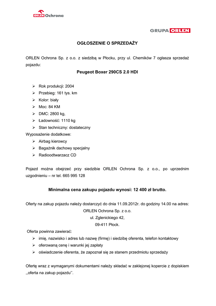 OGŁOSZENIE O SPRZEDAŻY ORLEN Ochrona Sp. z o.o. z siedzibą w Płocku, przy ul. Chemików 7 ogłasza sprzedaż pojazdu: Peugeot Boxer 290CS 2.0 HDI Rok produkcji: 2004 Przebieg: 161 tys. km Kolor: biały Moc: 84 KM DMC: 2800 kg, Ładowność: 1110 kg Stan techniczny: dostateczny Wyposażenie dodatkowe: Airbag kierowcy Bagażnik dachowy specjalny Radioodtwarzacz CD Pojazd można obejrzeć przy siedzibie ORLEN Ochrona Sp. z o.o., po uprzednim uzgodnieniu – nr tel. 665 995 128 Minimalna cena zakupu pojazdu wynosi: 12 400 zł brutto. Oferty na zakup pojazdu należy dostarczyć do dnia 11.09.2012r. do godziny 14.00 na adres: ORLEN Ochrona Sp. z o.o. ul. Zglenickiego 42, 09-411 Płock. Oferta powinna zawierać: imię, nazwisko i adres lub nazwę (firmę) i siedzibę oferenta, telefon kontaktowy oferowaną cenę i warunki jej zapłaty oświadczenie oferenta, że zapoznał się ze stanem przedmiotu sprzedaży Ofertę wraz z wymaganymi dokumentami należy składać w zaklejonej kopercie z dopiskiem ,,oferta na zakup pojazdu’’.