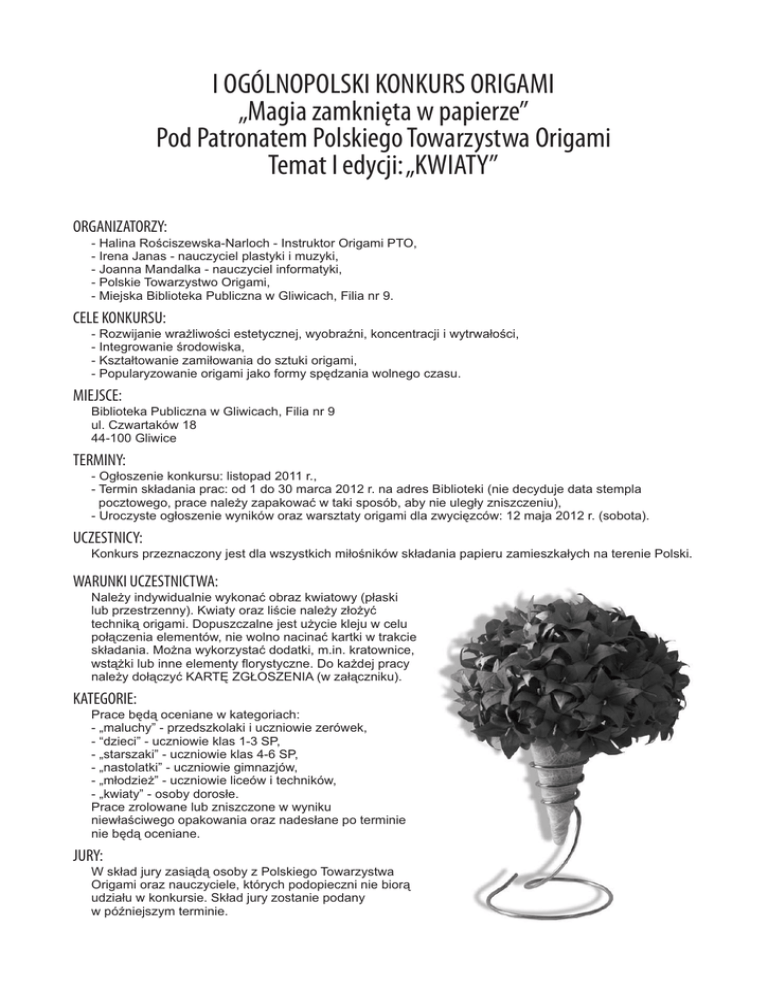 I OGÓLNOPOLSKI KONKURS ORIGAMI „Magia zamkniêta w papierze” Pod Patronatem Polskiego Towarzystwa Origami Temat I edycji: „KWIATY” ORGANIZATORZY: - Halina Roœciszewska-Narloch - Instruktor Origami PTO, - Irena Janas - nauczyciel plastyki i muzyki, - Joanna Mandalka - nauczyciel informatyki, - Polskie Towarzystwo Origami, - Miejska Biblioteka Publiczna w Gliwicach, Filia nr 9. CELE KONKURSU: - Rozwijanie wra¿liwoœci estetycznej, wyobraŸni, koncentracji i wytrwa³oœci, - Integrowanie œrodowiska, - Kszta³towanie zami³owania do sztuki origami, - Popularyzowanie origami jako formy spêdzania wolnego czasu. MIEJSCE: Biblioteka Publiczna w Gliwicach, Filia nr 9 ul. Czwartaków 18 44-100 Gliwice TERMINY: - Og³oszenie konkursu: listopad 2011 r., - Termin sk³adania prac: od 1 do 30 marca 2012 r. na adres Biblioteki (nie decyduje data stempla pocztowego, prace nale¿y zapakowaæ w taki sposób, aby nie uleg³y zniszczeniu), - Uroczyste og³oszenie wyników oraz warsztaty origami dla zwyciêzców: 12 maja 2012 r. (sobota). UCZESTNICY: Konkurs przeznaczony jest dla wszystkich mi³oœników sk³adania papieru zamieszka³ych na terenie Polski. WARUNKI UCZESTNICTWA: Nale¿y indywidualnie wykonaæ obraz kwiatowy (p³aski lub przestrzenny). Kwiaty oraz liœcie nale¿y z³o¿yæ technik¹ origami. Dopuszczalne jest u¿ycie kleju w celu po³¹czenia elementów, nie wolno nacinaæ kartki w trakcie sk³adania. Mo¿na wykorzystaæ dodatki, m.in. kratownice, wst¹¿ki lub inne elementy florystyczne. Do ka¿dej pracy nale¿y do³¹czyæ KARTÊ ZG£OSZENIA (w za³¹czniku). KATEGORIE: Prace bêd¹ oceniane w kategoriach: - „maluchy” - przedszkolaki i uczniowie zerówek, - “dzieci” - uczniowie klas 1-3 SP, - „starszaki” - uczniowie klas 4-6 SP, - „nastolatki” - uczniowie gimnazjów, - „m³odzie¿” - uczniowie liceów i techników, - „kwiaty” - osoby doros³e. Prace zrolowane lub zniszczone w wyniku niew³aœciwego opakowania oraz nades³ane po terminie nie bêd¹ oceniane. JURY: W sk³ad jury zasi¹d¹ osoby z Polskiego Towarzystwa Origami oraz nauczyciele, których podopieczni nie bior¹ udzia³u w konkursie. Sk³ad jury zostanie podany w póŸniejszym terminie. FORMAT I WIELKOŒÆ PRACY : Obraz nale¿y wykonaæ na tekturze pionowej formatu A3 z marginesem 4 cm z ka¿dej strony. T³o obrazu mo¿e byæ w innym kolorze co margines. 297 mm 217 mm KRYTERIA OCENY: 420 mm 340 mm Jury oceniaæ bêdzie: - zgodnoœæ pracy z tematem konkursu, - kompozycjê i estetykê pracy, - oryginalnoœæ wykonania, - trudnoœæ z³o¿eñ, - dobór koloru i papieru. NAGRODY: Laureaci konkursu otrzymaj¹ nagrody rzeczowe i dyplomy. Lista nagrodzonych uczestników zamieszczona bêdzie na stronie internetowej http://www.origami.friko.pl Najlepsze prace konkursowe zostan¹ wystawione na wystawie „Kwiaty” w Bibliotece Miejskiej w Gliwicach, Filia nr 9. Sponsorzy nagród: - Polskie Towarzystwo Origami, - Halina Roœciszewska-Narloch http://www.haligami.sklepna5.pl - sponsorzy prywatni. ZAKOÑCZENIE KONKURSU: Uroczyste podsumowanie konkursu, wrêczenie nagród i dyplomów odbêdzie siê 12 maja 2012 roku w Bibliotece Miejskiej w Gliwicach, Filia nr 9. Po podsumowaniu konkursu odbêd¹ siê warsztaty origami przeprowadzone przez Instruktora Origami Halinê Roœciszewsk¹-Narloch. UWAGI: - Informacje o konkursie oraz uaktualnienia bêd¹ zamieszczane systematycznie na stronie internetowej konkursu http://www.origami.friko.pl/konkursy/IOKO-2012.php - Nades³ane prace przechodz¹ na w³asnoœæ organizatora. - Administrowanie danych osobowych uczestników konkursu przez organizatora odbywaæ siê bêdzie wy³¹cznie w celach zwi¹zanych z konkursem. Organizatorzy zastrzegaj¹ sobie prawo do publikowania danych osobowych uczestników bior¹cych udzia³ w konkursie (zawartych w Karcie Zg³oszenia za wyj¹tkiem adresów i telefonów). - Zdjêcia prac konkursowych wraz z informacj¹ o autorze pracy bêd¹ opublikowane w biuletynie pokonkursowym oraz na stronie internetowej http://www.origami.friko.pl.