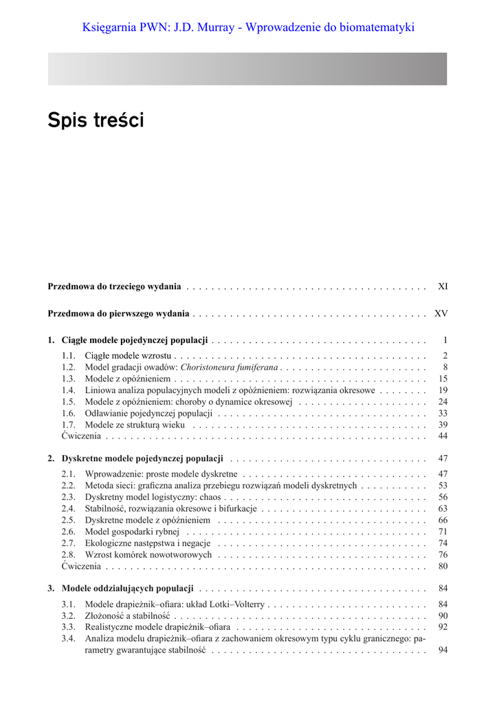 Księgarnia PWN: J.D. Murray - Wprowadzenie do biomatematyki Spis treści Przedmowa do trzeciego wydania . . . . . . . . . . . . . . . . . . . . . . . . . . . . . . . . . . . . . . . XI Przedmowa do pierwszego wydania . . . . . . . . . . . . . . . . . . . . . . . . . . . . . . . . . . . . . . XV 1. Ciagłe ˛ modele pojedynczej populacji . . . . . . . . . . . . . . . . . . . . . . . . . . . . . . . . . . . 1 . . . . . . . . 2 8 15 19 24 33 39 44 2. Dyskretne modele pojedynczej populacji . . . . . . . . . . . . . . . . . . . . . . . . . . . . . . . . 47 1.1. Ciagłe ˛ modele wzrostu . . . . . . . . . . . . . . . . . . . . . . . . . . . . . . . . . 1.2. Model gradacji owadów: Choristoneura fumiferana . . . . . . . . . . . . . . . . 1.3. Modele z opóźnieniem . . . . . . . . . . . . . . . . . . . . . . . . . . . . . . . . . 1.4. Liniowa analiza populacyjnych modeli z opóźnieniem: rozwiazania ˛ okresowe 1.5. Modele z opóźnieniem: choroby o dynamice okresowej . . . . . . . . . . . . . 1.6. Odławianie pojedynczej populacji . . . . . . . . . . . . . . . . . . . . . . . . . . 1.7. Modele ze struktura˛ wieku . . . . . . . . . . . . . . . . . . . . . . . . . . . . . . Ćwiczenia . . . . . . . . . . . . . . . . . . . . . . . . . . . . . . . . . . . . . . . . . . . . 2.1. Wprowadzenie: proste modele dyskretne . . . . . . . . . . . . . . . . . . . 2.2. Metoda sieci: graficzna analiza przebiegu rozwiazań ˛ modeli dyskretnych 2.3. Dyskretny model logistyczny: chaos . . . . . . . . . . . . . . . . . . . . . . 2.4. Stabilność, rozwiazania ˛ okresowe i bifurkacje . . . . . . . . . . . . . . . . 2.5. Dyskretne modele z opóźnieniem . . . . . . . . . . . . . . . . . . . . . . . 2.6. Model gospodarki rybnej . . . . . . . . . . . . . . . . . . . . . . . . . . . . 2.7. Ekologiczne nast˛epstwa i negacje . . . . . . . . . . . . . . . . . . . . . . . 2.8. Wzrost komórek nowotworowych . . . . . . . . . . . . . . . . . . . . . . . Ćwiczenia . . . . . . . . . . . . . . . . . . . . . . . . . . . . . . . . . . . . . . . . . . . . . . . . . . . . . . . . . . . . . . . . . . . . . . . . . . . . . . . . . . . . . . . . . . . . . . . . . . . . . . . . . . . . . . . . . . . . . . . . . . . . . . . . . . . . . . . . . . . . . . . . . . . . . . . . . . . . . . . . . . . . . . . . . . . . . . . . . . . . . . . . . . . . . . . . . . . . 47 53 56 63 66 71 74 76 80 3. Modele oddziałujacych ˛ populacji . . . . . . . . . . . . . . . . . . . . . . . . . . . . . . . . . . . . . 84 3.1. Modele drapieżnik–ofiara: układ Lotki–Volterry . . . . . . . . . . . . . . . . . . . . . . . . . . 3.2. Złożoność a stabilność . . . . . . . . . . . . . . . . . . . . . . . . . . . . . . . . . . . . . . . . . 3.3. Realistyczne modele drapieżnik–ofiara . . . . . . . . . . . . . . . . . . . . . . . . . . . . . . . 3.4. Analiza modelu drapieżnik–ofiara z zachowaniem okresowym typu cyklu granicznego: parametry gwarantujace ˛ stabilność . . . . . . . . . . . . . . . . . . . . . . . . . . . . . . . . . . . 84 90 92 94 Spis treści VI 3.5. Modele konkurencji: zasada konkurencyjnego wykluczania 3.6. Mutualizm lub symbioza . . . . . . . . . . . . . . . . . . . . . 3.7. Modele ogólne oraz pewne uwagi i ostrzeżenia . . . . . . . 3.8. Zjawiska progowe . . . . . . . . . . . . . . . . . . . . . . . . 3.9. Dyskretne modele oddziałujacych ˛ populacji . . . . . . . . . 3.10. Model drapieżnik–ofiara: analiza szczegółowa . . . . . . . . Ćwiczenia . . . . . . . . . . . . . . . . . . . . . . . . . . . . . . . . . . . . . . . . . . . . . . . . . . . . . . . . . . . . . . . . . . . . . . . . . . . . . . . . . . . . . . . . . . . . . . . . . . . . . . . . . . . . . . . . . . . . . . . . . . . . . . . . . . . . . . . . . . . . . . . . . . . . . . . . . . . . . . . . . . . . . . 100 106 108 114 117 118 124 4. Termiczna determinacja płci (TSD): środowisko przetrwania krokodyli . . . . . . . . . . . . . 128 4.1. Wprowadzenie biologiczne i historyczne dygresje na temat krokodyli . . . . . . . . 4.2. Główne założenia dotyczace ˛ wyboru miejsc l˛egowych i prosty model populacyjny 4.3. Model populacji krokodyli ze struktura˛ wieku . . . . . . . . . . . . . . . . . . . . . . 4.4. Model ze struktura˛ wieku zależny od zag˛eszczenia . . . . . . . . . . . . . . . . . . . 4.5. Stabilność populacji samic na mokrych bagnach (w rejonie I) . . . . . . . . . . . . . 4.6. Proporcja płci a przetrwanie . . . . . . . . . . . . . . . . . . . . . . . . . . . . . . . . . 4.7. Termiczna determinacja płci (TSD) a genetyczna determinacja płci (GSD) . . . . . 4.8. Aspekty zwiazane ˛ z determinacja˛ płci . . . . . . . . . . . . . . . . . . . . . . . . . . . Ćwiczenia . . . . . . . . . . . . . . . . . . . . . . . . . . . . . . . . . . . . . . . . . . . . . . . . . . . . . . . . . . . . . . . . . . . . . . . . . . . . . . . . . . . . . . . . . . . . 128 133 140 143 145 148 150 152 155 5. Modelowanie dynamiki interakcji małżeńskich — przewidywanie rozwodów i terapia małżeńska . . . . . . . . . . . . . . . . . . . . . . . . . . . . . . . . . . . . . . . . . . . . . . . . . . . . 156 5.1. 5.2. 5.3. 5.4. 5.5. 5.6. Tło psychologiczne i dane — metodologia Gottmana i Levensona Typologia małżeństw i uzasadnienie modelowania . . . . . . . . . Strategia modelowania i równania modelu . . . . . . . . . . . . . . Stany stacjonarne i ich stabilność . . . . . . . . . . . . . . . . . . . . Praktyczne wyniki modelu . . . . . . . . . . . . . . . . . . . . . . . Zyski, implikacje i scenariusz naprawy małżeństwa . . . . . . . . . . . . . . . . . . . . . . . . . . . . . . . . . . . . . . . . . . . . . . . . . . . . . . . . . . . . . . . . . . . . . . . . . . . . . . . . . . . . . . . . . . . . . . . . . . . 158 160 163 167 175 181 6. Kinetyki reakcji . . . . . . . . . . . . . . . . . . . . . . . . . . . . . . . . . . . . . . . . . . . . . . . . 187 6.1. Kinetyka enzymów: podstawowe reakcje enzymatyczne . 6.2. Szacowanie szybkiej skali