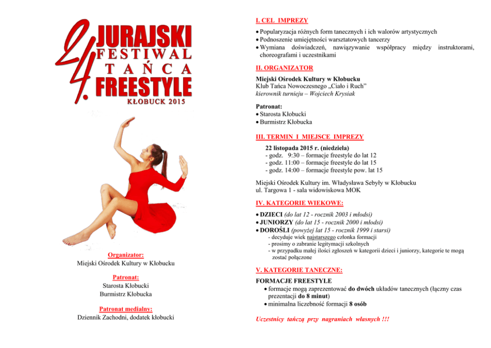 I. CEL IMPREZY Popularyzacja różnych form tanecznych i ich walorów artystycznych Podnoszenie umiejętności warsztatowych tancerzy Wymiana doświadczeń, nawiązywanie współpracy między instruktorami, choreografami i uczestnikami II. ORGANIZATOR Miejski Ośrodek Kultury w Kłobucku Klub Tańca Nowoczesnego „Ciało i Ruch” kierownik turnieju – Wojciech Krysiak Patronat: Starosta Kłobucki Burmistrz Kłobucka III. TERMIN I MIEJSCE IMPREZY 22 listopada 2015 r. (niedziela) - godz. 9:30 – formacje freestyle do lat 12 - godz. 11:00 – formacje freestyle do lat 15 - godz. 14:00 – formacje freestyle pow. lat 15 Miejski Ośrodek Kultury im. Władysława Sebyły w Kłobucku ul. Targowa 1 - sala widowiskowa MOK IV. KATEGORIE WIEKOWE: DZIECI (do lat 12 - rocznik 2003 i młodsi) JUNIORZY (do lat 15 - rocznik 2000 i młodsi) DOROŚLI (powyżej lat 15 - rocznik 1999 i starsi) Organizator: Miejski Ośrodek Kultury w Kłobucku - decyduje wiek najstarszego członka formacji - prosimy o zabranie legitymacji szkolnych - w przypadku małej ilości zgłoszeń w kategorii dzieci i juniorzy, kategorie te mogą zostać połączone V. KATEGORIE TANECZNE: Patronat: Starosta Kłobucki Burmistrz Kłobucka Patronat medialny: Dziennik Zachodni, dodatek kłobucki FORMACJE FREESTYLE formacje mogą zaprezentować do dwóch układów tanecznych (łączny czas prezentacji do 8 minut) minimalna liczebność formacji 8 osób Uczestnicy tańczą przy nagraniach własnych !!! VI. KOMISJA SĘDZIOWSKA X. UWAGI ORGANIZACYJNE Jury wytypowane przez organizatora spośród osób profesjonalnie związanych z ruchem tanecznym wszystkie sprawy sporne nie ujęte regulaminem rozpatrywane są przez Sędziego Głównego i Kierownika Organizacyjnego Turnieju we wszystkich sprawach spornych decydujący głos ma Sędzia Główny i Kierownik Turnieju potwierdzenie udziału w imprezie na 30 minut przed rozpoczęciem turnieju, należy posiadać dokumenty potwierdzający rok urodzenia uczestników opłacenie startowego 15,00 zł od uczestnika (w tym lekki posiłek dla każdego), płatne w sekretariacie w dniu imprezy lub przelewem na konto BS w Kłobucku 81 8248 0002 1000 0000 0374 0001 z dopiskiem „Freestyle” (najpóźniej 5 dni przed imprezą). każdy zespół pokrywa w swoim zakresie koszty przejazdu oraz pobytu instytucje zgłaszające zespoły powinny ubezpieczyć jego członków na czas przejazdu i pobytu dane techniczne sceny: szerokość 12 m, głębokość 9 m organizatorzy zapewniają: dyplomy dla finalistów, puchary oraz nagrody pieniężne dla najlepszych formacji organizator nie odpowiada za rzeczy pozostawione w szatniach VII. KRYTERIA OCENY SĘDZIOWSKIEJ Choreografia Dobór podkładu muzycznego Poczucie rytmu Strój i wrażenie estetyczne Technika taneczna VIII. WARUNKI UCZESTNICTWA W festiwalu mogą uczestniczyć formacje prezentujące różne techniki tańca współczesnego: modern-jazz, show-dance… tańca nowoczesnego: hip-hop: locking, popping, funk, electric boogie, breakdance, disco dance, house dance, funky… Organizator przywiązuje wielką uwagę do widowiskowości prezentacji Nagrania do układów: płyta CD Audio (numer nagrania - rozbiegówka od 0,5 do 1 s.) płyta CD z mp3 (nazwa zespołu oraz nazwa układu) pendrive (nagranie mp3 z nazwą zespołu oraz nazwą układu) IX. ZGŁOSZENIA Miejski Ośrodek Kultury ul. Targowa 1 42-100 Kłobuck tel./fax: 34 317 29 91 e-mail: [email protected] pisemnego zgłoszenia wg załączonego wzoru wraz z imiennym wykazem członków grupy do dnia 13.11.2015 r. Szczegółowych informacji o turnieju udzielamy codziennie w godz. 1300 - 2000 oprócz sobót i niedziel XI. RAMOWY PROGRAM IMPREZY NIEDZIELA (22.11.2015 r.) 800 – próba parkietu do godz. 900 – potwierdzenie udziału 1000 – rozpoczęcie turnieju w kat. formacje do lat 12 1100 – rozpoczęcie turnieju w kat. formacje do lat 15 1230 – ogłoszenie wyników, wręczenie nagród 1300 – zakończenie turnieju w tych kat. wiekowych 1300 – próba parkietu do godz. 1330 – potwierdzenie udziału 1400 – rozpoczęcie turnieju w kat. formacje powyżej lat 15 1530 – ogłoszenie wyników, wręczenie nagród 1600 – zakończenie turnieju w tej kat. Wiekowej Przesłanie na adres organizatora: KŁOBUCK – miasto w województwie śląskim, siedziba powiatu kłobuckiego i gminy miejsko-wiejskiej Kłobuck. Według podziału administracyjnego z lat 1975-1998 miasto należało do województwa częstochowskiego. W wyniku reformy administracyjnej w 1999 roku włączony został do województwa śląskiego, do którego należał również w latach 19501975. Według danych z 31 grudnia 2010, miasto liczyło 13 085 mieszkańców. Uwaga!!! Uczestnicy Festiwalu zezwalają na wykorzystanie ich wizerunku w ramach promocji imprezy przez organizatora za pomocą fotografii oraz rejestracji video.