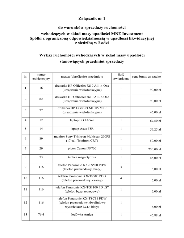 Załącznik nr 1 do warunków sprzedaży ruchomości wchodzących w skład masy upadłości MNE Investment Spółki z ograniczoną odpowiedzialnością w upadłości likwidacyjnej z siedzibą w Łodzi Wykaz ruchomości wchodzących w skład masy upadłości stanowiących przedmiot sprzedaży lp. numer ewidencyjny nazwa (określenie) przedmiotu 1 16 drukarka HP OfficeJet 7210 All-in-One (urządzenie wielofunkcyjne) 1 2 82 drukarka HP OfficeJet 5610 All-in-One (urządzenie wielofunkcyjne) 1 3 77 drukarka HP Laser Jet M1005 MFP (urządzenie wielofunkcyjne) 1 4 12 laptop LG LGW6 1 67,50 zł 5 14 laptop Asus F5R 1 56,25 zł 6 89 monitor Sony Trinitron Multiscan 200PS (17 cali Trinitron CRT) 1 7 29 ploter Canon iPF700 1 750,00 zł 8 73 tablica magnetyczna 1 45,00 zł 9 116 telefon Panasonic KX-TS500 PDW (telefon przewodowy, biały) 3 10 116 telefon Panasonic KX-TS500 PDB (telefon przewodowy, czarny) 4 11 116 telefon Panasonic KX-TG1100 PD „S” (telefon bezprzewodowy) 1 116 telefon Panasonic KX-TSC11 PDW (telefon przewodowy, dwuliniowy wyświetlacz LCD, biały) 1 lodówka Amica 1 12 13 76.4 ilość cena brutto za sztukę stwierdzona 90,00 zł 90,00 zł 45,00 zł 50,00 zł 6,00 zł 6,00 zł 6,00 zł 6,00 zł 46,88 zł 14 76.5 lodówka Amica (Freshline plus) 1 46,88 zł 15 76.6 lodówka Amica 1 46,88 zł 16 57 sofa 1 112,50 zł 17 112 szafka półki wiśniowa 1 56,25 zł 18 8 suszarka Electrolux 1 270,00 zł 19 47 fotel niski (brąz) 1 24,00 zł 20 48 fotel niski (brąz) 1 24,00 zł 21 50 fotel niski (brąz) 1 24,00 zł 22 85.1 szafka czarna 1 56,25 zł 23 83 kontener czarny 4 15,00 zł 24 88 kontener wiśniowy 1 56,25 zł 25 67 zabudowa recepcji 1 225,00 zł 26 7 suszarka Danube (rozłożona) 1 750,00 zł 27 13 zestaw komputerowy 1 56,25 zł 28 17 komputer Herkules line 1 56,25 zł 29 81 komputer Yamo 1 56,25 zł 30 90 komputer Tracer 1 56,25 zł 31 91 komputer Herkules line 1 56,25 zł 32 92 komputer Herkules line 1 56,25 zł Dodatkowe informacje i zastrzeżenia 1. Ruchomości stanowiące przedmiot sprzedaży są używane i mogą wymagać konserwacji lub naprawy. Nabywcy nie przysługują roszczenia z tytułu rękojmi za wady rzeczy. 2. Ceny wywoławcze wskazane w tabeli zawierają podatek od towarów i usług.