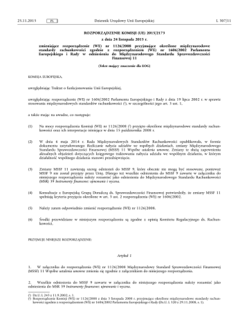 25.11.2015 Dziennik Urzędowy Unii Europejskiej PL L 307/11 ROZPORZĄDZENIE KOMISJI (UE) 2015/2173 z dnia 24 listopada 2015 r. zmieniające rozporządzenie (WE) nr 1126/2008 przyjmujące określone międzynarodowe standardy rachunkowości zgodnie z rozporządzeniem (WE) nr 1606/2002 Parlamentu Europejskiego i Rady w odniesieniu do Międzynarodowego Standardu Sprawozdawczości Finansowej 11 (Tekst mający znaczenie dla EOG) KOMISJA EUROPEJSKA, uwzględniając Traktat o funkcjonowaniu Unii Europejskiej, uwzględniając rozporządzenie (WE) nr 1606/2002 Parlamentu Europejskiego i Rady z dnia 19 lipca 2002 r. w sprawie stosowania międzynarodowych standardów rachunkowości (1), w szczególności jego art. 3 ust. 1, a także mając na uwadze, co następuje: (1) Na mocy rozporządzenia Komisji (WE) nr 1126/2008 (2) przyjęto określone międzynarodowe standardy rachun kowości oraz ich interpretacje istniejące w dniu 15 października 2008 r. (2) W dniu 6 maja 2014 r. Rada Międzynarodowych Standardów Rachunkowości opublikowała, w formie dokumentu zatytułowanego Rozliczanie nabycia udziałów we wspólnych działaniach, zmiany Międzynarodowego Standardu Sprawozdawczości Finansowej (MSSF) 11 Wspólne ustalenia umowne. Zmiany te służą zapewnieniu aktualnych objaśnień dotyczących księgowego traktowania nabycia udziału we wspólnym działaniu, w którym działalność wspólnego działania stanowi przedsięwzięcie. (3) Zmiany MSSF 11 zawierają szereg odniesień do MSSF 9, które obecnie nie mogą być stosowane, ponieważ MSSF 9 nie został przyjęty przez Unię. Dlatego też wszelkie odniesienia do MSSF 9 zawarte w załączniku do niniejszego rozporządzenia należy rozumieć jako odniesienia do Międzynarodowego Standardu Rachunkowości (MSR) 39 Instrumenty finansowe: ujmowanie i wycena. (4) Konsultacje z Europejską Grupą Doradczą ds. Sprawozdawczości Finansowej potwierdziły, że zmiany MSSF 11 spełniają kryteria przyjęcia określone w art. 3 ust. 2 rozporządzenia (WE) nr 1606/2002. (5) Należy zatem odpowiednio zmienić rozporządzenie (WE) nr 1126/2008. (6) Środki przewidziane w niniejszym rozporządzeniu są zgodne z opinią Komitetu Regulacyjnego ds. Rachun kowości, PRZYJMUJE NINIEJSZE ROZPORZĄDZENIE: Artykuł 1 1. W załączniku do rozporządzenia (WE) nr 1126/2008 Międzynarodowy Standard Sprawozdawczości Finansowej (MSSF) 11 Wspólne ustalenia umowne zmienia się zgodnie z załącznikiem do niniejszego rozporządzenia. 2. Wszelkie odniesienia do MSSF 9 zawarte w załączniku do niniejszego rozporządzenia należy rozumieć jako odniesienia do MSR 39 Instrumenty finansowe: ujmowanie i wycena. (1) Dz.U. L 243 z 11.9.2002, s. 1. (2) Rozporządzenie Komisji (WE) nr 1126/2008 z dnia 3 listopada 2008 r. przyjmujące określone międzynarodowe standardy rachun kowości zgodnie z rozporządzeniem (WE) nr 1606/2002 Parlamentu Europejskiego i Rady (Dz.U. L 320 z 29.11.2008, s. 1). L 307/12 PL Dziennik Urzędowy Unii Europejskiej 25.11.2015 Artykuł 2 Wszystkie przedsiębiorstwa stosują zmiany, o których mowa w art. 1, najpóźniej wraz z rozpoczęciem swojego pierwszego roku obrotowego rozpoczynającego się dnia 1 stycznia 2016 r. lub później. Artykuł 3 Niniejsze rozporządzenie wchodzi w życie trzeciego dnia po jego opublikowaniu w Dzienniku Urzędowym Unii Europejskiej. Niniejsze rozporządzenie wiąże w całości i jest bezpośrednio stosowane we wszystkich państwach członkowskich. Sporządzono w Brukseli dnia 24 listopada 2015 r. W imieniu Komisji Jean-Claude JUNCKER Przewodniczący 25.11.2015 PL Dziennik Urzędowy Unii Europejskiej L 307/13 ZAŁĄCZNIK Rozliczanie nabycia udziałów we wspólnych działaniach (Zmiany MSSF 11) „Powielanie dozwolone w obrębie Europejskiego Obszaru Gospodarczego. Wszystkie istniejące prawa są za strzeżone poza EOG, z wyjątkiem prawa do powielania na użytek własny lub w innych uczciwych celach. Wię cej informacji można uzyskać na stronie RMSR www.iasb.org” L 307/14 PL Dziennik Urzędowy Unii Europejskiej 25.11.2015 Zmiany MSSF 11 Wspólne ustalenia umowne Paragraf 21 A został dodany. Paragrafy 20–21 zostały włączone dla ułatwienia orientacji, ale nie zostały zmienione. Wspólne działania 20. 21. W związku z udziałami we wspólnym działaniu wspólnik wspólnego działania ujmuje: a) swoje aktywa, w tym udział w aktywach posiadanych wspólnie; b) swoje zobowiązania, w tym udział w zobowiązaniach zaciągniętych wspólnie; c) przychody ze sprzedaży swojego udziału w wynikach wspólnego działania; d) swoją część przychodów ze sprzedaży produkcji w ramach wspólnego działania oraz e) swoje koszty, w tym udział we wspólnie poniesionych kosztach. Wspólnik wspólnego działania rozlicza aktywa, zobowiązania, przychody i koszty związane z jego udziałem we wspólnym działaniu zgodnie z MSSF mającymi zastosowanie do tych konkretnych aktywów, zobowiązań, przychodów i kosztów. 21 A Jeżeli jednostka nabywa udział we wspólnym działaniu, w którym działalność wspólnego działania stanowi przedsięwzięcie, zgodnie z definicją w MSSF 3, stosuje ona, w zakresie jej udziału zgodnie z paragrafem 20, wszystkie zasady dotyczące rachunkowości połączeń jednostek w MSSF 3, a także inne MSSF, które nie są sprzeczne z wytycznymi zawartymi w niniejszym MSSF, oraz dokonuje ujawnienia informacji wymaganych w tych MSSF w odniesieniu do połączeń jednostek. Ma to zastosowanie zarówno do nabycia początkowego udziału, jak i dodatkowych udziałów we wspólnym działaniu, w którym działalność wspólnego działania stanowi przedsięwzięcie. Rozliczanie nabycia udziału w takim wspólnym działaniu określono w paragrafach B33 A–B33D. W załączniku B zmieniono główny nagłówek przed paragrafem B34 oraz dodano paragrafy B33 A–B33D i dotyczący ich nagłówek. Sprawozdania finansowe stron wspólnego ustalenia umownego (paragrafy 21 A–22) Rozliczanie nabycia udziałów we ws