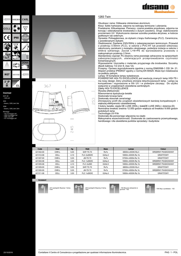 1283 Twin Obudowa i rama: Odlewane ciśnieniowo aluminium. Klosz: Szkło hartowane, odporne na wstrząsy termiczne i uderzenia. Powlekanie: Kilkuetapowe. Pierwszy: czarna powłoka proszkowa, odporna na korozję i oddziaływanie środowiska o dużym zasoleniu. Drugi: stabilizowanie promieniami UV. Wykończenie stanowi szorstka powłoka akrylowa, w kolorze grafitowym lub srebrnym. Oprawka: Poliwęglanowa, ze stykami z brązu fosforowego (FLC). Ceramiczna, z posrebrzanymi stykami. Okablowanie: Zasilanie 230V/50Hz z zabezpieczeniem termicznym. Przewód o przekroju 0.50mm (FLC), w osłonie z PVC-HT lub przewód silikonowy zakończony zaciskami z mosiądzu okrętowego, podwójna izolacja w osłonie z włókna szklanego. Zacisk L+N+PE do wprowadzenia przewodu o maksymalnym przekroju 2.5mm. Standardowy osprzęt: Po otwarciu rama pozostaje zahaczona na sprężynkach zabezpieczających, ułatwiających przeprowadzenie czynności konserwacyjnych. Wyposażenie: Uszczelka z materiału przyjaznego dla środowiska. Szczelny dławik kablowy 1/2 (min 9, max 12). Przepisy: Oprawa wyprodukowana zgodnie z normą EN60598-1 CEI 34- 21. Stopień protekcji IP65IK07 zgodny z normą EN 60529. Może być instalowana na podłożu palnym. Lampy: W komplecie lampy wyładowcze. POWERSTAR HQI-TS EXCELLENCE jest ewolucją znanych lamp HQI-TS i ma nowy design, który umożliwia zmniane dotychczasowych lamp. Lampy są kompaktowe i wyposażone w filtr UV i w podwójne zaczepy. Do użytku wyłącznie w urządzeniach oświetlenia zamkniętych. Zalety HQI-TS EXCELLENCE Wysoka efektywność Równomierna dystrybucja światła Doskonała tonacja barw Doskonały stosunek cena/osiągi Zmniejszony profil dla urządzeń oświetleniowych bardziej kompaktowych i większej efektywności oświetleniowej 3 kolory światła: ciepła DE LUXE (WDL), białaDE LUXE (NDL) i dzienna (D) Nominalna trwałość średnia 12.000 godzin–większa od trwałości 9.000 godzin podobdych lamp Technologia UV-Filtr Doskonała dla ponownego włączenia na ciepło Maksymalna wszechstronność: Doskonała do zastosowania przemysłowego, handlowego i dla oświetlenia punktów sprzedaży i budynków Download DXF 2D - 1283.dxf 3DS - disano_1283_twin.3ds 3DM - disano_1283_twin.3dm Montaggi - 102 montaggio.dxf - 1283 montaggio.dxf - 1283_twin.pdf - 101 montaggio.dxf Code Gear Kg Watt Base Lamps Colour 421302-00 CNR-L 5,00 SAP-TS 70 Rx7s 6800lm-2000K-Ra 4 SREBRNY PIASKOWANY 421312-08 CELL 4,10 FLC 2x26D/E G24q-3 1800lm-4000K-Ra 1b GRAFITOWY 421307-00 CNR-L 5,00 JM-TS 70 Rx7s 5700lm-4000k-Ra 1b GRAFITOWY 421304-08 CELL 4,00 FLC 1x26D/E G24q-3 1800lm-4000K-Ra 1b SREBRNY PIASKOWANY 421305-08 CELL 4,10 FLC 2x26D G24d-3 1800lm-4000K-Ra 1b SREBRNY PIASKOWANY 421309-00 CNR-L 5,00 SAP-TS 70 Rx7s 6800lm-2000K-Ra 4 GRAFITOWY 421300-00 CNR-L 5,00 JM-TS 70 Rx7s 5700lm-4000k-Ra 1b SREBRNY PIASKOWANY 421311-08 CELL 3,50 FLC 1x26D/E G24q-3 1800lm-4000K-Ra 1b GRAFITOWY Accessori - 101 wysiegnik Słupowy 1-lamp. - Twin 25/10/2016 - 102 wysiegnik Słupowy 2-lamp. - Twin - 104 Słup do zakopania w gruncie - 102 Contattare il Centro di Consulenza e progettazione per qualsiasi informazione illuminotecnica. - 106 Słup z podstawa - 102 PAG 1 - POL