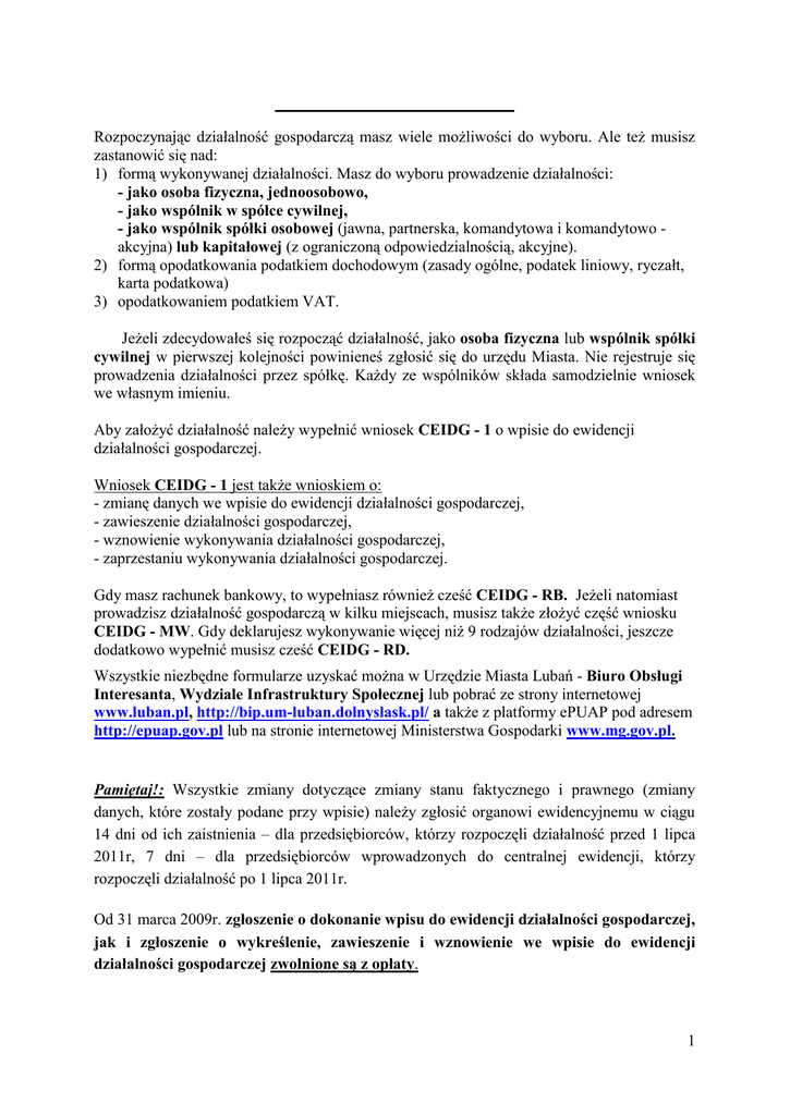 JAK ZAŁOŻYĆ WŁASNĄ FIRMĘ Rozpoczynając działalność gospodarczą masz wiele możliwości do wyboru. Ale też musisz zastanowić się nad: 1) formą wykonywanej działalności. Masz do wyboru prowadzenie działalności: - jako osoba fizyczna, jednoosobowo, - jako wspólnik w spółce cywilnej, - jako wspólnik spółki osobowej (jawna, partnerska, komandytowa i komandytowo akcyjna) lub kapitałowej (z ograniczoną odpowiedzialnością, akcyjne). 2) formą opodatkowania podatkiem dochodowym (zasady ogólne, podatek liniowy, ryczałt, karta podatkowa) 3) opodatkowaniem podatkiem VAT. Jeżeli zdecydowałeś się rozpocząć działalność, jako osoba fizyczna lub wspólnik spółki cywilnej w pierwszej kolejności powinieneś zgłosić się do urzędu Miasta. Nie rejestruje się prowadzenia działalności przez spółkę. Każdy ze wspólników składa samodzielnie wniosek we własnym imieniu. Aby założyć działalność należy wypełnić wniosek CEIDG - 1 o wpisie do ewidencji działalności gospodarczej. Wniosek CEIDG - 1 jest także wnioskiem o: - zmianę danych we wpisie do ewidencji działalności gospodarczej, - zawieszenie działalności gospodarczej, - wznowienie wykonywania działalności gospodarczej, - zaprzestaniu wykonywania działalności gospodarczej. Gdy masz rachunek bankowy, to wypełniasz również cześć CEIDG - RB. Jeżeli natomiast prowadzisz działalność gospodarczą w kilku miejscach, musisz także złożyć część wniosku CEIDG - MW. Gdy deklarujesz wykonywanie więcej niż 9 rodzajów działalności, jeszcze dodatkowo wypełnić musisz cześć CEIDG - RD. Wszystkie niezbędne formularze uzyskać można w Urzędzie Miasta Lubań - Biuro Obsługi Interesanta, Wydziale Infrastruktury Społecznej lub pobrać ze strony internetowej www.luban.pl, http://bip.um-luban.dolnyslask.pl/ a także z platformy ePUAP pod adresem http://epuap.gov.pl lub na stronie internetowej Ministerstwa Gospodarki www.mg.gov.pl. Pamiętaj!: Wszystkie zmiany dotyczące zmiany stanu faktycznego i prawnego (zmiany danych, które zostały podane przy wpisie) należy zgłosić organowi ewidencyjnemu w ciągu 14 dni od ich zaistnienia – dla przedsiębiorców, którzy rozpoczęli działalność przed 1 lipca 2011r, 7 dni – dla przedsiębiorców wprowadzonych do centralnej ewidencji, którzy rozpoczęli działalność po 1 lipca 2011r. Od 31 marca 2009r. zgłoszenie o dokonanie wpisu do ewidencji działalności gospodarczej, jak i zgłoszenie o wykreślenie, zawieszenie i wznowienie we wpisie do ewidencji działalności gospodarczej zwolnione są z opłaty. 1 Zgodnie z tzw. zasadą jednego okienka wniosek CEIDG-1 jest równocześnie wnioskiem o wpis do krajowego rejestru urzędowego podmiotów gospodarki narodowej (Regon), pozyskanie lub uaktualnienie numeru NIP (Urząd Skarbowy), zgłoszenie albo zmianę zgłoszenia płatnika składek (ZUS), ewentualnie oświadczeniem o kontynuowaniu ubezpieczenia społecznego rolników (KRUS). Po złożeniu wniosku organ ewidencyjny w ciągu 1 dnia dokonuje wpisu do ewidencji działalności gospodarczej. Informacja o dokonaniu wpisu do ewidencji zostanie umieszczona na stronie Ministerstwa Gospodarki. www.mg.gov.pl W naszym mieście wpisu do ewidencji działalności gospodarczej dokonuje: Urząd Miasta Lubań Wydział Infrastruktury Społecznej ul. Mickiewicza 6 (2 piętro) Wszelkich informacji nt. działalności gospodarczej udziela Pani Monika Chojnowska tel. 75 6464 444 Interesanci przyjmowani są w: poniedziałek od godz. 8.00 do godz.16.00 wtorek - piątek w godz. od 7.30 do godz. 15.30 Trzeba pamiętać, że wprowadzenie zasady „jednego okienka” nie zwalnia przedsiębiorcy od konieczności załatwienia niektórych spraw w urzędach osobiście, np. złożenia w ZUS druków ZUS ZUA lub ZUS ZZA, a w urzędzie skarbowym informacji o podjęciu działalności w formie spółki cywilnej, czy też podjęciu działalności objętej podatkiem od towarów i usług – VAT. Urząd Skarbowy w Lubaniu ul. Stara 1 tel. (075) 722 91 00 Interesanci przyjmowani są: poniedziałek, wtorek, czwartek i piątek od godz. 7.30 do godz. 15.30 środa od godz. 7.30 do godz.18.00 Osoba rozpoczynająca prowadzenie działalności musi samodzielnie dokonać zgłoszenia do ubezpieczeń w ZUS w terminie 7 dni od daty powstania obowiązku ubezpieczenia, tj. od dnia rozpoczęcia działalności. 2 Zakład Ubezpieczeń Społecznych w Lubaniu ul. Łokietka 13 tel. 75 646 87 80 Interesanci przyjmowani są: poniedziałek, wtorek, środa i piątek od godz. 8.00 do godz.15.00 czwartek w godz. od 8.00 do godz. 17.00. Numer REGON Wniosek CEIDG-1 jest jednocześnie wnioskiem o wpis do krajowego rejestru urzędowego podmiotów gospodarki narodowej (REGON). Pamiętaj! Podmiot, który zawiesił działalność gospodarczą, a następnie ponownie ją podjął, nie musi występować o nowy REGON. Zmiany cech podmiotu objęte wpisem do rejestru podmiotów (jak np. data zawieszenia i podjęcia działalności) nie powodują nadania nowego numeru identyfikacyjnego. Spółka cywilna Przedsiębiorcy prowadzący indywidualnie działalność gospodarczą mogą utworzyć spółkę cywilną na podstawie prawa cywilnego. Każdy ze wspólników spółki cywilnej powinien posiadać wpis do ewidencji działalności gospodarczej. Spółka powinna wystąpić do właściwego urzędu statystycznego o nadanie odrębnego numeru REGON i do urzędu skarbowego o nadanie numeru NIP (Druk NIP-2 oraz NIP- D). Zgłoszenia spółki w urzędzie skarbowym należy dokonać w ciągu 14 dni od daty zawarcia umowy spółki w związku z podatkiem od czynności cywilnoprawnych. Należy podkreślić, że spółka cywilna nie posiada osobowości prawnej, a jej wspólnicy odpowiadają osobiście i solidarnie za zobowiązania. W przypadku osób prowadzących działalność w ramach spółki cywilnej płatnikiem składek na ubezpieczenia wspólników może być za nich spółka (formularz ZUS ZPA) lub każdy ze wspólników. W t