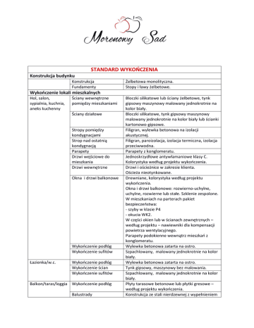 STANDARD WYKOŃCZENIA Konstrukcja budynku Konstrukcja Fundamenty Żelbetowa monolityczna. Stopy i ławy żelbetowe. Wykończenie lokali mieszkalnych Hol, salon, sypialnia, kuchnia, aneks kuchenny Ściany wewnętrzne pomiędzy mieszkaniami Ściany działowe Stropy pomiędzy kondygnacjami Strop nad ostatnią kondygnacją Parapety Drzwi wejściowe do mieszkania Drzwi wewnętrzne Okna i drzwi balkonowe Wykończenie podłóg Wykończenie sufitów Łazienka/w.c. Wykończenie podłóg Wykończenie ścian Wykończenie sufitów Balkon/taras/loggia Wykończenie podłóg Balustrady Bloczki silikatowe lub ściany żelbetowe, tynk gipsowy maszynowy malowany jednokrotnie na kolor biały. Bloczki silikatowe, tynk gipsowy maszynowy malowany jednokrotnie na kolor biały lub ścianki kartonowo-gipsowe. Filigran, wylewka betonowa na izolacji akustycznej. Filigran, paroizolacja, izolacja termiczna, izolacja przeciwwodna. Parapety z konglomeratu. Jednoskrzydłowe antywłamaniowe klasy C. Kolorystyka według projektu wykończenia. Drzwi i ościeżnice w zakresie klienta. Ościeża nieotynkowane. Drewniane, kolorystyka według projektu wykończenia. Okna i drzwi balkonowe: rozwierno-uchylne, uchylne, rozwierne lub stałe. Szklenie zespolone. W mieszkaniach na parterach pakiet bezpieczeństwa: - szyby w klasie P4 - okucia WK2. W części okien lub w ścianach zewnętrznych – według projektu – nawiewniki dla kompensacji powietrza wentylacyjnego. Parapety podokienne wewnątrz mieszkań z konglomeratu. Wylewka betonowa zatarta na ostro. Szpachlowany, malowany jednokrotnie na kolor biały. Wylewka betonowa zatarta na ostro. Tynk gipsowy, maszynowy bez malowania. Szpachlowany, malowany jednokrotnie na kolor biały. Płyty tarasowe betonowe lub płytki gresowe – według projektu wykończenia. Konstrukcja ze stali nierdzewnej z wypełnieniem Oddzielenia szkłem bezpiecznym, klejonym. Konstrukcja ze stali nierdzewnej z wypełnieniem szkłem bezpiecznym, klejonym. Instalacje w lokalach mieszkalnych Instalacja elektryczna Tablica mieszkaniowa Wypusty oświetleniowe Gniazda elektryczne Instalacja centralnego ogrzewania Instalacja wodnokanalizacyjna Wentylacja mechaniczna Instalacja teletechniczna Instalacja światłowodowa i TV Grzejniki Przewody Instalacja zimnej i ciepłej wody Zlokalizowana w pobliżu drzwi wejściowych do mieszkania, wyposażona w dzwonek. - 1szt. na suficie w każdym pomieszczeniu - 1szt. ścienny w łazience - 1szt. na suficie w aneksie kuchennym - 1szt. na balkonie/tarasie/loggii/ogródku wyposażonym w lampę - hol – 1szt - aneks – 2szt. nad blatem kuchennym – 1szt. do zmywarki – 1szt. do okapu – 1szt. do lodówki – 1szt. zasilanie elektryczne kuchenki (zakończone puszką) - salon – 3 szt - pokój – 2 szt - łazienka – 2szt - balkon/taras/loggia/ogródek – 1szt W pokojach grzejniki płytowe z podejściem dolnym lub ściennym, w łazienkach grzejniki szczebelkowe. Grzejniki wyposażone w głowice termostatyczne. Licznik ciepła na zewnątrz lokalu. Ogrzewanie z sieci miejskiej. Rozprowadzone w podłodze. Rury PE rozprowadzane pod posadzką. Nie wkuwane na ścianach pomiędzy lokalami mieszkalnymi. Ciepła i zimna woda doprowadzona jest z sieci miejskiej. Liczniki zużycia ciepłej i zimnej wody na zewnątrz lokalu. W mieszkaniach z ogródkami punkt poboru wody na ścianie zewnętrznej. Instalacja kanalizacji Rury PCV prowadzone na ścianach. Kuchnia, aneks kuchenny, Wentylacja mechaniczna wyciągowa. łazienka, WC W kuchni i aneksie kuchennym instalacja do podłączenie okapu. Gniazdko RTV - salon - 1 szt. Gniazdko tel./int. - salon - 1 szt. RJ45 Domofon - hol - 1 szt. Instalacja światłowodowa, instalacja telewizji naziemnej i telewizji satelitarnej doprowadzona do skrzynki teletechnicznej w każdym mieszkaniu. Wykończenie części wspólnych Dźwigi osobowe Korytarze Klatki schodowe Wykończenie podłóg Drzwi wejściowe Wykończenie podłóg Wykończenie ścian Wykończenie sufitów Typu Kone lub podobne. Płytki gresowe lub/i kamienne. Aluminiowe malowane proszkowo. Płytki gresowe lub/i kamienne. Tynk gipsowy, maszynowy malowany dwukrotnie. Szpachlowany, malowany dwukrotnie. Możliwa zabudowa z płyt GK wg projektu wnętrz. Wykończenie i wyposażenie garaży Garaże podziemne Drzwi do klatek schodowych Miejsca stacjonarne w garażu Brama wjazdowa Wykończenie podłóg Wykończenie ścian Boksy lokatorskie Drzwi stalowe malowane proszkowo. Numerowane miejsca stacjonarne. Otwarcie bramy elektryczne – sterowane pilotem. Beton zatarty na gładko. Masa szpachlowa na bazie cementu malowana jednokrotnie. Ściany murowane malowane. Wykończenie budynku i zagospodarowanie terenu Elewacja budynku Zagospodarowanie terenu Drogi i parking zewnętrzny Chodniki Plac zabaw Mała architektura Oświetlenie Ogrodzenie Szlaban Monitoring Elewacja wykończona tynkiem mineralnym malowanym farbą silikonową lub silikatową, lokalnie okładzina kamienna lub gresowa. Nawierzchnia – kostka betonowa lub/i ekokrata – według projektu. Nawierzchnia z płytek betonowych lub/i kostki betonowej – kolor i wzór według projektu. Elementy placu zabaw według projektu. Ogrodzenie ogródków przy mieszkaniach parteru, ławki i śmietniki w częściach wspólnych Oprawy oświetleniowe – rozmieszczenie według projektu. Całość ogrodzona. Szlaban na wjeździe. Całość monitorowana łącznie z garażami.