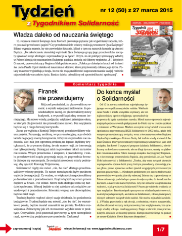 Tydzień z Tygodnikiem Solidarność nr 12 (50) z 27 marca 2015 Władza daleko od nauczania świętego 10. rocznica śmierci Świętego Jana Pawła II prowokuje pytania: jak wypełniamy zadania, które postawił przed nami papież? Czy przedstawiciele władzy realizują testament Ojca Świętego? Bilans wypada marnie, by nie powiedzieć fatalnie. Mówi o tym na naszych łamach bp Antoni Dydycz. „Po zakończeniu ziemskiej wędrówki Ojca Świętego grupy jego przeciwników zaczęły ujawniać swoje ideologie i wprowadzać je w życie”. O tym, na ile politycy sprawujący władzę w Polsce kierują się nauczaniem Świętego papieża, mówią też liderzy regionów „S”. Wojciech Grzeszek, przewodniczący Regionu Małopolska ocenia: „Polska po dziesięciu latach od śmierci św. Jana Pawła II jest daleka od nauczania i ideałów, które przyświecały całemu jego życiu. Polacy masowo wyjeżdżają z kraju, bo tu nie mają możliwości zagwarantowania swojej rodzinie odpowiednich warunków życia. Bardzo daleko odeszliśmy od sprawiedliwości społecznej”. n Komentarz tygodnia Firanek nie przewidujemy Mój szef powiedział, że planowaliśmy remont, a wyszło więcej niż malowanie. Ja powiedziałbym raczej, że planowaliśmy nowy Marek Lewandowski budynek, a wyszedł kapitalny remont istniejącego. Ma nowe windy, podjazdy, większe i jaśniejsze okna, w których dla jawności nie przewidziano zasłon. Bez wątpienia będzie się z niego łatwiej korzystało. Zaraz po wyjściu z Komisji Trójstronnej przedstawiliśmy własny projekt. Przyznaję, ambitny, wręcz rewolucyjny, a po dwóch latach negocjacji mamy kompromis, który nas wprawdzie nie zadowala, ale i tak jest ogromną zmianą na lepsze. Byliśmy krytykowani, że zrywamy dialog, że nie mamy racji, że interesują nas tylko protesty. Dzisiaj już nikt na poważnie takich zarzutów nie stawia. Wręcz przeciwnie. I eksperci, i pracodawcy, i wielu przedstawicieli rządu przyznają rację, że poprzednia formuła dialogu się wyczerpała. Że związki zawodowe miały podstawy, aby opuścić Komisję Trójstronną. Solidarność nigdy nie mówi „nie, bo nie”, dlatego przedstawiliśmy własny projekt. To nasze rozwiązania były punktem wyjścia do negocjacji. Co ważne, w większości negocjowaliśmy je dwustronnie z pracodawcami. Rząd włączył się w ten proces dopiero w finale. I to widać. Nowa rada dialogu stała się bardziej społeczna. Więcej będzie w niej zależało od związków zawodowych i pracodawców. Również więcej, ale obowiązków, będzie miał rząd. Trudniej będzie rządowi ukryć swoje działania, bo posiedzenia będą jawne. Trudnej będzie mu mówić „nie, bo nie”, bo wszystko co powie, będzie musiał uzasadnić na piśmie. To dobre rozwiązania. Zobaczymy jak ich stosowanie wyjdzie nam w praktyce. Oczywiście, jeśli pozostali partnerzy, w tym szczególnie rząd, zatwierdzą podpisane porozumienie. Czekamy! n zaprenumeruj i czytaj Do końca myślał o Solidarności Od 10 lat nie ma wśród nas największego żyjącego we współczesnej dobie rodaka. Wielkość Jerzy Kłosiński Jana Pawła II miała wszystkie wymiary, ale ten najistotniejszy, oprócz religijnego, sprowadzał się po prostu do bycia sumieniem narodu. Mówił nam o sprawach najważniejszych podczas swoich pielgrzymek do Polski czy w trakcie spotkań z rodakami w Watykanie. Miałem szczęście wziąć udział w ostatnim spotkaniu z reprezentacją NSZZ Solidarność w 2003 roku, gdzie byli wszyscy przewodniczący związku, wraz z ówczesnym szefem Regionu Śląsko-Dąbrowskiego – Piotrem Dudą. Jak trafnie wtedy stwierdził Janusz Śniadek, który przewodniczył reprezentacji Solidarności jako szef związku, Jan Paweł II wytyczył program działania Solidarności, nie obliczony na krótkowzroczne cele, ale na długi dystans, oparty na głębokim rozumieniu roli w Polsce naszego związku. Zacytuję trzy fragmenty z ówczesnego przemówienia Papieża, aby potwierdzić, że Jan Paweł II do końca myślał o Solidarności: „Trzeba, aby wasz związek otwarcie występował w obronie ludzi pracy, którym pracodawcy odmawiają prawa głosu, prawa sprzeciwu wobec zjawisk urągających podstawowym prawom pracownika. (...) Osobnym problemem jest często traktowanie pracowników wyłącznie jako siły roboczej. Zdarza się, iż pracodawcy w Polsce odmawiają podwładnym prawa do odpoczynku, do świadczeń lekarskich, a nawet do macierzyństwa. Czy nie oznacza to ograniczania wolności, o jaką walczyła Solidarność? Pozostaje wiele do zrobienia w tym względzie. Ten obowiązek spoczywa na władzach państwowych, na instytucjach prawnych, ale także na Solidarności, z którą świat pracy różnych sektorów związał wiele nadziei. Nie można tej nadziei zawieść. (…) Władza przechodzi z rąk do rąk, a robotnicy, rolnicy, nauczyciele, służba zdrowia i wszyscy inni pracownicy, bez względu na to, kto sprawuje władzę w kraju, oczekują pomocy. Stając w obronie praw pracowniczych, działacie w słusznej sprawie, dlatego możecie liczyć na pomoc ze strony Kościoła. Niech Bóg wam błogosławi”. n więcej informacji na: www.tygodniksolidarnosc.com 1/7 nr 14 z 3 kwietnia 2015 Piękno to refleksja Słowa – Przedstawienie Męki Chrystusa to chyba największe możliwe wyzwanie dla twórcy, szczególnie dla rzeźbiarza. Każdy artysta musi prędzej czy później dotknąć nadprzyrodzonego wymiaru życia – z Janem Kuracińskim, artystą rzeźbiarzem, absolwentem warszawskiej ASP, rozmawia Agnieszka Żurek. Arcybractwo Dobrej Śmierci W każdy piątek Wielkiego Postu na krużgankach krakowskiej bazyliki o.o. Franciszkanów pojawia się procesja tajemniczych, zakapturzonych postaci. Spowite w czarne habity, przewiązane w pasie białym sznurem, na dłoniach mają czarne rękawice, w kapturach wycięte otwory na oczy. Bractwo Męki Pańskiej, zwane tez Bractwem Dobrej Śmierci, powstało za panowania Zygmunta III Wazy.