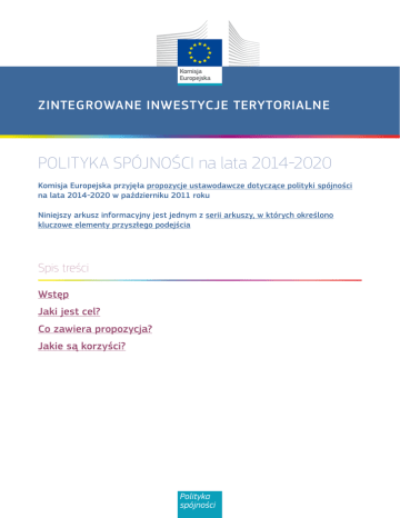 ZINTEGROWANE INWESTYCJE TERYTORIALNE POLITYKA SPÓJNOŚCI na lata 2014-2020 Komisja Europejska przyjęła propozycje ustawodawcze dotyczące polityki spójności na lata 2014-2020 w październiku 2011 roku Niniejszy arkusz informacyjny jest jednym z serii arkuszy, w których określono kluczowe elementy przyszłego podejścia Spis treści Wstęp Jaki jest cel? Co zawiera propozycja? Jakie są korzyści? Polityka spójności Wiele wyzwań, przed jakimi stoi Europa – wyzwania gospodarcze, związane z ochroną środowiska i społeczne – wskazują na istnienie potrzeby opracowania zintegrowanego podejścia terytorialnego mającego na celu opracowanie skutecznych rozwiązań. Zintegrowane podejście terytorialne jest wielowymiarowe, dostosowane do cech i wyników specyficznych dla danego terytorium. Może to oznaczać wyjście poza tradycyjne granice administracyjne i może wymagać większej skłonności do współpracy i koordynacji działań ze strony władz różnego szczebla w celu osiągnięcia wspólnych celów. Jest to zgodne z nowym celem spójności terytorialnej wprowadzonym przez Traktat Lizboński, w którym stwierdza się, że spójności gospodarczej i społecznej nie można osiągnąć na szczeblu europejskim bez silniejszego skoncentrowania się na terytorialnym wpływie polityk UE. Z tego powodu wspólne przepisy proponowane przez Komisję wprowadzają nowe narzędzia integracji, które można zastosować do implementacji strategii terytorialnych w terenie, wiążąc cele tematyczne określone w umowach o współpracy i Programach operacyjnych z wymiarem terytorialnym: rozwój lokalny kierowany przez społeczność (art. 28-30 proponowanego rozporządzenia w sprawie wspólnych przepisów) oraz zintegrowane inwestycje terytorialne (art. 99 proponowanego rozporządzenia w sprawie wspólnych przepisów). Niniejszy arkusz informacyjny koncentruje się na zintegrowanych inwestycjach terytorialnych (ZIT), które pozwolą państwom członkowskim powiązać finansowanie w ramach różnych osi priorytetowych jednego lub kilku Programów operacyjnych do celów interwencji wielowymiarowych i międzysektorowych. Utrzymana zostanie jednakże możliwość śledzenia przyznawania środków do różnych priorytetów inwestycyjnych. Jaki jest cel? g Do góry Ponieważ zintegrowane strategie terytorialne są niezbędne do osiągnięcia inteligentnej, zrównoważonej i sprzyjającej włączeniu Europy przewidywanej w strategii „Europa 2020”, proponowane rozporządzenie w sprawie wspólnych przepisów wprowadza ZIT jako podstawowe narzędzie implementacji takich strategii. Propozycja Komisji ustanawia elastyczny mechanizm formułowania zintegrowanych odpowiedzi na różne potrzeby terytorialne, bez utraty skoncentrowania na tematyce, poprzez którą polityka spójności wiąże się ze strategią „Europa 2020”. Co zawiera propozycja? g Do góry ZIT – wydajne i elastyczne narzędzie ZIT to narzędzie do wdrażania strategii terytorialnych w sposób zintegrowany. Nie jest to działanie ani subpriorytet żadnego Programu operacyjnego. Natomiast ZIT pozwala państwom członkowskim na implementację Programów operacyjnych w sposób przekrojowy oraz uzyskiwanie finansowania z różnych osi priorytetowych jednego lub kilku Programów operacyjnych, co zapewnia implementację zintegrowanej strategii dla określonego terytorium. Dzięki temu istnienie ZIT zarówno zapewni państwom członkowskim elastyczność w zakresie tworzenia Programów operacyjnych, jak i umożliwi skuteczne wdrażanie zintegrowanych działań poprzez uproszczone finansowanie. Należy podkreślić, że ZIT mogą być skutecznie wykorzystywane wyłącznie jeśli dany obszar geograficzny posiada zintegrowaną, międzysektorową strategię terytorialną. Podstawowe elementy ZIT obejmują: • wyznaczone terytorium oraz zintegrowaną strategię rozwoju terytorialnego; • pakiet działań podlegających implementacji; oraz • ustalenia dotyczące zarządzania ZIT. »»Wyznaczone terytorium oraz zintegrowana strategia rozwoju terytorialnego Niezbędne jest opracowanie międzysektorowej strategii zintegrowanego rozwoju, która obejmuje potrzeby rozwojowe danego obszaru. Strategia powinna być opracowana w taki sposób, by działania mogły wykorzystywać efekt synergii wytworzony przez skoordynowaną implementację. ZIT może dotyczyć dowolnego obszaru geograficznego o określonych cechach terytorialnych, od konkretnych dzielnic miast o różnych problemach ubóstwa, aż do obszarów miejskich, metropolitalnych, miejsko-wiejskich, subregionalnych lub międzyregionalnych. ZIT może także realizować zintegrowane działania w oddzielnych jednostkach geograficznych o podobnych cechach w danym regionie (np. sieć małych lub średnich miast). ZIT nie musi obowiązkowo obejmować całego terytorium danej jednostki administracyjnej. Ponadto ZIT jest dostosowana do realizacji działań w kontekście europejskiej współpracy terytorialnej (EWT). Na przykład ZIT w kontekście transgranicznym może być wykorzystana do implementacji zintegrowanej strategii rozwoju obszarów miejskich w miastach przygranicznych. Działania dostosowane do określonych potrzeb terytorialnych mogą być wspierane za pomocą instrumentu ZIT. Jednakże nie należy zapominać o kontekście współpracy. Dlatego też rozporządzenie w sprawie współpracy regionalnej nakłada obowiązek, by każda instytucja pośrednicząca powołana do wdrożenia ZIT była „stworzona przez władze publiczne przynajmniej dwóch uczestniczących krajów” (art. 10 rozporządzenia w sprawie współpracy regionalnej). »»Pakiet działań podlegających implementacji Działania wdrażane za pośrednictwem ZIT przyczynią się do realizacji celów tematycznych odpowiednich osi priorytetowych powiązanych Programów operacyjnych, a także do realizacji celów rozwojowych strategii terytorialnej. Mogą one być finansowane przez Europejski Fundusz Rozwoju Regionalnego (EF