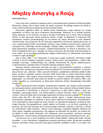 Między Ameryką a Rosją ALEKSANDER GELLA Przez cały okres rozbiorów napisano wiele o konsekwencjach położenia Polski pomiędzy Niemcami a Rosją. Ale w końcu wieku XX należy rozważyć, do jakiego stopnia los Polski (a może i całej Europy) jest funkcją stosunków Ameryka-Rosja. Pierwszym sygnałem faktu, że dalekie Stany Zjednoczone mogą wpłynąć na rozwój wypadków w Polsce, był okres Powstania Styczniowego. Wówczas to w sposób wyraźny Stany pokazały, że ich interesy nie leżą w Europie Centralnej, lecz w Rosji. Gdy krwawiąca Polska na tyle poruszyła opinię publiczną Francji i Anglii, że Napoleon III zapraszał rząd prezydenta Lincolna (prowadzącego już od dwóch lat wojnę domową w imię obalenia niewolnictwa), aby przyłączył się do francusko-angielskich interwencji dyplomatycznych na rzecz masakrowanej Polski, amerykański sekretarz stanu William Seward oprócz zapewnień o przyjaźni dla „dzielnego narodu polskiego, którego błędy, nieszczęścia i dzielność rozbudziły powszechną sympatię w Europie”, wyjaśnił jednocześnie, że wierzy w liberalizm, mądrość i wielkoduszność cara, i dlatego nie uważa za słuszne, aby Ameryka interweniowała na rzecz Polski. Za tę przysługę podziękował rządowi federalnemu ks. Aleksander Gorczakow w imieniu rządu carskiego1. Gdy w lecie 1863 r. car Aleksander II wziął pod uwagę możliwość interwencji Anglii i Francji w formie blokady rosyjskich portów, wydał rozkaz wyprowadzenia z „Morza Bałtyckiego, Czarnego i Śródziemnego tzw. Eskadry Atlantyckiej do Stanów Zjednoczonych, a admirał Popow, dowódca floty na Pacyfiku dostaje podobny rozkaz...”2 Rosyjska eskadra atlantycka schroniła się więc u amerykańskich przyjaciół, a ludność Nowego Jorku zachwycona rosyjskimi oficerami gościła ich hucznymi bankietami, na których pito zdrowie cara „liberała”, który wyzwolił chłopów z poddaństwa (Sielankę zakłócił tylko jeden „przykry” wypadek: pewien marynarz Polak śmiał zbiec ze statku! Naturalnie szybko został złapany i jako zdrajca został powieszony na maszcie rosyjskiego wojennego statku żaglowego). Car pozwolił swej wojennej flotylli na powrót dopiero 26 kwietnia 1864, czyli w dwa tygodnie po aresztowaniu w Warszawie Dyktatora Rządu Narodowego Romualda Traugutta3. Kogo interesują korzenie przyjaźni amerykańsko-rosyjskiej, lub mówiąc ściślej niezupełnie odwzajemnianych sentymentów Ameryki do Rosji, temu polecam lekturę książki Alexisa de Tocquevilla O demokracji w Ameryce. Przypomnę tu tylko jedno zdanie z tego niezwykłego i proroczego dzieła: „Los świata będzie w rękach Ameryki i Rosji: te dwa wielkie narody, z których każdy idzie inną drogą, będą determinować przyszłe wypadki”4. Proroctwo trafne tylko dla XIX i XX wieku. Niemniej jednak zdanie z książki celebrowanej przez Amerykanów wpłynęło na myślenie o Rosji nawet wybitnych przywódców amerykańskich. A ten Amerykanin, który książek nie czyta, wierzył, co najmniej do niedawna, że Rosja to taka druga Ameryka, kraj geograficznie nawet większy od Stanów, a co do Rosji sowieckiej, to przecież, tak samo jak Ameryka, jest to kraj prostego człowieka, wolności i równości, o której my, Amerykanie, tylko mówimy... Myśmy mieli rewolucję i wypędzili Anglików, Rosjanie też mieli swoją i wypędzili wyzyskiwaczy. My sięgamy od Atlantyku do Pacyfiku, oni prawie też, bo Bałtyk to taka zatoka Atlantyku. Oni zbudowali ustrój przyszłości „pierwsze państwo socjalistyczne”, tak jak myśmy zbudowali pierwsze wielkie państwo demokratyczne itd., itp.5 I jest jeszcze coś, o czym się głośno nie mówi. Rosja podbiła i zjednoczyła wiele różnych narodów – a my, Amerykanie, wytępiliśmy wszystkie plemiona Indian, dla garstek ocalałych tworząc rezerwaty. Rosja narzuciła swój język wszystkim podbitym ludom, a my także tym 1/11 stanom, w których dominował francuski, niemiecki czy hiszpański, narzuciliśmy angielski, oczywiście zrobiliśmy to demokratycznie, przez głosowanie, ale cóż – co kraj to obyczaj... W XIX wieku Ameryka była dla Europy tylko potęgą potencjalną. Dopiero w XX wieku ta potencjalność się zaktualizowała. Dwie wojny światowe wprowadziły Stany Zjednoczone na kontynent europejski, ale nie z tymi samymi intencjami. Dla losów Polski polityka amerykańska miała znaczenie nie do przecenienia. Daty trzech krótkich okresów tego stulecia były dla losów narodu i państwa polskiego determinujące. A w każdym z tych okresów stosunek Ameryki do Polski był zgoła odmienny. 1918-1920: okres wyzwalania spod zaborów, tworzenia Drugiej Rzeczypospolitej i zwycięskiej wojny z bolszewicką Rosją. 1939-1945: okres zniszczenia niepodległego bytu II Rzeczypospolitej. 1980-1989: okres załamania komunizmu i powstania III Rzeczypospolitej. Wszystkie te daty odnoszą się do całej Europy środkowo-wschodniej i państw bałtyckich. Jednakże bez trwogi przed zarzutem wysuwania na czoło wydarzeń w tej części świata, przypomnijmy sobie, że od końca XIV wieku historia Polski mocno różni się od historii wszystkich naszych sąsiadów. Na skutek naszej szczególnej historii różni się też naród polski od innych narodów. Naturalnie nikt nie kwestionuje faktu, że różnimy się (nie tylko wadami) od Anglików, Francuzów czy Niemców. Ale w obcych oczach jesteśmy, a co najmniej byliśmy do niedawna postrzegani jako jeden z wielu biednych narodów środkowo-wschodniej Europy, z którymi hedonistyczny Zachód ma ciągle kłopoty. Tak widzą nas nawet niektórzy zachodni politolodzy (do niedawna zwali się sowietologami)6. Naturalnie takie widzenie Polski to nie tylko zła wola i potrzeby dyplomatycznych gier; to także potężna ignorancja historyczna. Obraz środkowo-wschodniej połaci Europy jako terenów zamieszkałych przez wiele słabych ludów w granicach trzech wielkich mocarstw (cesarstwa Habsburgów, cesar