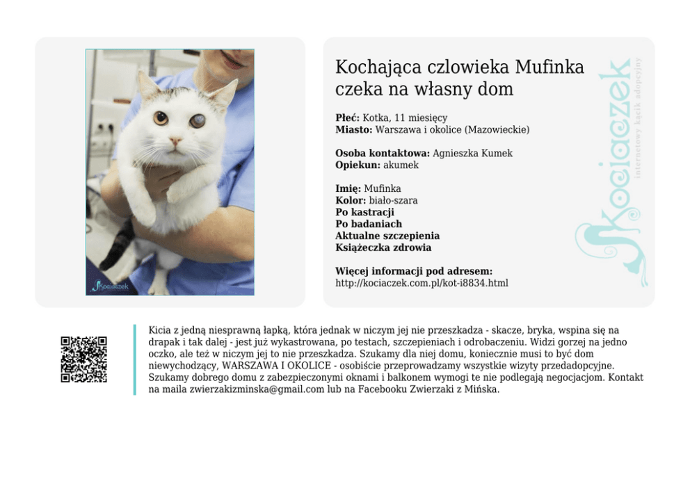 Kochająca czlowieka Mufinka czeka na własny dom Płeć: Kotka, 11 miesięcy Miasto: Warszawa i okolice (Mazowieckie) Osoba kontaktowa: Agnieszka Kumek Opiekun: akumek Imię: Mufinka Kolor: biało-szara Po kastracji Po badaniach Aktualne szczepienia Książeczka zdrowia Więcej informacji pod adresem: http://kociaczek.com.pl/kot-i8834.html Kicia z jedną niesprawną łapką, która jednak w niczym jej nie przeszkadza - skacze, bryka, wspina się na drapak i tak dalej - jest już wykastrowana, po testach, szczepieniach i odrobaczeniu. Widzi gorzej na jedno oczko, ale też w niczym jej to nie przeszkadza. Szukamy dla niej domu, koniecznie musi to być dom niewychodzący, WARSZAWA I OKOLICE - osobiście przeprowadzamy wszystkie wizyty przedadopcyjne. Szukamy dobrego domu z zabezpieczonymi oknami i balkonem wymogi te nie podlegają negocjacjom. Kontakt na maila [email protected] lub na Facebooku Zwierzaki z Mińska.