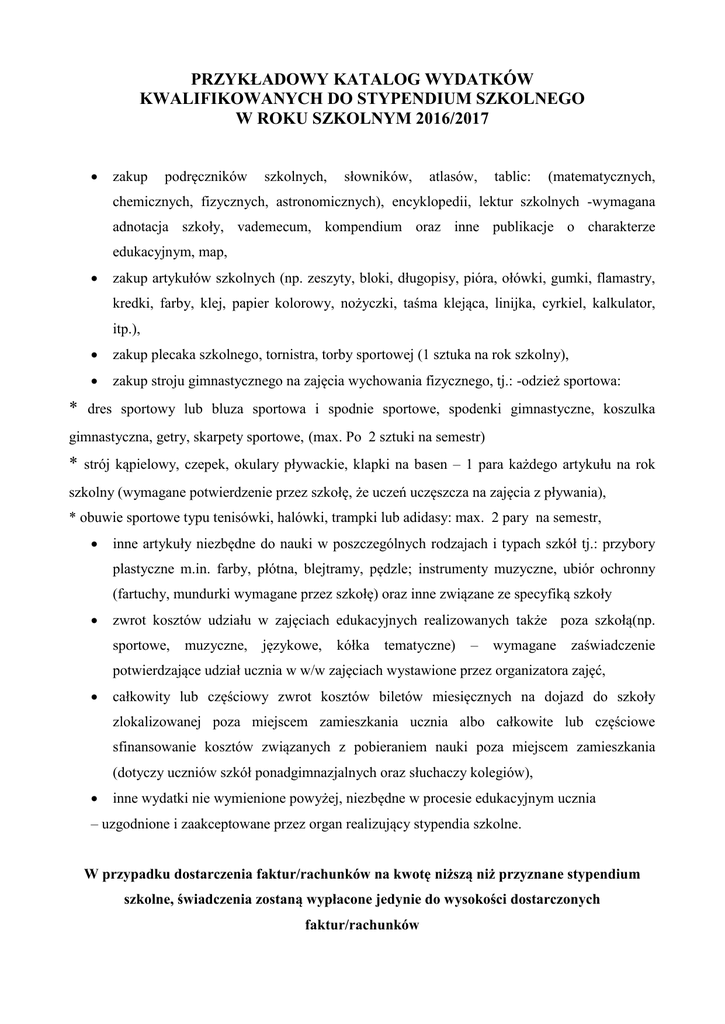 PRZYKŁADOWY KATALOG WYDATKÓW KWALIFIKOWANYCH DO STYPENDIUM SZKOLNEGO W ROKU SZKOLNYM 2016/2017 zakup podręczników szkolnych, słowników, atlasów, tablic: (matematycznych, chemicznych, fizycznych, astronomicznych), encyklopedii, lektur szkolnych -wymagana adnotacja szkoły, vademecum, kompendium oraz inne publikacje o charakterze edukacyjnym, map, zakup artykułów szkolnych (np. zeszyty, bloki, długopisy, pióra, ołówki, gumki, flamastry, kredki, farby, klej, papier kolorowy, nożyczki, taśma klejąca, linijka, cyrkiel, kalkulator, itp.), zakup plecaka szkolnego, tornistra, torby sportowej (1 sztuka na rok szkolny), zakup stroju gimnastycznego na zajęcia wychowania fizycznego, tj.: -odzież sportowa: * dres sportowy lub bluza sportowa i spodnie sportowe, spodenki gimnastyczne, koszulka gimnastyczna, getry, skarpety sportowe, (max. Po 2 sztuki na semestr) * strój kąpielowy, czepek, okulary pływackie, klapki na basen – 1 para każdego artykułu na rok szkolny (wymagane potwierdzenie przez szkołę, że uczeń uczęszcza na zajęcia z pływania), * obuwie sportowe typu tenisówki, halówki, trampki lub adidasy: max. 2 pary na semestr, inne artykuły niezbędne do nauki w poszczególnych rodzajach i typach szkół tj.: przybory plastyczne m.in. farby, płótna, blejtramy, pędzle; instrumenty muzyczne, ubiór ochronny (fartuchy, mundurki wymagane przez szkołę) oraz inne związane ze specyfiką szkoły zwrot kosztów udziału w zajęciach edukacyjnych realizowanych także poza szkołą(np. sportowe, muzyczne, językowe, kółka tematyczne) – wymagane zaświadczenie potwierdzające udział ucznia w w/w zajęciach wystawione przez organizatora zajęć, całkowity lub częściowy zwrot kosztów biletów miesięcznych na dojazd do szkoły zlokalizowanej poza miejscem zamieszkania ucznia albo całkowite lub częściowe sfinansowanie kosztów związanych z pobieraniem nauki poza miejscem zamieszkania (dotyczy uczniów szkół ponadgimnazjalnych oraz słuchaczy kolegiów), inne wydatki nie wymienione powyżej, niezbędne w procesie edukacyjnym ucznia – uzgodnione i zaakceptowane przez organ realizujący stypendia szkolne. W przypadku dostarczenia faktur/rachunków na kwotę niższą niż przyznane stypendium szkolne, świadczenia zostaną wypłacone jedynie do wysokości dostarczonych faktur/rachunków NIE BĘDĄ REFUNDOWANE WYDATKI O CHARAKTERZE NIEEDUKACYJNYM NP. : odzież i obuwie codziennego użytku (np. kurtki, swetry, czapki, sandały, bielizna osobista, rajstopy), stroje odświętne, np. strój pierwszokomunijny, na studniówkę, meble (np. regały na książki, stojaki na płyty, szafy), kamery internetowe, sprzęt rehabilitacyjny, wkładki ortopedyczne, okulary korekcyjne, śpiwory, namioty, obozy i zimowiska rekreacyjne, Wydatkiem niekwalifikowanym są również podręczniki szkolne i lektury szkolne do klasy, do której nie uczęszcza stypendysta. Uwaga! faktury i rachunki powinny być imienne, wystawione na rodzica/opiekuna prawnego lub pełnoletniego ucznia, przyjmowane będą wyłącznie oryginały faktur i rachunków, ważne aby na wystawionej fakturze lub rachunku, np. na spodnie i obuwie, artykuł w nazwie miał adnotację „sportowe” lub „szkolne” (w przypadku niepełnej nazwy towaru wymagana jest odręczna adnotacja sprzedawcy z pieczątką sklepu i imienną pieczątką sprzedawcy – o ile posiada – oraz jego czytelnym podpisem na odwrocie faktury), odbierając fakturę lub rachunek należy zwrócić uwagę na prawidłowe wypisanie faktury w tym na nazwisko, adres zamieszkania, datę sprzedaży oraz nazwę zakupionego artykułu.