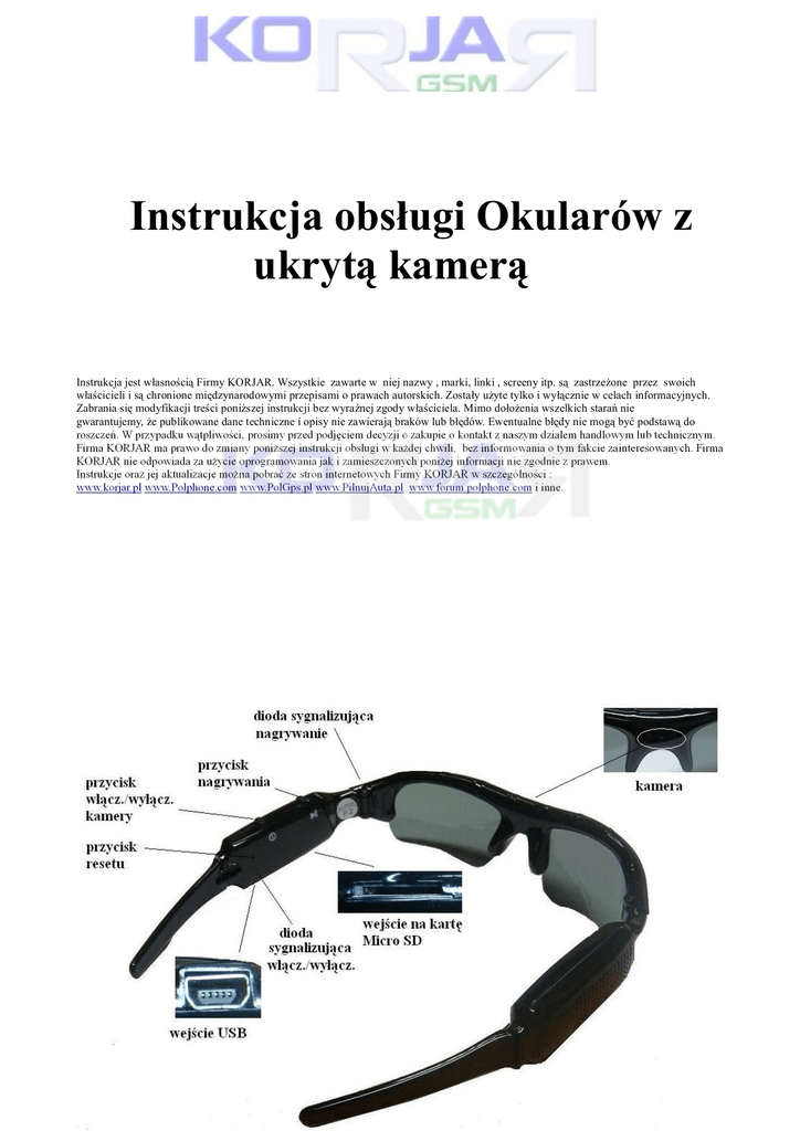 Instrukcja obsługi Okularów z ukrytą kamerą Instrukcja jest własnością Firmy KORJAR. Wszystkie zawarte w niej nazwy , marki, linki , screeny itp. są zastrzeżone przez swoich właścicieli i są chronione międzynarodowymi przepisami o prawach autorskich. Zostały użyte tylko i wyłącznie w celach informacyjnych. Zabrania się modyfikacji treści poniższej instrukcji bez wyraźnej zgody właściciela. Mimo dołożenia wszelkich starań nie gwarantujemy, że publikowane dane techniczne i opisy nie zawierają braków lub błędów. Ewentualne błędy nie mogą być podstawą do 1. Uruchomienie W celu uruchomienia urządzenia, naciśnij przycisk włączenia i przytrzymaj przez 4-5 sekund aż dioda czerwona i niebieska zaczną świecić. Urządzenie zostało włączone. Kiedy niebieska dioda zgaśnie urządzenie jest gotowe do nagrywania. Po uruchomieniu urządzenia ( patrz punkt 1.) naciśnij przycisk nagrywania. Niebieska dioda zacznie mrugać – nagrywanie zostało rozpoczęte – urządzenie działa prawidłowo. c) Zakończenie/zapisanie nagrania Naciśnij przycisk nagrywania , urządzenie zakończy nagrywanie. Niebieska dioda zaświeci się i na kilka sekund – w tym czasie urządzenie zapisuje nagranie. Jeżeli niebieska dioda zgaśnie – urządzenie zapisało poprawnie nagranie i jest gotowe do dalszej pracy. d) Automatyczne wyłączenie Jeżeli urządzenie nie będzie używane przez około 20 sekund , samo automatycznie się wyłączy w celu zaoszczędzenia baterii. Należy wtedy ponownie je uruchomić w celu dalszego nagrywania. 2.Użytkowanie - Urządzenie posiada wbudowaną pamięć Flash o pojemności 4GB . - Pamięć urządzenia można powiększyć za pomocą kart Micro SD. - Podczas procesu zapisywania nagrań , karta Micro SD znajduje się w urządzeniu, filmy będą w pierwszej kolejności zapisywane na karcie Micro SD. Jeżeli pamięć karty będzie już pełna , nagrania będę zapisywane na wbudowanej pamięci urządzenia. - Jeżeli wolne miejsce zostanie już zapełnione, dioda przestanie mrugać i zacznie zapisywać nagranie. Jeżeli wbudowana pamięć jest już pełna, urządzenia wyłączy się po zapisaniu nagrań. - Kartę Micro SD należy wyciągnąć z urządzenia jeżeli jest ono wyłączone – inaczej można uszkodzić urządzenie, kartę Micro SD lub utracić zapisane nagrania. - Przed włożenie karty Micro SD do urządzenia należy ją sformatować. 3.Bateria - Jeżeli urządzenie nie che się włączyć , możliwe że bateria jest już słaba i należy ją naładować. Przy pierwszym ładowaniu należy pamiętać aby prawidłowo sformatować baterie ( 3 razy naładować do pełna baterię – przez ok. 12 godzin- nie ładować dłużej niż 24 godziny!) - Baterie można ładować podłączając urządzenie za pomocą kabla USB do komputera lub do ładowarki sieciowej. Zazwyczaj pełne naładowanie urządzenia trwa 3-4 godziny. - Gdy podłączysz urządzenie do ładowania zaświeci się czerwona dioda , jeżeli bateria zostanie naładowana , czerwona dioda zgaśnie. - Do ładowania należy używać ładowarki załączonej w zestawie w celu uniknięcia uszkodzenia urządzenia. - Jeżeli urządzenie nie było używane przez dłuższy czas , zaleca się naładować baterie przed rozpoczęciem nagrywania. - Zaleca się ładować baterie przy wyłączonym urządzeniu.