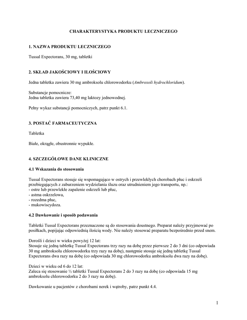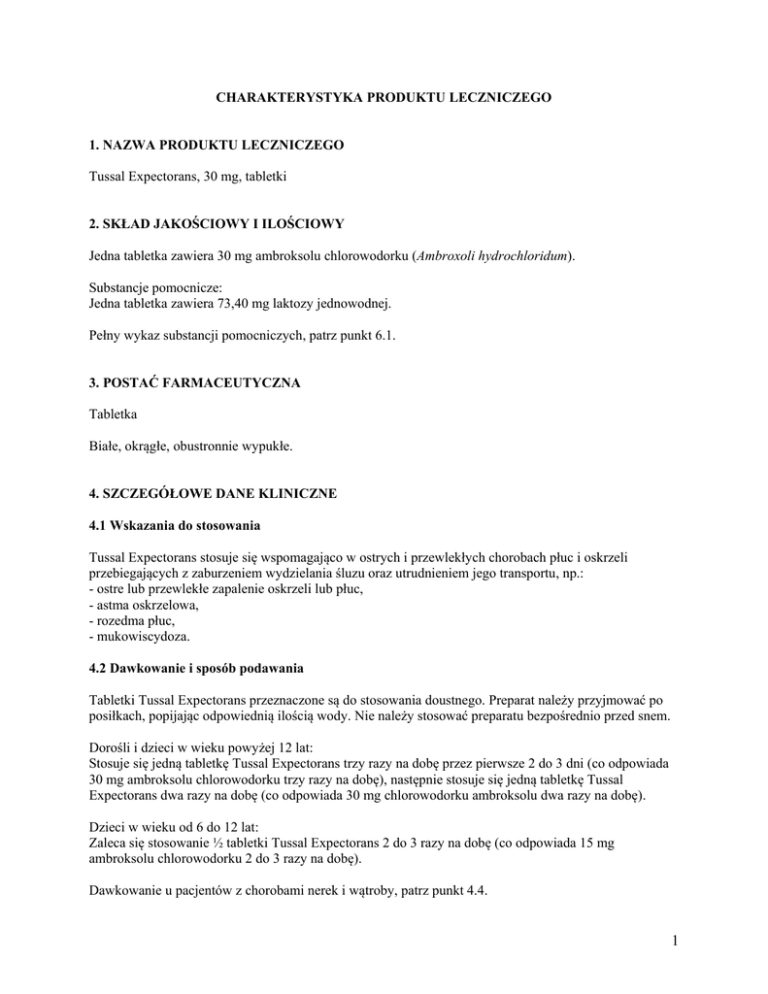 CHARAKTERYSTYKA PRODUKTU LECZNICZEGO 1. NAZWA PRODUKTU LECZNICZEGO Tussal Expectorans, 30 mg, tabletki 2. SKŁAD JAKOŚCIOWY I ILOŚCIOWY Jedna tabletka zawiera 30 mg ambroksolu chlorowodorku (Ambroxoli hydrochloridum). Substancje pomocnicze: Jedna tabletka zawiera 73,40 mg laktozy jednowodnej. Pełny wykaz substancji pomocniczych, patrz punkt 6.1. 3. POSTAĆ FARMACEUTYCZNA Tabletka Białe, okrągłe, obustronnie wypukłe. 4. SZCZEGÓŁOWE DANE KLINICZNE 4.1 Wskazania do stosowania Tussal Expectorans stosuje się wspomagająco w ostrych i przewlekłych chorobach płuc i oskrzeli przebiegających z zaburzeniem wydzielania śluzu oraz utrudnieniem jego transportu, np.: - ostre lub przewlekłe zapalenie oskrzeli lub płuc, - astma oskrzelowa, - rozedma płuc, - mukowiscydoza. 4.2 Dawkowanie i sposób podawania Tabletki Tussal Expectorans przeznaczone są do stosowania doustnego. Preparat należy przyjmować po posiłkach, popijając odpowiednią ilością wody. Nie należy stosować preparatu bezpośrednio przed snem. Dorośli i dzieci w wieku powyżej 12 lat: Stosuje się jedną tabletkę Tussal Expectorans trzy razy na dobę przez pierwsze 2 do 3 dni (co odpowiada 30 mg ambroksolu chlorowodorku trzy razy na dobę), następnie stosuje się jedną tabletkę Tussal Expectorans dwa razy na dobę (co odpowiada 30 mg chlorowodorku ambroksolu dwa razy na dobę). Dzieci w wieku od 6 do 12 lat: Zaleca się stosowanie ½ tabletki Tussal Expectorans 2 do 3 razy na dobę (co odpowiada 15 mg ambroksolu chlorowodorku 2 do 3 razy na dobę). Dawkowanie u pacjentów z chorobami nerek i wątroby, patrz punkt 4.4. 1 Preparatu Tussal Expectorans nie należy stosować u dzieci w wieku poniżej 6 lat. 4.3 Przeciwwskazania Nadwrażliwość na substancję czynną lub na którąkolwiek substancję pomocniczą. Ze względu na dużą zawartość substancji czynnej preparatu Tussal Expectorans nie należy stosować u dzieci w wieku poniżej 6 lat. 4.4 Specjalne ostrzeżenia i środki ostrożności dotyczące stosowania U pacjentów z zaburzeniami czynności nerek lub ciężką chorobą wątroby Tussal Expectorans należy stosować z zachowaniem szczególnej ostrożności (tj. zachowując dłuższe odstępy między dawkami lub stosując mniejsze dawki leku). W ciężkiej niewydolności nerek należy brać pod uwagę możliwość kumulacji metabolitów ambroksolu, które powstały w wątrobie. W związku z tym, iż leki mukolityczne mogą uszkadzać błonę śluzową żołądka, ambroksol należy stosować ostrożnie u pacjentów z chorobą wrzodową żołądka i (lub) dwunastnicy w wywiadzie. Ze względu na możliwość zalegania wydzieliny oskrzelowej, ambroksol należy stosować ostrożnie u pacjentów z zaburzeniami transportu śluzu w oskrzelach. U pacjentów z astmą oskrzelową ambroksol może początkowo nasilać kaszel. Podczas stosowania ambroksolu bardzo rzadko opisywano występowanie ciężkich reakcji skórnych, takich jak zespół Stevensa-Johnsona i zespół Lyella. Dlatego w przypadku wystąpienia nowych zmian w obrębie skóry lub błon śluzowych, pacjent powinien niezwłocznie zgłosić się do lekarza. W takim przypadku należy przerwać stosowanie ambroksolu. Tussal Expectorans zawiera laktozę jednowodną. Pacjenci z rzadkimi dziedzicznymi zaburzeniami związanymi z nietolerancją galaktozy, niedoborem laktazy (typu Lapp) lub zespołem złego wchłaniania glukozy-galaktozy nie powinni stosować tego produktu leczniczego. 4.5 Interakcje z innymi lekami i inne rodzaje interakcji Podawanie ambroksolu z niektórymi antybiotykami (amoksycylina, erytromycyna, ampicylina, doksycyklina i cefuroksym) powoduje zwiększenie stężenia tych antybiotyków w miąższu płucnym i w konsekwencji nasilenie ich działania. Ambroksol i teofilina wzajemnie nasilają swe działanie. Ambroksolu nie należy stosować jednocześnie z lekami przeciwkaszlowymi, ponieważ może dojść do nagromadzenia wydzieliny oskrzelowej w związku z osłabionym odruchem kaszlowym. 4.6 Ciąża i laktacja Ciąża Brak wystarczających danych dotyczących stosowania ambroksolu u kobiet w ciąży. Dotyczy to szczególnie okresu do 28 tygodnia ciąży. W badaniach na zwierzętach ambroksol nie wykazywał działania teratogennego (patrz punkt 5.3). Tussal Expectorans można stosować w okresie ciąży wyłącznie po dokładnej ocenie stosunku korzyści do ryzyka, zwłaszcza w pierwszym trymestrze ciąży. 2 Laktacja Ambroksol przenika do mleka u zwierząt. Ze względu na brak odpowiedniego doświadczenia w stosowaniu ambroksolu u kobiet karmiących piersią, Tussal Expectorans można stosować w okresie karmienia piersią wyłącznie po dokładnej ocenie stosunku korzyści do ryzyka. 4.7 Wpływ na zdolność prowadzenia pojazdów mechanicznych i obsługiwania urządzeń mechanicznych w ruchu Tussal Expectorans nie ma wpływu lub wywiera nieistotny wpływ na zdolność prowadzenia pojazdów mechanicznych i obsługiwania urządzeń mechanicznych w ruchu. 4.8 Działania niepożądane Działania niepożądane związane ze stosowaniem ambroksolu pogrupowano według klasyfikacji MedDRA i częstości występowania. Częstość występowania określono w następujący sposób: bardzo często (1/10); często (1/100 do <1/10); niezbyt często (1/1 000 do <1/100); rzadko (1/10 000 do <1/1 000); bardzo rzadko (<1/10 000); nie znana (częstość nie może być określona na podstawie dostępnych danych). Zaburzenia żołądka i jelit: Często: biegunka. Niezbyt często: nudności, bóle brzucha, wymioty. Rzadko: zgaga Zaburzenia skóry i tkanki podskórnej: Bardzo rzadko: ciężkie reakcje skórne, takie jak zespół Stevensa-Johnsona i martwica naskórka (patrz punkt 4.4). Zaburzenia ogólne i stany w miejscu podania: Niezbyt często: reakcje nadwrażliwości (wysypka skórna, obrzęk naczynioruchowy, zaburzenia oddechowe, świąd), gorączka. Bardzo rzadko: reakcje anafilaktyczne, w tym wstrząs anafilaktyczny. 4.9 Przedawkowanie a) Objawy przedawkowa