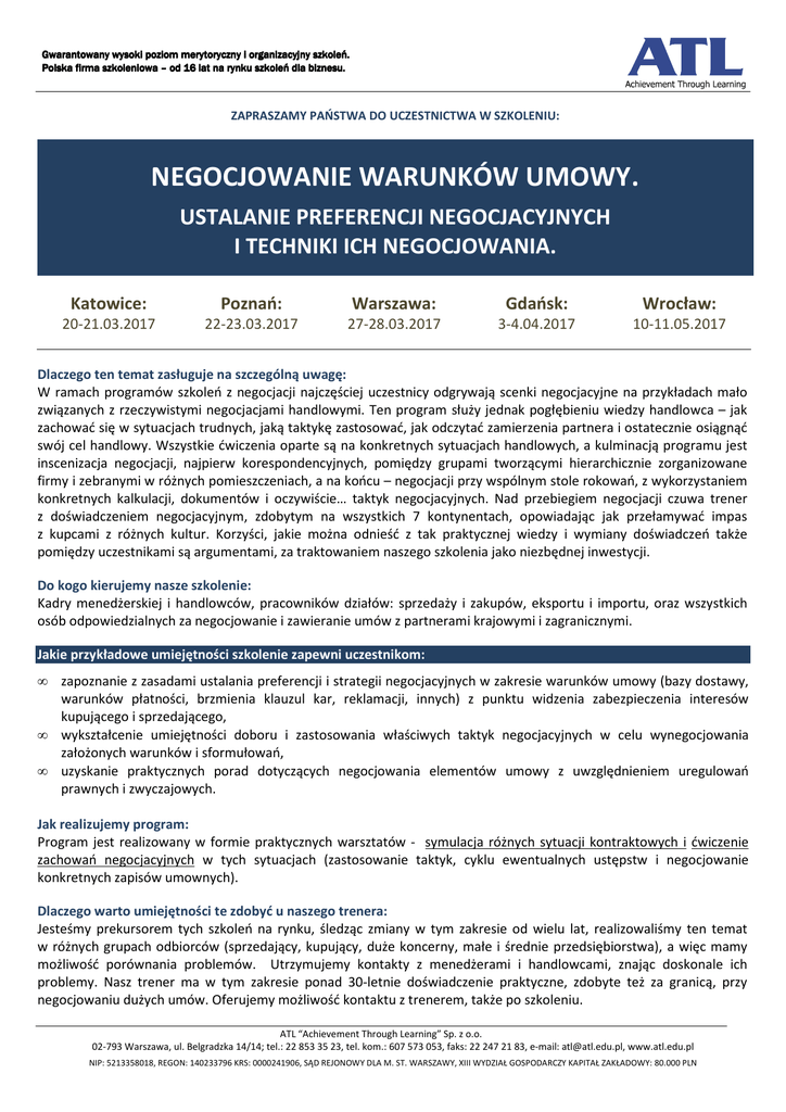Gwarantowany wysoki poziom merytoryczny i organizacyjny szkoleń. Polska firma szkoleniowa – od 16 lat na rynku szkoleń dla biznesu. ZAPRASZAMY PAŃSTWA DO UCZESTNICTWA W SZKOLENIU: NEGOCJOWANIE WARUNKÓW UMOWY. USTALANIE PREFERENCJI NEGOCJACYJNYCH I TECHNIKI ICH NEGOCJOWANIA. Katowice: Poznań: Warszawa: Gdańsk: Wrocław: 20-21.03.2017 22-23.03.2017 27-28.03.2017 3-4.04.2017 10-11.05.2017 Dlaczego ten temat zasługuje na szczególną uwagę: W ramach programów szkoleń z negocjacji najczęściej uczestnicy odgrywają scenki negocjacyjne na przykładach mało związanych z rzeczywistymi negocjacjami handlowymi. Ten program służy jednak pogłębieniu wiedzy handlowca – jak zachować się w sytuacjach trudnych, jaką taktykę zastosować, jak odczytać zamierzenia partnera i ostatecznie osiągnąć swój cel handlowy. Wszystkie ćwiczenia oparte są na konkretnych sytuacjach handlowych, a kulminacją programu jest inscenizacja negocjacji, najpierw korespondencyjnych, pomiędzy grupami tworzącymi hierarchicznie zorganizowane firmy i zebranymi w różnych pomieszczeniach, a na końcu – negocjacji przy wspólnym stole rokowań, z wykorzystaniem konkretnych kalkulacji, dokumentów i oczywiście… taktyk negocjacyjnych. Nad przebiegiem negocjacji czuwa trener z doświadczeniem negocjacyjnym, zdobytym na wszystkich 7 kontynentach, opowiadając jak przełamywać impas z kupcami z różnych kultur. Korzyści, jakie można odnieść z tak praktycznej wiedzy i wymiany doświadczeń także pomiędzy uczestnikami są argumentami, za traktowaniem naszego szkolenia jako niezbędnej inwestycji. Do kogo kierujemy nasze szkolenie: Kadry menedżerskiej i handlowców, pracowników działów: sprzedaży i zakupów, eksportu i importu, oraz wszystkich osób odpowiedzialnych za negocjowanie i zawieranie umów z partnerami krajowymi i zagranicznymi. Jakie przykładowe umiejętności szkolenie zapewni uczestnikom: • • • zapoznanie z zasadami ustalania preferencji i strategii negocjacyjnych w zakresie warunków umowy (bazy dostawy, warunków płatności, brzmienia klauzul kar, reklamacji, innych) z punktu widzenia zabezpieczenia interesów kupującego i sprzedającego, wykształcenie umiejętności doboru i zastosowania właściwych taktyk negocjacyjnych w celu wynegocjowania założonych warunków i sformułowań, uzyskanie praktycznych porad dotyczących negocjowania elementów umowy z uwzględnieniem uregulowań prawnych i zwyczajowych. Jak realizujemy program: Program jest realizowany w formie praktycznych warsztatów - symulacja różnych sytuacji kontraktowych i ćwiczenie zachowań negocjacyjnych w tych sytuacjach (zastosowanie taktyk, cyklu ewentualnych ustępstw i negocjowanie konkretnych zapisów umownych). Dlaczego warto umiejętności te zdobyć u naszego trenera: Jesteśmy prekursorem tych szkoleń na rynku, śledząc zmiany w tym zakresie od wielu lat, realizowaliśmy ten temat w różnych grupach odbiorców (sprzedający, kupujący, duże koncerny, małe i średnie przedsiębiorstwa), a więc mamy możliwość porównania problemów. Utrzymujemy kontakty z menedżerami i handlowcami, znając doskonale ich problemy. Nasz trener ma w tym zakresie ponad 30-letnie doświadczenie praktyczne, zdobyte też za granicą, przy negocjowaniu dużych umów. Oferujemy możliwość kontaktu z trenerem, także po szkoleniu. ATL “Achievement Through Learning” Sp. z o.o. 02-793 Warszawa, ul. Belgradzka 14/14; tel.: 22 853 35 23, tel. kom.: 607 573 053, faks: 22 247 21 83, e-mail: [email protected], www.atl.edu.pl NIP: 5213358018, REGON: 140233796 KRS: 0000241906, SĄD REJONOWY DLA M. ST. WARSZAWY, XIII WYDZIAŁ GOSPODARCZY KAPITAŁ ZAKŁADOWY: 80.000 PLN Gwarantowany wysoki poziom merytoryczny i organizacyjny szkoleń. Polska firma szkoleniowa – od 16 lat na rynku szkoleń dla biznesu. PROGRAM SZKOLENIA: Przygotowanie do negocjowania warunków umowy pod kątem uwarunkowań prawnych, procedur handlowych i psychologii negocjacji i perswazji. Rekwizyty uzasadniające stanowisko negocjacyjne – rodzaje i koncepcje ich użycia. Określenie preferencji negocjacyjnych, strategii i pozycji wyjściowej przez kupującego. Ustalenie ryzyk, preferencji, strategii i propozycji wyjściowej przez sprzedającego. Zasady oceny stanowiska partnera, w tym z wykorzystaniem taktyki próbnego balona i innych. Negocjowanie warunków umowy na etapie ofertowym. Wykorzystanie uregulowań prawnych i zwyczajowych do zabezpieczania swoich interesów w zawieranej umowie. Negocjacyjne wykorzystanie zapytania ofertowego do narzucania ogólnej koncepcji umowy. Zasady negocjowania oferty, w tym formułowania monitów. Negocjowanie warunków ogólnych (OWS/OWZ) w formie korespondencyjnej w świetle odejścia od zasady lustrzanego odbicia przy przyjęciu oferty. Kwestia reprezentacji stron a taktyka niepełnego pełnomocnictwa. Negocjacje cenowe z wykorzystaniem taktyk skubania, pustego portfela, konkurencji, optyka… Zasady negocjowania klauzul zasadniczych umowy, w tym możliwości rewizji ceny. Ustalanie zasad negocjowania bazy dostawy, w tym preferencje w zakresie baz Incoterms®2010 Zastosowanie taktyki zdechłej ryby (i innych) przy negocjowaniu warunków płatności i kwestii ponoszenia kosztów z tym związanych. Negocjowanie kredytu kupieckiego w świetle postanowień Ustawy o terminach zapłaty. Specyficzne taktyki przy negocjowaniu kar umownych i zasad zwalniania od odpowiedzialności. Taktyka rosyjskiego frontu przy ustalaniu limitów odpowiedzialności partnera. Wykorzystanie konwencji CISG przy negocjowaniu zasad dochodzenia reklamacji. Taktyka obejścia przy negocjowaniu prawa właściwego w umowie z partnerem zagranicznym. ANALIZA PRZYPADKÓW (CASE STUDY): ćwiczenie zachowań negocjacyjnych (przy wspólnym stole rokowań na przykładzie konkretnej umowy) symulacja zachowań w różnych sytuacjach kontraktowych (na przykładach) Uczestnicy otrzymują komplet materiałów do wykorzystania w praktyce. DODATKOWO!