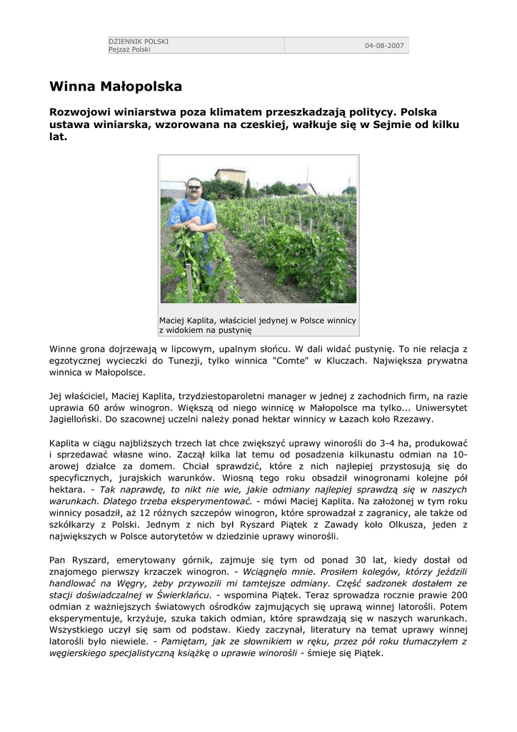 DZIENNIK POLSKI PejzaŜ Polski 04-08-2007 Winna Małopolska Rozwojowi winiarstwa poza klimatem przeszkadzają politycy. Polska ustawa winiarska, wzorowana na czeskiej, wałkuje się w Sejmie od kilku lat. Maciej Kaplita, właściciel jedynej w Polsce winnicy z widokiem na pustynię Winne grona dojrzewają w lipcowym, upalnym słońcu. W dali widać pustynię. To nie relacja z egzotycznej wycieczki do Tunezji, tylko winnica "Comte" w Kluczach. Największa prywatna winnica w Małopolsce. Jej właściciel, Maciej Kaplita, trzydziestoparoletni manager w jednej z zachodnich firm, na razie uprawia 60 arów winogron. Większą od niego winnicę w Małopolsce ma tylko... Uniwersytet Jagielloński. Do szacownej uczelni naleŜy ponad hektar winnicy w Łazach koło Rzezawy. Kaplita w ciągu najbliŜszych trzech lat chce zwiększyć uprawy winorośli do 3-4 ha, produkować i sprzedawać własne wino. Zaczął kilka lat temu od posadzenia kilkunastu odmian na 10arowej działce za domem. Chciał sprawdzić, które z nich najlepiej przystosują się do specyficznych, jurajskich warunków. Wiosną tego roku obsadził winogronami kolejne pół hektara. - Tak naprawdę, to nikt nie wie, jakie odmiany najlepiej sprawdzą się w naszych warunkach. Dlatego trzeba eksperymentować. - mówi Maciej Kaplita. Na załoŜonej w tym roku winnicy posadził, aŜ 12 róŜnych szczepów winogron, które sprowadzał z zagranicy, ale takŜe od szkółkarzy z Polski. Jednym z nich był Ryszard Piątek z Zawady koło Olkusza, jeden z największych w Polsce autorytetów w dziedzinie uprawy winorośli. Pan Ryszard, emerytowany górnik, zajmuje się tym od ponad 30 lat, kiedy dostał od znajomego pierwszy krzaczek winogron. - Wciągnęło mnie. Prosiłem kolegów, którzy jeździli handlować na Węgry, Ŝeby przywozili mi tamtejsze odmiany. Część sadzonek dostałem ze stacji doświadczalnej w Świerklańcu. - wspomina Piątek. Teraz sprowadza rocznie prawie 200 odmian z waŜniejszych światowych ośrodków zajmujących się uprawą winnej latorośli. Potem eksperymentuje, krzyŜuje, szuka takich odmian, które sprawdzają się w naszych warunkach. Wszystkiego uczył się sam od podstaw. Kiedy zaczynał, literatury na temat uprawy winnej latorośli było niewiele. - Pamiętam, jak ze słownikiem w ręku, przez pół roku tłumaczyłem z węgierskiego specjalistyczną ksiąŜkę o uprawie winorośli - śmieje się Piątek. Czy winnice i produkcja wina mogą stać się szansą dla właścicieli pochyłych, dobrze nasłonecznionych gruntów na Jurze Krakowsko-Częstochowskiej? - Skoro przed wiekami na Jurze była uprawiana winna latorośl, to moŜe być i teraz. Nie przypadkiem góra za moim domem w Kluczach nazywa się "Winnica" - wyjaśnia Maciej Kaplita. Polska, o czym mało kto wie, ma duŜe tradycje winiarskie. Co więcej, za czasów Kazimierza Wielkiego Polska była eksporterem wina. Pierwsze wzmianki o winnicach w okolicach Krakowa pochodzą z IX wieku. Potem winnice zaczęły powstawać przy klasztorach, zamkach i siedzibach biskupich. Największe uprawy były w okolicach Krakowa, Płocka, Sandomierza, Poznania, Torunia i Lwowa. Winną latorośl uprawiano takŜe w Małopolsce Zachodniej. Po winnicach sprzed wieków pozostały charakterystyczne tarasy, które moŜna oglądać po dziś dzień pod Chrzanowem czy Krzeszowicami. - Kiedy w XVI wieku sprzedawano wieś Karniowice, to 90 proc. jej wartości stanowiła winnica, a pozostałe 10 procent cała reszta, czyli chłopi, pola i inwentarz - mówi Piątek. Upadek polskich winnic rozpoczął się pod koniec XVI wieku. Rodzime wina wypierały zagraniczne trunki, a przede wszystkim gorzałka. Po drugiej wojnie światowej uprawiano jeszcze ponad 200 ha w rejonie Zielonej Góry i 50 ha w okolicach Warki. Później, w latach 50. i 60. snuto plany odrodzenia polskiego winiarstwa. Chciano obsadzić winną latoroślą tysiące hektarów na przestrzeni kilkudziesięciu kilometrów wzdłuŜ południowego koryta Pilicy. Jednak plany spaliły na panewce i na początku lat 60. ubiegłego wieku w naszym kraju pozostało tylko 30 ha winnic, a potem i one znikły. Renesans winiarstwa rozpoczął się przed kilkunastu laty. - PrzyjeŜdŜa do mnie coraz więcej właścicieli gospodarstw agroturystycznych z całej Polski, którzy zamawiają na ogół sto sadzonek "deserów", czyli winogron jadalnych i 300400 takich do produkcji wina dla gości. Bo gospodarstwa agroturystyczne mogą sprzedawać wino gościom bez akcyzy, jest ono traktowane jako "składnik poŜywienia". Ostatnimi laty coraz więcej osób zamawia po kilkaset sadzonek typowo na winnicę - mówi Piątek. Przyznaje zresztą, Ŝe wiedza nabywców na temat uprawy winorośli nie zawsze idzie w parze z zasobnością portfela. - Miałem ostatnio propozycję załoŜenia z własnych sadzonek kilkuhektarowej winnicy pod Toruniem. Właściciel chciał tam posadzić odmianę chardoney, ale mu wytłumaczyłem, Ŝe okres dojrzewania będzie miał koło BoŜego Narodzenia - śmieje się Piątek. Wiele osób zraziło się do sadzenia winorośli, po pierwszych próbach, gdy przymrozki zniszczyły plon kilkuletniej pracy. - Wiele złego narobiły sieci marketów. Przed kilkoma laty sprzedawano tam bardzo tanio sadzonki sprowadzane z Niemiec. Były to odmiany, które zupełnie nie nadawały się do naszego klimatu. Ale ludzie kupowali, bo były tanie, a potem się dziwili, Ŝe im wszystko przemarzło. No i zrazili się do uprawy winogron - mówi Piątek. On sam najbardziej ceni odmiany wschodnie z terenów byłego ZSRR. Są odporne na temperatury i choroby oraz bardzo plenne. Dlatego poszukuje odmian, które połączą odporność, plenność i smak krzyŜowanych szczepów. - Pierwsza była "Czekoladowa". Nazwałem ją tak, bo w smaku przypominała czekoladę "studencką" z rodzynkami przywoŜoną z Czech. - wyjaśnia Ryszard Piątek. "Czekoladowa" to jego pierwsza autorska odmiana winogron. Wyhodował ją w 1988 roku. Teraz ma na swoim koncie tak
