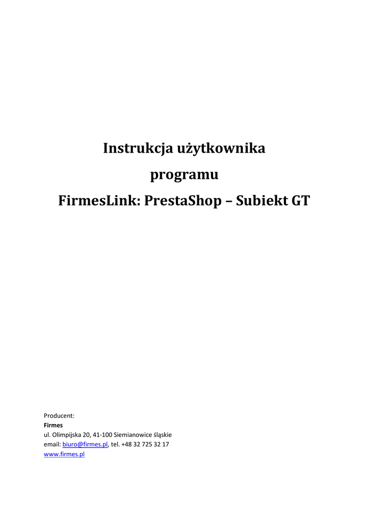 Instrukcja użytkownika programu FirmesLink: PrestaShop – Subiekt GT Producent: Firmes ul. Olimpijska 20, 41-100 Siemianowice śląskie email: [email protected], tel. +48 32 725 32 17 www.firmes.pl Spis treści Wstęp ...................................................................................................................................................... 3 Instalacja programu................................................................................................................................. 3 Aplikacja Windows .............................................................................................................................. 3 API Komunikacyjne .............................................................................................................................. 3 Konfiguracja połączenia z bazą programu Subiekt GT ........................................................................ 4 Licencja programu ............................................................................................................................... 5 Budowa programu FirmesLink ................................................................................................................ 5 Konfiguracja programu FirmesLink ......................................................................................................... 6 Zakładka Synchronizacja.................................................................................................................. 6 Zakładka Subiekt GT ........................................................................................................................ 6 Zakładka Klienci ............................................................................................................................... 7 Zakładka Produkty ........................................................................................................................... 8 Zakładka Magazyn ........................................................................................................................... 9 Zakładka Dostępność ....................................................................................................................... 9 Zakładka Ceny ................................................................................................................................ 10 Zakładka Eksport ........................................................................................................................... 11 Zakładka Warianty ......................................................................................................................... 13 Zakładka Powiązania ..................................................................................................................... 14 Zakładka Statusy ............................................................................................................................ 14 Scenariusze pracy z programem............................................................................................................ 15 Nowy sklep internetowy, istniejący Subiekt ..................................................................................... 15 Istniejący sklep internetowy, nowy Subiekt ...................................................................................... 15 Istniejący sklep internetowy, istniejący Subiekt................................................................................ 15 Nowy sklep internetowy, nowy Subiekt ............................................................................................ 16 Wprowadzenie produktów z wariantami w Subiekcie ...................................................................... 16 Wstęp FirmesLink umożliwia zintegrowanie (połączenie) sklepu internetowego PrestaShop z programem Subiekt GT. Integracja umożliwia automatyczną wymianę danych pomiędzy systemami. Program przesyła zamówienia, dane klientów, towary oraz aktualizuje ceny i stany magazynowe. Instalacja programu FirmesLink składa się z dwóch elementów: aplikacji Windows instalowanej na komputerze z dostępem do bazy programu Subiekt oraz API komunikacyjnego wgrywanego po stronie sklepu. Przed instalacją programu należy wykonać kopię zapasową bazy Subiekta. Aplikacja Windows Do poprawnego działania program wymaga komputera z zainstalowanym systemem operacyjnym Windows (XP SP3, Vista, Windows 7, Windows Server 2003, Windows Server 2008) i Microsoft .NET Framework 4.0. Microsoft .NET Framework 4.0 jest całkowicie darmowy. Można go pobrać ze stron Microsoft lub ze strony http://www.firmes.pl/files/dotnet40-full.zip Należy zwrócić uwagę na fakt, że .NET Framework 4.0 występuje w dwóch wersjach – pełnej oraz „client profile”. Program FirmesLink wymaga wersji pełnej. Program może być zainstalowany na dowolnym komputerze z dostępem do bazy danych programu Subiekt. Zaleca się instalację programu na komputerze, na którym jest zainstalowana baza danych programu Subiekt (Microsoft SQL Server). Zapewni to najlepszą pracę programu. Do pracy programu konieczne jest skonfigurowanie połączenia z bazą danych Subiekta GT oraz aktywacja licencji programu. Program przeprowadzi użytkownika przez te kroki podczas pierwszego uruchomienia. API Komunikacyjne API komunikacyjne to zestaw skryptów w języku PHP, których zadaniem jest umożliwienie komunikacji programu FirmesLink z bazą danych sklepu. Pliki API komunikacyjnego są dostarczane w archiwum zip (plik api.zip). Archiwum zip należy rozpakować i jego zawartość umieścić jako podkatalog o nazwie „api” w katalogu „admin” sklepu. Z uwagi na fakt, że PrestaShop wymaga zmiany nazwy katalogu „admin”, należy odpowiednio zmodyfikować podaną w instrukcji ścieżkę. Pliki API są zakodowane i wymagają do działania rozszerzenia PHP IonCubeLoader (większość popularnych kont hostingowych ma standardowo włączony Ion