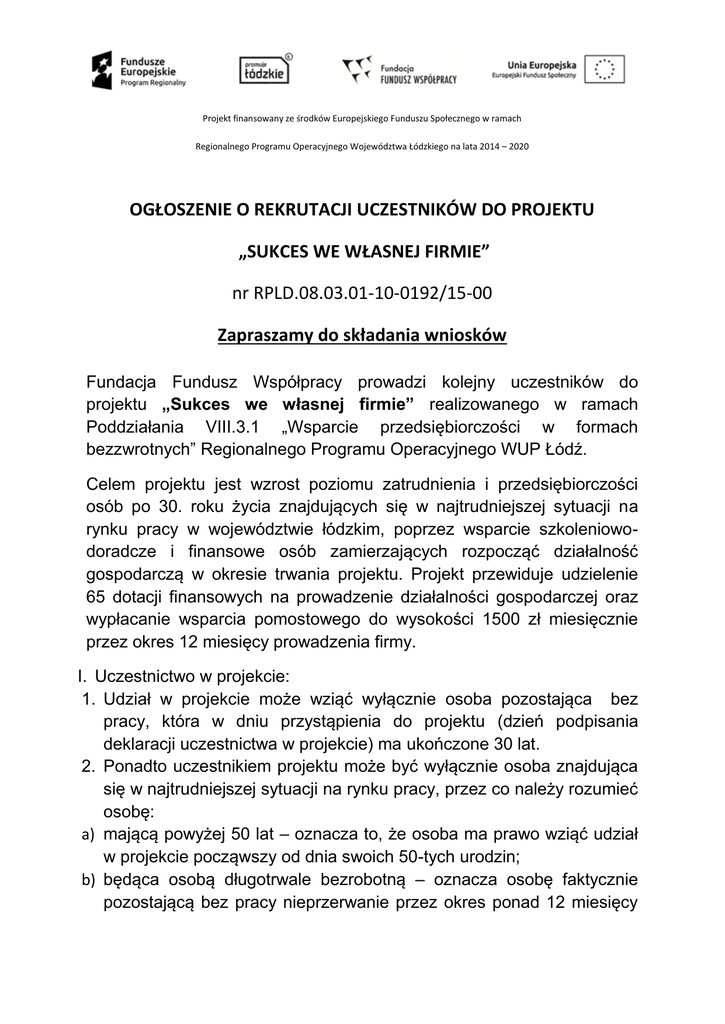 Projekt finansowany ze środków Europejskiego Funduszu Społecznego w ramach Regionalnego Programu Operacyjnego Województwa Łódzkiego na lata 2014 – 2020 OGŁOSZENIE O REKRUTACJI UCZESTNIKÓW DO PROJEKTU „SUKCES WE WŁASNEJ FIRMIE” nr RPLD.08.03.01-10-0192/15-00 Zapraszamy do składania wniosków Fundacja Fundusz Współpracy prowadzi kolejny uczestników do projektu „Sukces we własnej firmie” realizowanego w ramach Poddziałania VIII.3.1 „Wsparcie przedsiębiorczości w formach bezzwrotnych” Regionalnego Programu Operacyjnego WUP Łódź. Celem projektu jest wzrost poziomu zatrudnienia i przedsiębiorczości osób po 30. roku życia znajdujących się w najtrudniejszej sytuacji na rynku pracy w województwie łódzkim, poprzez wsparcie szkoleniowodoradcze i finansowe osób zamierzających rozpocząć działalność gospodarczą w okresie trwania projektu. Projekt przewiduje udzielenie 65 dotacji finansowych na prowadzenie działalności gospodarczej oraz wypłacanie wsparcia pomostowego do wysokości 1500 zł miesięcznie przez okres 12 miesięcy prowadzenia firmy. I. Uczestnictwo w projekcie: 1. Udział w projekcie może wziąć wyłącznie osoba pozostająca bez pracy, która w dniu przystąpienia do projektu (dzień podpisania deklaracji uczestnictwa w projekcie) ma ukończone 30 lat. 2. Ponadto uczestnikiem projektu może być wyłącznie osoba znajdująca się w najtrudniejszej sytuacji na rynku pracy, przez co należy rozumieć osobę: a) mającą powyżej 50 lat – oznacza to, że osoba ma prawo wziąć udział w projekcie począwszy od dnia swoich 50-tych urodzin; b) będąca osobą długotrwale bezrobotną – oznacza osobę faktycznie pozostającą bez pracy nieprzerwanie przez okres ponad 12 miesięcy przed przystąpieniem do projektu, nie ma przy tym znaczenia fakt zarejestrowania w powiatowym urzędzie; c) będąca kobietą; d) będąca osobą z niepełnosprawnościami, przez co rozumie się: osobę, której niepełnosprawność została potwierdzona orzeczeniem: • o zakwalifikowaniu przez organy orzekające do jednego z trzech stopni niepełnosprawności, • o całkowitej lub częściowej niezdolności do pracy na podstawie odrębnych przepisów, • o niepełnosprawności, wydanym przed ukończeniem 16 roku życia, bądź osobę z zaburzeniami psychicznymi, przez co rozumie się osobę: • chorą psychicznie (wykazującej zaburzenia psychotyczne), • upośledzoną umysłowo, • wykazującą inne zakłócenia czynności psychicznych, które zgodnie ze stanem wiedzy medycznej zaliczane są do zaburzeń psychicznych, a osoba ta wymaga świadczeń zdrowotnych lub innych form pomocy i opieki niezbędnych do życia w środowisku rodzinnym lub społecznym; e) będąca osobą o niskich kwalifikacjach – rozumie się przez to osobę bez wykształcenia, lub osobę z wykształceniem podstawowym, gimnazjalnym, ponadgimnazjalnym ogólnokształcącym, ponadgimnazjalnym zawodowym, zasadniczym zawodowym. 3. Uczestnikiem projektu może być wyłącznie osoba, która uczy się, lub zamieszkuje na obszarze województwa łódzkiego w rozumieniu przepisów Kodeksu Cywilnego. 4. Uczestnikiem projektu może być wyłącznie osoba, która zamierza zarejestrować działalność gospodarczą na terenie woj. łódzkiego. 5. Do projektu zostanie przyjętych 80 osób w tym min. 55 kobiet. II. Szczegółowe wytyczne dotyczące zgłaszania się do udziału w projekcie oraz udziału w nim określa Regulamin rekrutacji do projektu „Sukces we własnej firmie” dostępny stronach internetowych www.swwf.pl i www.cofund.org.pl/projekty/sukces-we-wlasnej-firmie oraz w biurze projektu. III. Składanie formularzy rekrutacyjnych 1. Formularz rekrutacyjny należy złożyć w biurze projektu lub przesłać do biura projektu pocztą tradycyjną. O terminie zakończenia naboru poinformujemy z 5-dniowym wyprzedzeniem. W przypadku przesłania drogą pocztową decyduje data wpływu formularza do realizatora projektu. Do wydrukowanego i podpisanego imieniem i nazwiskiem formularza należy dołączyć jego wersję elektroniczną na płycie CD także podpisanej imieniem i nazwiskiem kandydata/kandydatki. 2. Wzór formularza rekrutacyjnego oraz wzór oświadczenia osoby nieaktywnej zawodowo dostępne są w biurze projektu oraz na stronie internetowej projektu (na stronie FFW www.cofund.org.pl/projekty/sukces-we-wlasnej-firmie lub www.swwf.pl). IV. Potrzebne adresy: Projekt realizowany jest przez Fundację Fundusz Współpracy, ul. Górnośląska 4a, 00-444 Warszawa. Biuro projektu mieści się przy ul. Wólczańskiej 51, 90-608 Łódź, godziny przyjęć 8:00 – 16:00. Więcej informacji można uzyskać pod numerem telefonu +48 22 4509867/ +48 885 243 187/ +48 698 376 606 lub adresem e-mail [email protected] / [email protected].