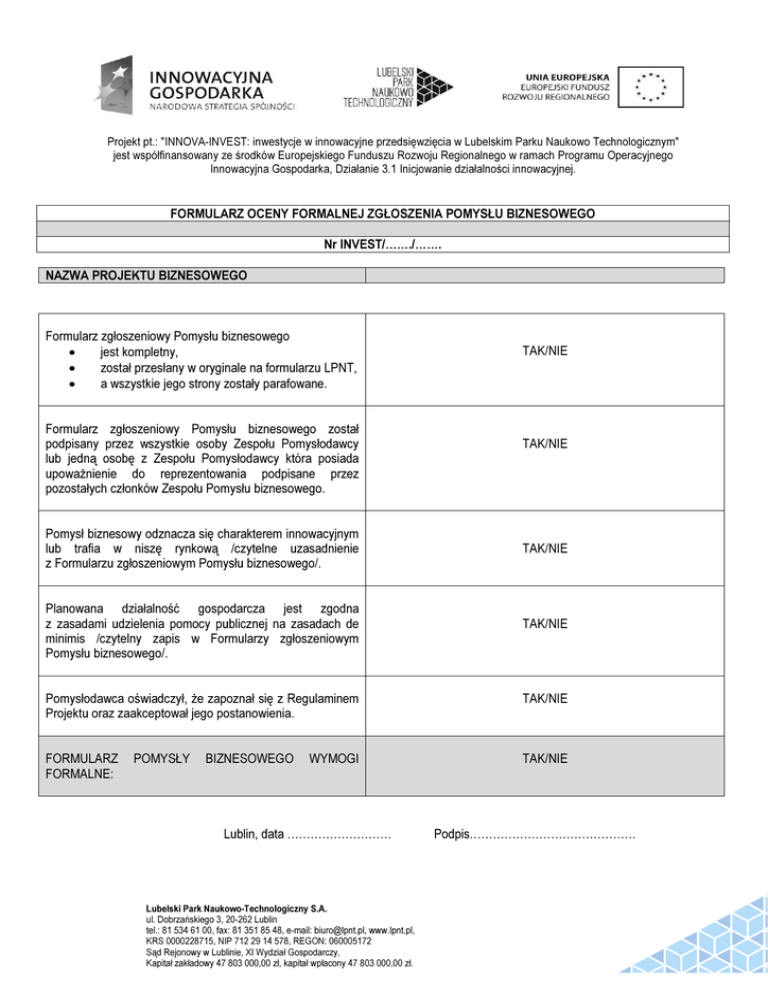 Formularz oceny formalnej i merytorycznej - Innova-Invest