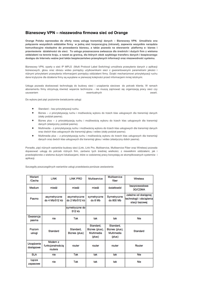 Biznesowy VPN – niezawodna firmowa sieć od Orange Orange Polska wprowadza do oferty nową usługę transmisji danych – Biznesowy VPN. Umożliwia ona połączenie wszystkich oddziałów firmy w jedną sieć korporacyjną (intranet), zapewnia wszystkie narzędzia komunikacyjne niezbędne do prowadzenia biznesu, a także pozwala na stworzenie platformy e- biznes i przeniesienie działalności do sieci. To usługa przeznaczona zwłaszcza dla średnich i dużych firm z wieloma oddziałami na terenie kraju, a nawet za granicą, dla których obok szybkiego transferu danych i bezpiecznego dostępu do Internetu ważne jest także bezpieczeństwo przesyłanych informacji oraz niezawodność systemu. Biznesowy VPN, oparty o sieć IP MPLS (Multi Protocol Label Switching) umożliwia przesyłanie danych z aplikacji biznesowych, głosu oraz obrazu wideo pomiędzy użytkownikami sieci z gwarantowanymi parametrami jakości i różnymi priorytetami przesyłania informacjami pomiędzy oddziałami firmy. Dzięki mechanizmowi priorytetyzacji ruchu dane krytyczne dla działania firmy są wysyłane w pierwszej kolejności przed informacjami mniej istotnymi. Usługa pozwala dostosować technologię do budowy sieci i urządzenia sieciowe do potrzeb klienta. W ramach abonamentu firmy otrzymują również wsparcie techniczne - nie muszą zajmować się organizacją pracy sieci czy usuwaniem ewentualnych awarii. Do wyboru jest pięć poziomów świadczenie usługi: Standard – bez priorytetyzacji ruchu. Biznes – z priorytetyzacją ruchu i możliwością wyboru do trzech klas usługowych dla transmisji danych (stały podział pasma). Biznes plus – z priorytetyzacją ruchu i możliwością wyboru do trzech klas usługowych dla transmisji danych (elastyczny podział pasma). Multimedia - z priorytetyzacją ruchu i możliwością wyboru do trzech klas usługowych dla transmisji danych oraz dwóch klas usługowych dla transmisji głosu i wideo (stały podział pasma). Multimedia plus – z priorytetyzacją ruchu i możliwością wyboru do trzech klas usługowych dla transmisji danych oraz dwóch klas usługowych dla transmisji głosu i wideo (elastyczny dobór pasma). Ponadto, pięć różnych wariantów budowy sieci (Link, Link Pro, Multiservice, Multiservice Fiber oraz Wireless) pozwala dopasować usługę do potrzeb różnych firm, zarówno tych średniej wielkości, z niewielkimi oddziałami, jak i przedsiębiorstw z wieloma dużymi lokalizacjami, które w codziennej pracy korzystają ze skomplikowanych systemów i aplikacji. Szczegóły poszczególnych wariantów usługi przedstawia poniższe zestawienie: Dodatkowo, dla zapewnienia jeszcze większej niezawodności działania Biznesowego VPN, możliwe jest zainstalowane łącza zapasowego - o tych samych parametrach co łącze podstawowe lub w postaci łącza ISDN bądź bezprzewodowego- 3G/CDMA. Łącze zapasowe pracuje w trybie "hot stand-by", czyli przejmuje zadania łącza podstawowego tylko w przypadku jego awarii. Z kolei dodatkowa usługa Modular VPN pozwala na wydzielenie kilku podsieci w ramach jednego VPN, całkowicie odseparowanych od siebie. Dzięki takiemu rozwiązaniu pracownicy różnych działów tej samej firmy mogą pracować w sieci jako dwie oddzielne, nie mające z sobą kontaktu grupy użytkowników, pomimo że firma płaci tylko za jedną usługę VPN. Biznesowy VPN jest następcą i rozwinięciem oferowanych wcześniej przez Telekomunikację Polską usług IP VPN oraz transmisji danych DSL. Biznesowy VPN można łączyć z wieloma usługami dodatkowymi oferowanymi przez Orange takimi jak: zarządzanie siecią LAN, zarządzany UTM, VPN Protected czy też IP PABX, a w efekcie uzyskać kompleksowe rozwiązanie idealnie dostosowane do potrzeb firmy oraz efektywne kosztowo. Więcej informacji na www.orange.pl