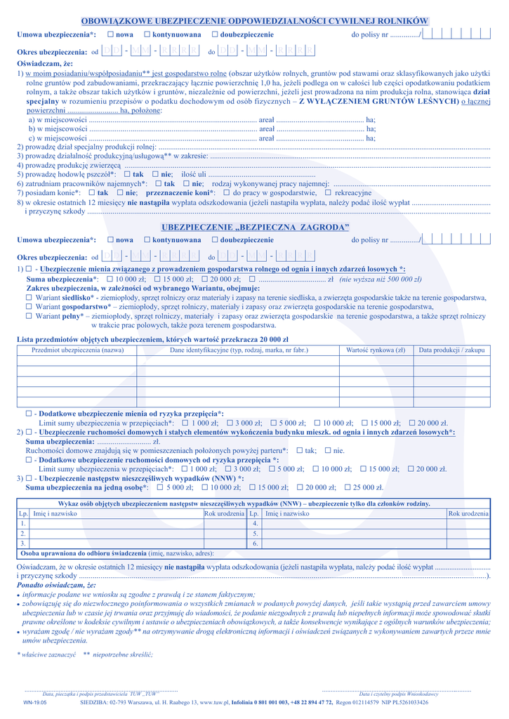 OBOWIĄZKOWE UBEZPIECZENIE ODPOWIEDZIALNOŚCI CYWILNEJ ROLNIKÓW Umowa ubezpieczenia*: □ nowa □ kontynuowana □ doubezpieczenie do polisy nr .............../ do D D - M M - R R R R Okres ubezpieczenia: od D D - M M - R R R R Oświadczam, że: 1) w moim posiadaniu/współposiadaniu** jest gospodarstwo rolne (obszar użytków rolnych, gruntów pod stawami oraz sklasyfikowanych jako użytki rolne gruntów pod zabudowaniami, przekraczający łącznie powierzchnię 1,0 ha, jeżeli podlega on w całości lub części opodatkowaniu podatkiem rolnym, a także obszar takich użytków i gruntów, niezależnie od powierzchni, jeżeli jest prowadzona na nim produkcja rolna, stanowiąca dział specjalny w rozumieniu przepisów o podatku dochodowym od osób fizycznych – Z WYŁĄCZENIEM GRUNTÓW LEŚNYCH) o łącznej powierzchni .......................... ha, położone: a) w miejscowości ...................................................................................... areał ............................................. ha; b) w miejscowości ...................................................................................... areał ............................................. ha; c) w miejscowości ...................................................................................... areał ............................................. ha; 2) prowadzę dział specjalny produkcji rolnej: ............................................................................................................................................................................. 3) prowadzę działalność produkcyjną/usługową** w zakresie: .................................................................................................................................................. 4) prowadzę produkcję zwierzęcą .............................................................................................................................................................................................. 5) prowadzę hodowlę pszczół*: □ tak □ nie; ilość uli ....................................................... 6) zatrudniam pracowników najemnych*: □ tak □ nie; rodzaj wykonywanej pracy najemnej: .................................................................................. 7) posiadam konie*: □ tak □ nie; przeznaczenie koni*: □ do pracy w gospodarstwie, □ rekreacyjne 8) w okresie ostatnich 12 miesięcy nie nastąpiła wypłata odszkodowania (jeżeli nastąpiła wypłata, należy podać ilość wypłat ......................................... i przyczynę szkody ............................................................................................................................................................................................................... UBEZPIECZENIE „BEZPIECZNA ZAGRODA” Umowa ubezpieczenia*: □ nowa □ kontynuowana □ doubezpieczenie do polisy nr .............../ do D D - M M - R R R R Okres ubezpieczenia: od D D - M M - R R R R 1) □ - Ubezpieczenie mienia związanego z prowadzeniem gospodarstwa rolnego od ognia i innych zdarzeń losowych *: Suma ubezpieczenia*: □ 10 000 zł; □ 15 000 zł; □ 20 000 zł; □ ................................... zł (nie wyższa niż 500 000 zł) Zakres ubezpieczenia, w zależności od wybranego Wariantu, obejmuje: □ Wariant siedlisko* - ziemiopłody, sprzęt rolniczy oraz materiały i zapasy na terenie siedliska, a zwierzęta gospodarskie także na terenie gospodarstwa, □ Wariant gospodarstwo* – ziemiopłody, sprzęt rolniczy, materiały i zapasy oraz zwierzęta gospodarskie na terenie gospodarstwa, □ Wariant pełny* – ziemiopłody, sprzęt rolniczy, materiały i zapasy oraz zwierzęta gospodarskie na terenie gospodarstwa, a także sprzęt rolniczy w trakcie prac polowych, także poza terenem gospodarstwa. Lista przedmiotów objętych ubezpieczeniem, których wartość przekracza 20 000 zł Przedmiot ubezpieczenia (nazwa) Dane identyfikacyjne (typ, rodzaj, marka, nr fabr.) Wartość rynkowa (zł) Data produkcji / zakupu □ - Dodatkowe ubezpieczenie mienia od ryzyka przepięcia*: Limit sumy ubezpieczenia w przepięciach*: □ 1 000 zł; □ 3 000 zł; □ 5 000 zł; □ 10 000 zł; □ 15 000 zł; □ 20 000 zł. 2) □ - Ubezpieczenie ruchomości domowych i stałych elementów wykończenia budynku mieszk. od ognia i innych zdarzeń losowych*: Suma ubezpieczenia: ............................ zł. Ruchomości domowe znajdują się w pomieszczeniach położonych powyżej parteru*: □ tak; □ nie. □ - Dodatkowe ubezpieczenie ruchomości domowych od ryzyka przepięcia *: Limit sumy ubezpieczenia w przepięciach*: □ 1 000 zł; □ 3 000 zł; □ 5 000 zł; □ 10 000 zł; □ 15 000 zł; 3) □ - Ubezpieczenie następstw nieszczęśliwych wypadków (NNW) *: Suma ubezpieczenia na jedną osobę*: □ 5 000 zł; □ 10 000 zł; □ 15 000 zł; □ 20 000 zł; □ 25 000 zł. □ 20 000 zł. Wykaz osób objętych ubezpieczeniem następstw nieszczęśliwych wypadków (NNW) – ubezpieczenie tylko dla członków rodziny. Lp. Imię i nazwisko Rok urodzenia Lp. Imię i nazwisko 1. 4. 2. 5. 3. 6. Osoba uprawniona do odbioru świadczenia (imię, nazwisko, adres): Rok urodzenia Oświadczam, że w okresie ostatnich 12 miesięcy nie nastąpiła wypłata odszkodowania (jeżeli nastąpiła wypłata, należy podać ilość wypłat ............................... i przyczynę szkody .................................................................................................................................................................................................................). Ponadto oświadczam, że: ● informacje podane we wniosku są zgodne z prawdą i ze stanem faktycznym; ● zobowiązuję się do niezwłocznego poinformowania o wszystkich zmianach w podanych powyżej danych, jeśli takie wystąpią przed zawarciem umowy ubezpieczenia lub w czasie jej trwania oraz przyjmuję do wiad