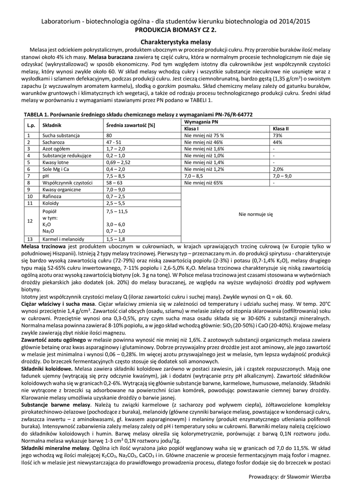 Laboratorium - biotechnologia ogólna - dla studentów kierunku biotechnologia od 2014/2015 PRODUKCJA BIOMASY CZ 2. Charakterystyka melasy Melasa jest odciekiem pokrystalicznym, produktem ubocznym w procesie produkcji cukru. Przy przerobie buraków ilość melasy stanowi około 4% ich masy. Melasa buraczana zawiera tę część cukru, która w normalnym procesie technologicznym nie daje się odzyskać (wykrystalizować) w sposób ekonomiczny. Pod tym względem istotny dla cukrowników jest współczynnik czystości melasy, który wynosi zwykle około 60. W skład melasy wchodzą cukry i wszystkie substancje niecukrowe nie usunięte wraz z wysłodkami i szlamem defekacyjnym, podczas produkcji cukru. Jest cieczą ciemnobrunatną, bardzo gęstą (1,35 g/cm3) o swoistym zapachu (z wyczuwalnym aromatem karmelu), słodką o gorzkim posmaku. Skład chemiczny melasy zależy od gatunku buraków, warunków gruntowych i klimatycznych ich wegetacji, a także od rodzaju procesu technologicznego produkcji cukru. Średni skład melasy w porównaniu z wymaganiami stawianymi przez PN podano w TABELI 1. TABELA 1. Porównanie średniego składu chemicznego melasy z wymaganiami PN-76/R-64772 L.p. Składnik Średnia zawartość [%] 1 2 3 4 5 6 7 8 9 10 11 Sucha substancja Sacharoza Azot ogółem Substancje redukujące Kwasy lotne Sole Mg i Ca pH Współczynnik czystości Kwasy organiczne Rafinoza Koloidy 80 47 - 51 1,7 – 2,0 0,2 – 1,0 0,69 – 2,52 0,4 – 2,0 7,5 – 8,5 58 – 63 7,0 – 9,0 0,7 – 2,5 2,5 – 5,5 7,5 – 11,5 12 Popiół w tym: K2 O Na2O 13 Karmel i melanoidy 1,5 – 1,8 Wymagania PN Klasa I Nie mniej niż 75 % Nie mniej niż 46% Nie mniej niż 1,6% Nie mniej niż 1,0% Nie mniej niż 1,4% Nie mniej niż 1,2% 7,0 – 8,5 Nie mniej niż 65% Klasa II 73% 44% 2,0% 7,0 – 9,0 - Nie normuje się 3,0 – 6,0 0,7 – 1,0 Melasa trzcinowa jest produktem ubocznym w cukrowniach, w krajach uprawiających trzcinę cukrową (w Europie tylko w południowej Hiszpanii). Istnieją 2 typy melasy trzcinowej. Pierwszy typ – przeznaczany m.in. do produkcji spirytusu - charakteryzuje się bardzo wysoką zawartością cukru (72-79%) oraz niską zawartością popiołu (2-3%) i potasu (0,7-1,4% K2O), melasy drugiego typu mają 52-65% cukru inwertowanego, 7-11% popiołu i 2,6-5,0% K2O. Melasa trzcinowa charakteryzuje się niską zawartością ogólną azotu oraz wysoką zawartością biotyny (ok. 3 g na tonę). W Polsce melasa trzcinowa jest czasami stosowana w wytwórniach drożdży piekarskich jako dodatek (ok. 20%) do melasy buraczanej, ze względu na wyższe wydajności drożdży pod wpływem biotyny. Istotny jest współczynnik czystości melasy Q (iloraz zawartości cukru i suchej masy). Zwykle wynosi on Q = ok. 60. Ciężar właściwy i sucha masa. Ciężar właściwy zmienia się w zależności od temperatury i udziału suchej masy. W temp. 20°C wynosi przeciętnie 1,4 g/cm3. Zawartość ciał obcych (osadu, szlamu) w melasie zależy od stopnia sklarowania (odfiltrowania) soku w cukrowni. Przeciętnie wynosi ona 0,3-0,5%, przy czym sucha masa osadu składa się w 30-60% z substancji mineralnych. Normalna melasa powinna zawierać 8-10% popiołu, a w jego skład wchodzą głównie: SiO2 (20-50%) i CaO (20-40%). Krajowe melasy zwykle zawierają zbyt niskie ilości magnezu. Zawartość azotu ogólnego w melasie powinna wynosić nie mniej niż 1,6%. Z azotowych substancji organicznych melasa zawiera głównie betainę oraz kwas asparaginowy i glutaminowy. Dobrze przyswajalny przez drożdże jest azot aminowy, ale jego zawartość w melasie jest minimalna i wynosi 0,06 – 0,28%. Im więcej azotu przyswajalnego jest w melasie, tym lepsza wydajność produkcji drożdży. Do brzeczek fermentacyjnych często stosuje się dodatek soli amonowych. Składniki koloidowe. Melasa zawiera składniki koloidowe zarówno w postaci zawiesin, jak i cząstek rozpuszczonych. Mają one ładunek ujemny (wytrącają się przy odczynie kwaśnym), jak i dodatni (wytrącanie przy pH alkalicznym). Zawartość składników koloidowych waha się w granicach 0,2-6%. Wytrącają się głównie substancje barwne, karmelowe, humusowe, melanoidy. Składniki nie wytrącone z brzeczki są adsorbowane na powierzchni ścian komórek, powodując powstawanie ciemnej barwy drożdży. Klarowanie melasy umożliwia uzyskanie drożdży o barwie jasnej. Substancje barwne melasy. Należą tu związki karmelowe (z sacharozy pod wpływem ciepła), żółtawozielone kompleksy pirokatechinowo-żelazowe (pochodzące z buraka), melanoidy (główne czynniki barwiące melasę, powstające w kondensacji cukru, zwłaszcza inwertu – z aminokwasami, gł. kwasem asparaginowym) i melaniny (produkt enzymatycznego utleniania polifenoli buraka). Intensywność zabarwienia zależy melasy zależy od pH i temperatury soku w cukrowni. Barwniki melasy należą częściowo do składników koloidowych i humin. Barwę melasy określa się kolorymetrycznie, porównując z barwą 0,1N roztworu jodu. Normalna melasa wykazuje barwę 1-3 cm3 0,1N roztworu jodu/1g. Składniki mineralne melasy. Ogólna ich ilość wyrażona jako popiół węglanowy waha się w granicach od 7,0 do 11,5%. W skład jego wchodzą wg ilości malejącej K2CO3, Na2CO3, CaCO3 i in. Główne znaczenie w procesie fermentacyjnym mają fosfor i magnez. Ilość ich w melasie jest niewystarczająca do prawidłowego prowadzenia procesu, dlatego fosfor dodaje się do brzeczek w postaci Prowadzący: dr Sławomir Wierzba Laboratorium - biotechnologia ogólna - dla studentów kierunku biotechnologia od 2014/2015 PRODUKCJA BIOMASY CZ 2. superfosfatu. Melasy krajowe cechują się zwykle zbyt niską zawartością potasu w stosunku do wymagań drożdży. Wpływa to niekorzystnie na wydajność drożdży. Przy zawartości potasu w przeliczeniu na K 2O niższej od 2,2% osiąga się wydajność poniżej 75 g D27/100 g melasy o zawartości sacharozy 50%, a przy zawartości 4,2% - 85 g D27/100 g M50. Zawartość potasu wy