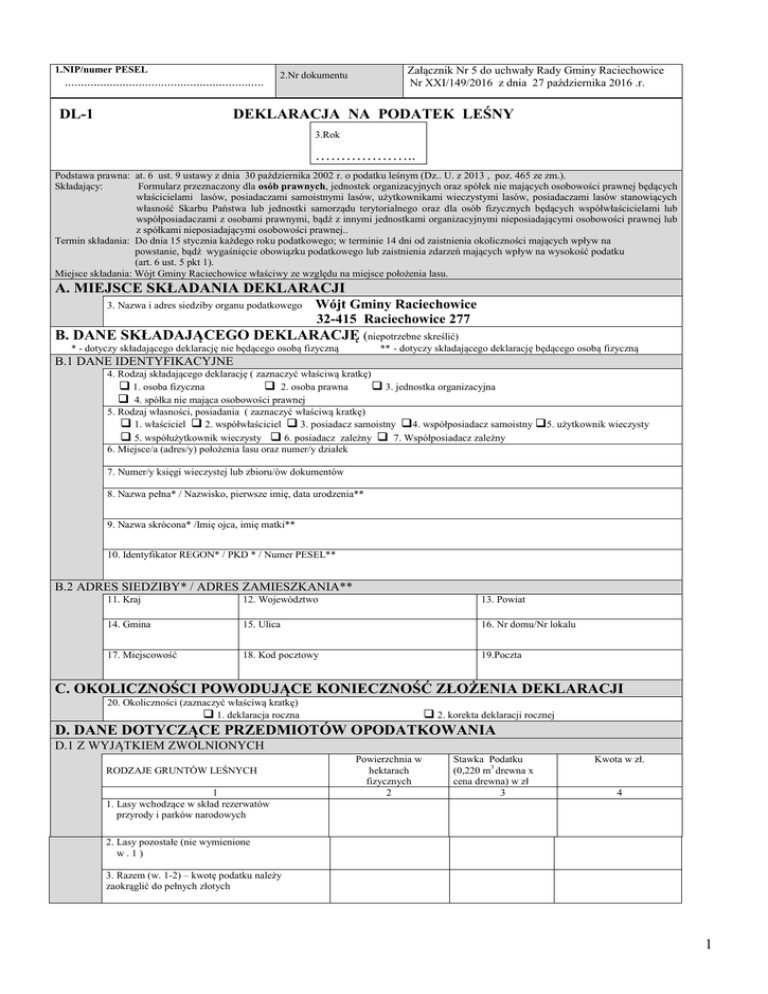 1.NIP/numer PESEL .............................................................. Załącznik Nr 5 do uchwały Rady Gminy Raciechowice Nr XXI/149/2016 z dnia 27 października 2016 .r. 2.Nr dokumentu DEKLARACJA NA PODATEK LEŚNY DL-1 3.Rok ……………….. Podstawa prawna: at. 6 ust. 9 ustawy z dnia 30 października 2002 r. o podatku leśnym (Dz.. U. z 2013 , poz. 465 ze zm.). Składający: Formularz przeznaczony dla osób prawnych, jednostek organizacyjnych oraz spółek nie mających osobowości prawnej będących właścicielami lasów, posiadaczami samoistnymi lasów, użytkownikami wieczystymi lasów, posiadaczami lasów stanowiących własność Skarbu Państwa lub jednostki samorządu terytorialnego oraz dla osób fizycznych będących współwłaścicielami lub współposiadaczami z osobami prawnymi, bądź z innymi jednostkami organizacyjnymi nieposiadającymi osobowości prawnej lub z spółkami nieposiadającymi osobowości prawnej.. Termin składania: Do dnia 15 stycznia każdego roku podatkowego; w terminie 14 dni od zaistnienia okoliczności mających wpływ na powstanie, bądź wygaśnięcie obowiązku podatkowego lub zaistnienia zdarzeń mających wpływ na wysokość podatku (art. 6 ust. 5 pkt 1). Miejsce składania: Wójt Gminy Raciechowice właściwy ze względu na miejsce położenia lasu. A. MIEJSCE SKŁADANIA DEKLARACJI 3. Nazwa i adres siedziby organu podatkowego Wójt Gminy Raciechowice 32-415 Raciechowice 277 B. DANE SKŁADAJĄCEGO DEKLARACJĘ (niepotrzebne skreślić) * - dotyczy składającego deklarację nie będącego osobą fizyczną ** - dotyczy składającego deklarację będącego osobą fizyczną B.1 DANE IDENTYFIKACYJNE 4. Rodzaj składającego deklarację ( zaznaczyć właściwą kratkę)  1. osoba fizyczna  2. osoba prawna  3. jednostka organizacyjna  4. spółka nie mająca osobowości prawnej 5. Rodzaj własności, posiadania ( zaznaczyć właściwą kratkę)  1. właściciel  2. współwłaściciel  3. posiadacz samoistny 4. współposiadacz samoistny 5. użytkownik wieczysty  5. współużytkownik wieczysty  6. posiadacz zależny  7. Współposiadacz zależny 6. Miejsce/a (adres/y) położenia lasu oraz numer/y działek 7. Numer/y księgi wieczystej lub zbioru/ów dokumentów 8. Nazwa pełna* / Nazwisko, pierwsze imię, data urodzenia** 9. Nazwa skrócona* /Imię ojca, imię matki** 10. Identyfikator REGON* / PKD * / Numer PESEL** B.2 ADRES SIEDZIBY* / ADRES ZAMIESZKANIA** 11. Kraj 12. Województwo 13. Powiat 14. Gmina 15. Ulica 16. Nr domu/Nr lokalu 17. Miejscowość 18. Kod pocztowy 19.Poczta C. OKOLICZNOŚCI POWODUJĄCE KONIECZNOŚĆ ZŁOŻENIA DEKLARACJI 20. Okoliczności (zaznaczyć właściwą kratkę)  1. deklaracja roczna  2. korekta deklaracji rocznej D. DANE DOTYCZĄCE PRZEDMIOTÓW OPODATKOWANIA D.1 Z WYJĄTKIEM ZWOLNIONYCH RODZAJE GRUNTÓW LEŚNYCH 1 1. Lasy wchodzące w skład rezerwatów przyrody i parków narodowych Powierzchnia w hektarach fizycznych 2 Stawka Podatku (0,220 m3 drewna x cena drewna) w zł 3 Kwota w zł. 4 2. Lasy pozostałe (nie wymienione w.1) 3. Razem (w. 1-2) – kwotę podatku należy zaokrąglić do pełnych złotych 1 E. INFORMACJA O PRZEDMIOTACH ZWOLNIONYCH (podać powierzchnię zwolnionego lasu oraz przepis prawa - z jakiego tytułu występuje zwolnienie, ) F. PODPIS SKŁADAJĄCEGO / OSOBY REPREZENTUJĄCEJ SKŁADAJĄCEGO 21. Imię 22. Nazwisko 23. Data wypełnienia (dzień - miesiąc - rok) 24. Podpis (pieczęć) składającego / osoby reprezentującej składającego, nr telefonu G. ADNOTACJE ORGANU PODATKOWEGO 25. Uwagi organu podatkowego 26. 27. Data i podpis przyjmującego formularz Pouczenie Niniejsza deklaracja stanowi podstawę do wystawienia tytułu wykonawczego, zgodnie z przepisami ustawy z dnia 17 czerwca 1966r o postępowaniu egzekucyjnym w administracji ( t.j. Dz. U. z 2014 r. poz. 1619 ze zm.) Obliczony w deklaracji podatek od nieruchomości należy wpłacać w ratach proporcjonalnych do czasu trwania obowiązku podatkowego, bez wezwania na rachunek Urzędu Gminy Raciechowice 277, 32-415 Raciechowice w terminie do dnia 15 każdego miesiąca. Zgodnie z art. 6 ust. 11a ustawy o podatkach i opłatach lokalnych ,, W przypadku gdy kwota podatku nie przekracza 100 zł, podatek jest płatny jednorazowo w terminie płatności pierwszej raty” 2
