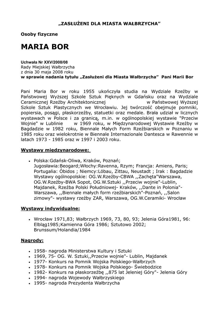 „ZASŁUŻENI DLA MIASTA WAŁBRZYCHA” Osoby fizyczne MARIA BOR Uchwała Nr XXV/2008/08 Rady Miejskiej Wałbrzycha z dnia 30 maja 2008 roku w sprawie nadania tytułu „Zasłużeni dla Miasta Wałbrzycha” Pani Marii Bor Pani Maria Bor w roku 1955 ukończyła studia na Wydziale Rzeźby w Państwowej Wyższej Szkole Sztuk Pięknych w Gdańsku oraz na Wydziale Ceramicznej Rzeźby Architektonicznej w Państwowej Wyższej Szkole Sztuk Plastycznych we Wrocławiu. Jej twórczość obejmuje pomniki, popiersia, posągi, płaskorzeźby, statuetki oraz medale. Brała udział w licznych wystawach w Polsce i za granicą, m.in. w ogólnopolskiej wystawie "Przeciw Wojnie" w Lublinie w 1969 roku, w Międzynarodowej Wystawie Rzeźby w Bagdadzie w 1982 roku, Biennale Małych Form Rzeźbiarskich w Poznaniu w 1985 roku oraz wielokrotnie w Biennale Internazionale Dantesca w Rawennie w latach 1973 - 1985 oraz w 1997 i 2003 roku. Wystawy międzynarodowe: • Polska:Gdańsk-Oliwa, Kraków, Poznań; Jugosławia:Beogard;Włochy:Ravenna, Rzym; Francja: Amiens, Paris; Portugalia: Óbidos ; Niemcy:Löbau, Zittau, Neustadt ; Irak : Bagdadzie Wystawy ogólnopolskie: OG.W.Rzeźby-CBWA ,,Zachęta"Warszawa, OG.W.Rzeźby-BWA Sopot, OG.W.Sztuki ,,Przeciw wojnie"-Lublin, Majdanek, Rzeźba Polski Południowej- Kraków, ,,Dante in Polonia"Warszawa, ,,Biennale małych form rzeźbiarskich"-Poznań, ,,Salon zimowy"- wystawy rzeźby ZAR, Warszawa, OG.W.Ceramiki- Wrocław Wystawy indywidualne: • Wrocław 1971,83; Wałbrzych 1969, 73, 80, 93; Jelenia Góra1981, 96: Elbląg1985;Kamienna Góra 1986; Sztutowo 2002; Brunssum/Holandia/1984 Nagrody: • • • • • • • 1958- nagroda Ministerstwa Kultury i Sztuki 1969, 75- OG. W. Sztuki,,Przeciw wojnie"- Lublin, Majdanek 1977- Konkurs na Pomnik Wojska Polskiego-Wałbrzych 1978- Konkurs na Pomnik Wojska Polskiego- Świebodzice 1982- Konkurs na płaskorzeźbę ,,875 lat Jeleniej Góry"- Jelenia Góry 1994- nagroda Wojewody Wałbrzyskiego 1995- nagroda Prezydenta Wałbrzycha Prace w zbiorach: • • • • • • • • • Muzeum Medalierstwa - Wrocław Muzeum Mennicy Pańswowej w Warszawie Muzeum Dantesca di Ravenna Muzeum w Bagdadzie Muzea w Wałbrzychu, w Bolesławcu, w Jaworze Muzeum Gross - Rosen w Rogoźnicy Muzeum na Majdanku w Lublinie Muzeum STUDTHOF w Sztutowie Muzeum Górnictwa w Wałbrzych Zbiory: Urząd Miasta Wrocławia, Urząd Miejski w Wałbrzychu Zbiory: Galeria EL w Elbląg Zbiory prywatne w Polsce, w Niemczech, w Holandii, w Kanadzie Ważniejsze realizacje rzeźbiarskie: Pomniki i posągi: • • • • • -,,Kopernik"- piaskowiec, 160 cm, Kamienna Góra -,,Pomnik Wojska Polskiego"- sztuczny kamień, 500 cm, Świebodzice -,,Posag Odlewnika",szt. kamień,400 cm, Świdnica -,,Bogini Kora", kamionka szkliwiona, 400 cm, Kostomłoty -,,Bogini Fortuna", szt. kamień, Görlitz -,,Posąg Górmika", gips polichromowany,220 cm, Wałbrzych Rzeźby parkowe: • • • • • • • • -,,Terra, mater nostra", piaskowiec, 160 cm, Kamienna Góra1981 -,, Terra, mater nostra II", wapień, 350 cm, Wałbrzych, -,,Górnictwo i przemysł", marmur, 270 cm, Wałbrzych -,,Kwietne baby", kamionka szkliwiona, 330 cm, Wałbrzych ,,Harpie",szt.kamień,250 cm, Wałbrzycha -,,Ptaki"-fontanna-pijalnia, Cieplice-Zdrój -,,Żagiel",staliwo, blacha, 450 cm, Neustadt(Niemcy) -,,Latający dywan",250 cm ,,Ufoludek",180 cm, ,,Smok uskrzydlony"450 cm, ,,Czarnoksiężnik", 250 cm, ,,Śpiąca królewna", 280 cm, kamionka szkliw., Kostomłoty -,,Ufoludek II" 270 cm, ,,Ufo-ludki", 290 cm, ,,Smok latający", 900 cm, ,,Zaklęta królewna", 280 cm, kamionka szkliwiona, Głogów Płaskorzeźby: • • • • -,,875 lat Jeleniej Góry, piaskowiec 450 /300 cm, Jelenia Góra -,,Kombatantom Polski II Wojny Światowej", 200/250 cm, Gryfów Śl. ,,Jan Kochanowski", gips polichromowany,220/110 c, Jawor -,,Mikołaj Kopernik",I Liceum im.S.Żeromskiego, Jelenia Góra -,,Maria Skłodowska Curie", ,,Fryderyk Chopin", ,,Papież Jan Paweł II", ,,Henryk Sienkiewicz", ,,Czesław Miłosz", ,,Wiesława Szymborska", ,,Władysław S.Reymont", ,,Stefan Żeromski" • -,, Fryderyk Chopin", ,,J.S.Bach", ,,Henryk Wieniawski", ,,W.A.Mozart", ,,Karol Szymanowski" ,,Ferenc Liszt", ,,Ludwig van Beethoven", ,,Ignacy Paderewski",Państwowa Szkoła Muzyczna w Wałbrzychu Popiersia i portrety: • • • • -,,Norwid",II Liceum w Cieplicach Zdroju -Major Sucharski", Zespół Szkół Zawodowych w Złotoryi -,,Papież Jan Paweł II",Żdanów -,,Bolesław Chrobry", ,,Jan Matejko", ,,Mikołaj Kopernik", ,,Jan Śniadecki", ,,Adam Mickiewicz", Juliusz Słowacki", ,,Maria Skłodowska Curie", ,,Tadeusz Kościuszko", ,,Stanisław Moniuszko", ,,Stanisław Wyspiański", Henryk Sienkiewicz", Helena Modrzejewska" Artystka zaprojektowała dziesiątki medali, plakietek, kilkanaście statuetek,pamiątkowych. Osobny zbiór stanowi cykl 40 rzeźb ,,Człowiecze pochodnie".