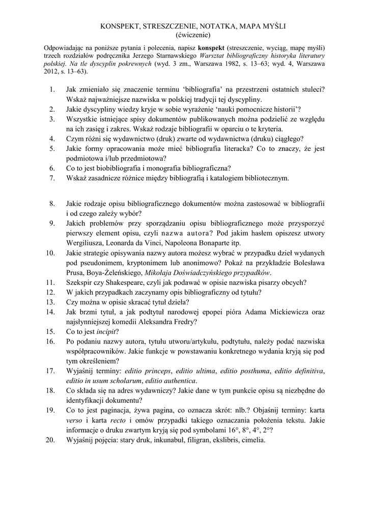 KONSPEKT, STRESZCZENIE, NOTATKA, MAPA MYŚLI (ćwiczenie) Odpowiadając na poniższe pytania i polecenia, napisz konspekt (streszczenie, wyciąg, mapę myśli) trzech rozdziałów podręcznika Jerzego Starnawskiego Warsztat bibliograficzny historyka literatury polskiej. Na tle dyscyplin pokrewnych (wyd. 3 zm., Warszawa 1982, s. 13–63; wyd. 4, Warszawa 2012, s. 13–63). 1. 2. 3. 4. 5. 6. 7. 8. 9. 10. 11. 12. 13. 14. 15. 16. 17. 18. 19. 20. Jak zmieniało się znaczenie terminu ‘bibliografia’ na przestrzeni ostatnich stuleci? Wskaż najważniejsze nazwiska w polskiej tradycji tej dyscypliny. Jakie dyscypliny wiedzy kryje w sobie wyrażenie ‘nauki pomocnicze historii’? Wszystkie istniejące spisy dokumentów publikowanych można podzielić ze względu na ich zasięg i zakres. Wskaż rodzaje bibliografii w oparciu o te kryteria. Czym różni się wydawnictwo (druk) zwarte od wydawnictwa (druku) ciągłego? Jakie formy opracowania może mieć bibliografia literacka? Co to znaczy, że jest podmiotowa i/lub przedmiotowa? Co to jest biobibliografia i monografia bibliograficzna? Wskaż zasadnicze różnice między bibliografią i katalogiem bibliotecznym. Jakie rodzaje opisu bibliograficznego dokumentów można zastosować w bibliografii i od czego zależy wybór? Jakich problemów przy sporządzaniu opisu bibliograficznego może przysporzyć pierwszy element opisu, czyli nazwa autora? Pod jakim hasłem opiszesz utwory Wergiliusza, Leonarda da Vinci, Napoleona Bonaparte itp. Jakie strategie opisywania nazwy autora możesz wybrać w przypadku dzieł wydanych pod pseudonimem, kryptonimem lub anonimowo? Pokaż na przykładzie Bolesława Prusa, Boya-Żeleńskiego, Mikołaja Doświadczyńskiego przypadków. Szekspir czy Shakespeare, czyli jak podawać w opisie nazwiska pisarzy obcych? W jakich przypadkach zaczynamy opis bibliograficzny od tytułu? Czy można w opisie skracać tytuł dzieła? Jak brzmi tytuł, a jak podtytuł narodowej epopei pióra Adama Mickiewicza oraz najsłynniejszej komedii Aleksandra Fredry? Co to jest incipit? Po podaniu nazwy autora, tytułu utworu/artykułu, podtytułu, należy podać nazwiska współpracowników. Jakie funkcje w powstawaniu konkretnego wydania kryją się pod tym określeniem? Wyjaśnij terminy: editio princeps, editio ultima, editio posthuma, editio definitiva, editio in usum scholarum, editio authentica. Co składa się na adres wydawniczy? Jakie dane w tym punkcie opisu są niezbędne do identyfikacji dokumentu? Co to jest paginacja, żywa pagina, co oznacza skrót: nlb.? Objaśnij terminy: karta verso i karta recto i omów przypadki takiego oznaczania położenia tekstu. Jakie informacje o druku zwartym kryją się pod symbolami 16°, 8°, 4°, 2°? Wyjaśnij pojęcia: stary druk, inkunabuł, filigran, ekslibris, cimelia.
