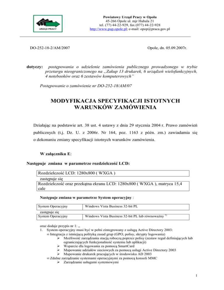 Powiatowy Urząd Pracy w Opolu 45-266 Opole ul. mjr Hubala 21 tel. (77) 44-22-929, fax (077) 44-22-928 http://www.pup.opole.pl; e-mail: [email protected] DO-252-18-2/AM/2007 dotyczy: Opole, dn. 05.09.2007r. postępowania o udzielenie zamówienia publicznego prowadzonego w trybie przetargu nieograniczonego na „Zakup 13 drukarek, 6 urządzeń wielofunkcyjnych, 4 notebooków oraz 6 zestawów komputerowych” Postępowanie o zamówienie nr DO-252-18/AM/07 MODYFIKACJA SPECYFIKACJI ISTOTNYCH WARUNKÓW ZAMÓWIENIA Działając na podstawie art. 38 ust. 4 ustawy z dnia 29 stycznia 2004 r. Prawo zamówień publicznych (t.j. Dz. U. z 2006r. Nr 164, poz. 1163 z późn. zm.) zawiadamia się o dokonaniu zmiany specyfikacji istotnych warunków zamówienia. W załączniku E: Następuje zmiana w parametrze rozdzielczość LCD: Rozdzielczość LCD: 1280x800 ( WXGA ) zastępuje się Rozdzielczość oraz przekątna ekranu LCD: 1280x800 ( WXGA ), matryca 15,4 cale Następuje zmiana w parametrze System operacyjny : System Operacyjny Windows Vista Business 32-bit PL zastępuje się System Operacyjny Windows Vista Business 32-bit PL lub równowaŜny 1) oraz dodaje przypis nr 1: „ 1. System operacyjny musi być w pełni zintegrowany z usługą Active Directory 2003: • Integracja z istniejącą polityką zasad grup (GPO, polisy, skrypty logowania) MoŜliwość zarządzania stacją roboczą poprzez polisy (zestaw reguł definiujących lub ograniczających funkcjonalność systemu lub aplikacji) Wsparcie dla logowania za pomocą SmartCard Mapowanie udziałów sieciowych za pomocą usługi Active Directory 2003 Mapowanie drukarek pracujących w środowisku AD 2003 • Zdalne zarządzanie systemami operacyjnymi za pomocą konsoli MMC Zarządzanie usługami systemowymi 1 Zarządzanie rejestrem systemowym Zarządzenie uŜytkownikami Zarządzanie folderami udostępnionymi • Zdalne dystrybuowanie i instalowanie paczek MSI. 2. System operacyjny musi umoŜliwić uruchamianie i pracę poniŜszych aplikacji, które posiada Zamawiający (programy nie mogą być uruchamiane za pomocą róŜnego rodzaju emulatorów): • Pakiet biurowy MS Office 2003/2007 Professional • Program Płatnik • Program MultiCash PKO BP SA • Serwerowa wersja programu Lex Omega • Program ESET NOD32 dla Windows i oprogramowania zaoferowanego przez Wykonawcę w niniejszym postępowaniu. 3. System operacyjny musi w pełni obsługiwać system plików NTFS ( wymagane wszystkie uprawnienia NTFS) 4. System operacyjny na stacjach klienckich musi posiadać narzędzie do backup’u stanu systemu i plików, jak i całych partycji oraz dysków. Następuje zmiana w parametrze oprogramowanie: Oprogramowanie Microsoft Office 2007 Standard zastępuje się Pakiet biurowy Licencja Microsoft Office 2007 Standard lub równowaŜna 2) oraz dodaje przypis nr 2: „ 1. Pakiet zintegrowanych aplikacji biurowych zawierający: a. Edytor tekstów b. Arkusz kalkulacyjny c. Narzędzie do przygotowywania i prowadzenia prezentacji 2. Interfejs aplikacji musi być całkowicie w języku polskim. 3. Do aplikacji musi być dostępna pełna dokumentacja w języku polskim. 4. Edytor tekstów musi umoŜliwiać: a. edycję i formatowanie tekstu w języku polskim b. wstawianie oraz formatowanie tabel c. wstawianie oraz formatowanie obiektów graficznych d. wstawianie wykresów i tabel z arkusza kalkulacyjnego (wliczając tabele przestawne) e. automatyczne numerowanie rozdziałów, punktów, akapitów, tabel i rysunków f. automatyczne tworzenie spisów treści g. formatowanie nagłówków i stopek stron h. sprawdzanie pisowni w języku polskim i. śledzenie zmian wprowadzonych przez uŜytkowników j. nagrywanie, tworzenie i edycję makr automatyzujących wykonywanie czynności k. określenie układu strony (pionowa/pozioma) l. wydruk dokumentów m. wykonywanie korespondencji seryjnej bazując na danych adresowych pochodzących z arkusza kalkulacyjnego i z narzędzia do zarządzania informacją prywatną n. pracę na dokumentach zgodnymi w pełni z formatem Microsoft Word 2003 i Microsoft Word 2007 o. zabezpieczenie dokumentów hasłem przed odczytem oraz przed wprowadzaniem modyfikacji p. integrację z narzędziami do pracy grupowej 5. Arkusz kalkulacyjny musi umoŜliwiać: a. Tworzenie raportów tabelarycznych b. Tworzenie wykresów liniowych (wraz linią trendu), słupkowych, kołowych c. Tworzenie arkuszy kalkulacyjnych zawierających teksty, dane liczbowe oraz formuły przeprowadzające operacje matematyczne, logiczne, tekstowe, statystyczne oraz operacje na danych finansowych i na miarach czasu. 2 d. 6. 7. Tworzenie raportów z zewnętrznych źródeł danych (inne arkusze kalkulacyjne, bazy danych zgodne z ODBC, pliki tekstowe, pliki XML, webservice) e. Tworzenie raportów tabeli przestawnych umoŜliwiających dynamiczną zmianę wymiarów oraz wykresów bazujących na danych z tabeli przestawnych f. Wyszukiwanie i zamienianie danych g. Wykonywanie analiz danych przy uŜyciu formatowania warunkowego h. Nazywanie komórek arkusza i odwoływanie się w formułach po takiej nazwie i. nagrywanie, tworzenie i edycję makr automatyzujących wykonywanie czynności j. Formatowanie czasu, daty i wartości finansowych z polskim formatem k. Zapis wielu arkuszy kalkulacyjnych w jednym pliku. l. Pracę na plikach zgodnych w pełni z formatem Microsoft Excel 2003 i Microsoft Excel 2007. m. zabezpieczenie dokumentów hasłem przed odczytem oraz przed wprowadzaniem modyfikacji n. integrację z narzędziami do pracy grupowej Narzędzie do przygotowywania i prowadzenia prezentacji musi umoŜliwiać: a. Przygotowywanie prezentacji multimedialnych, które będą: i. prezentowane przy uŜyciu projektora multimedialnego ii. drukowane w formacie umoŜliwiającym robienie notatek iii. zapisane jako prezentacja tylko do odczytu. b. Nagrywanie narracji i dołączanie jej do prezentacji c. Opatrywanie slajdów notatkami dla prezentera d. Umieszczanie i formatowanie tekstów, obiektów graficznych, 