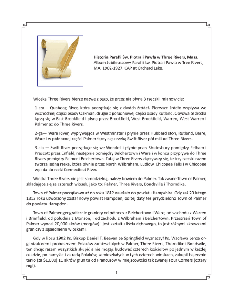 Historia Parafii Św. Piotra i Pawła w Three Rivers, Mass. Album Jubileuszowy Parafii św. Piotra i Pawła w Tree Rivers, MA. 1902-1927. CAP at Orchard Lake. Wioska Three Rivers bierze nazwę z tego, że przez nią płyną 3 rzeczki, mianowicie: 1-sza— Quaboag River, która początkuje się z dwóch źródeł. Pierwsze źródło wypływa we wschodniej części osady Oakman, drugie z południowej części osady Rutland. Obydwa te źródła łączą się w East Brookfield i płyną przez Brookfield, West Brookfield, Warren, West Warren i Palmer aż do Three Rivers. 2-ga— Ware River, wypływająca w Westminster i płynie przez Hubbard ston, Rutland, Barre, Ware i w północnej części Palmer łączy się z rzeką Swift River pół mili od Three Rivers. 3-cia — Swift River początkuje się we Wendell i płynie przez Shutesbury pomiędzy Pelham i Prescott przez Enfield, następnie pomiędzy Belchertown i Ware i w końcu przypływa do Three Rivers pomiędzy Palmer i Belchertown. Tutaj w Three Rivers złączywszy się, te trzy rzeczki razem tworzą jedną rzekę, która płynie przez North Wilbraham, Ludlow, Chicopee Falls i w Chicopee wpada do rzeki Connecticut River. Wioska Three Rivers nie jest samodzielną, należy bowiem do Palmer. Tak zwane Town of Palmer, składające się ze czterech wiosek, jako to: Palmer, Three Rivers, Bondsville i Thorndike. Town of Palmer początkowo aż do roku 1812 należało do powiatu Hampshire. Gdy zaś 20 lutego 1812 roku utworzony został nowy powiat Hampden, od tej daty też przydzielono Town of Palmer do powiatu Hampden. Town of Palmer geograficznie graniczy od północy z Belchertown i Ware; od wschodu z Warren i Brimfield; od południa z Monson; i od zachodu z Wilbraham i Belchertown. Przestrzeń Town of Palmer wynosi 20,000 akrów (morgów) i jest kształtu liścia dębowego, to jest różnymi skrawkami graniczy z sąsiedniemi wioskami. Gdy w lipcu 1902 Ks. Biskup Daniel T. Beaven ze Springfield wyznaczył Ks. Wacława Lenza organizatorem i proboszczem Polaków zamieszkałych w Palmer, Three Rivers, Thorndike i Bondsvile, ten chcąc razem wszystkich skupić a nie mogąc budować czterech kościołów po jednym w każdej osadzie, po namyśle i za radą Polaków, zamieszkałych w tych czterech wioskach, zakupił bajecznie tanio (za $1,000) 11 akrów grun tu od Francuzów w miejscowości tak zwanej Four Corners (cztery rogi). 1 Miejscowość ta jest położoną prawie w środku tych czterech wiosek i stąd na wschód znajduje się Thorndike na zachód Three Rivers, na południe Palmer, a na północ Bonds ville. Do lipca 1910 cztery te wioski tworzyły jedną parafię pod wezwaniem św. Piotra i Pawła. Zaś od lipca 1910 Polacy z Bondsville odłączyli się i utworzyli sobie swoją parafię pod wezwaniem Św. Wojciecha B. i M. w Bondsville, Mass. Ks. Wacław Lenz, zakupiwszy te 11 akrów ziemi, wziął się zaraz do pracy. Najpierw wyrównał doły na co było potrzeba kilka tysięcy wozów ziemi, powycinał rozmaite krzaki w czym mu pomagali zacni parafianie, pracując całymi tygodniami na zmiany bezinteresownie, aby jak najwięcej pomóc parafii, co oszczędziło nie setki ale i tysiące dolarów. Początkowo nabożeństwa odprawiały się we francuskim kościele w Three Rivers, na które uczęszczali Polacy z 3 Rivers, Thorndike i Palmer. Zaś dla Polaków zamieszkałych w Bondsville nabożeństwa dla nich odprawiał Ks. Lenz w Bondsville w kapliczce francuskiej i tam się też odprawiały nabożeństwa aż do roku 1916, dopóki Polacy w Bondsville nie wybudowali sobie swego kościoła pod wezwaniem św. Wojciecha B. i M. Otóż wtedy Ks. Lenz, wezwawszy Boga do pomocy i widząc dobre chęci parafian, zabrał się szczerze do pracy i rozpoczął marzyć o wybudowaniu kościoła i plebanii, co też w roku 1905 zostało uskutecznione. Stanął bowiem piękny kościół, plebania i stajnia. Wszystko to kosztowało około $60,000, to jest kompletnie z całym ukończeniem i umeblowaniem, (w obecnych czasach kosztowałoby to około trzy razy tyle). Przy organizowaniu parafii Polaków było wszystkich niespełna 1000 osób ale że byli chętni i ofiarni, to świadczy, że posprawiali do kościoła przepiękne szaty kościelne. Tudzież nazwiska ich n. p. na oknach świadczą o ich hojności. Zaś gdy już stanął kościół z całym urządzeniem, plebania i stajnia, długu wszystkiego było $35,000 a więc podczas budowy tj. od roku 1902 ro roku 1905 złożyli na budowę $25,000. Zaś od roku 1905 do kwietnia roku 1911 spłacili długu $6,950.00. W kwietniu roku 1911 Ks. Lenz został - przeniesiony do Easthampton, Mass. Na jego miejsce Ks. Biskup Beaven przysłał Ks. Wład. Kiełbasińskiego, który był proboszczem parafii ŚŚ. Piotra i Pawła do kwietnia 1913. Roku 1913 wyjechał ks. Kiełbasiński do Polski, obecnie jest proboszczem w Konopiskach pod Częstochową. Za administracji Ks. Kiełbasińskiego spłaciła parafia długu — $6,800.00. Po wyjeździe Ks. Kiełbasińskiego Ks. Biskup Beaven naznaczył proboszczem Ks. Andrzeja S. Krzywdę, który dotychczas zarządza parafią Św. Piotra i Pawła. Gdy Ks. Krzywda nastał proboszczem tejże parafii, zaraz w pierwszą niedzielę zwrócił uwagę, że parafia, wezwawszy Boga na pomoc, musi się starać, ażeby jak najprędzej wybudować szkołę parafialną. Długu zastał w parafii $21,- 250.00, który to dług spłacił w przeciągu 4 lat. Zaś roku 1917 rozpoczął z parafianami myśleć o szkole. Były różne zdania, co do budowy szkoły za i przeciw. Ale w końcu stanęło na tym, że szkoła to jest dzieło Boże i że Bóg dopomoże naszym chęciom i rozpoczęły się przygotowania do budowy szkoły parafialnej. Dobrze myślący parafianie zaczęli znosić ofiary do Ks. Proboszcza na szkołę. W roku 1919 było już gotówki około $10,000. Tegoż roku kupiono dom piętrowy składający się z 12-tu pokoi, naprzeciw gruntu parafialnego za $3,312.00, który to dom zamieniono na mieszka