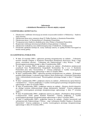 Informacja z działalności Burmistrza w okresie między sesjami I GOSPODARKA KOMUNALNA: 1. Zakończono i odebrano inwestycję na terenie oczyszczalni ścieków w Mokrawicy – budowa stacji zlewnej. 2. Zakończono prace przy remoncie drogi IV Pułku Piechoty w Kamieniu Pomorskim. 3. Zakończono prace ul. Rzemieślnicza w Kamieniu Pomorskim. 4. Trwają prace przy budowie chodnika przy ulicy Polnej w Kamieniu Pomorskim. 5. Rozpoczęto realizację inwestycji przebudowa drogi gminnej w Górkach. 6. Zakończono rozbudowę sieci elektroenergetycznej w Kukułowie, Trzebieszewie. 7. Dwukrotne spotkania komisji ds. oceny realizacji umowy ze spółką PUWiS Nowogard na terenie naszej gminy. II ZAMÓWIENIA PUBLICZNE: 1. W dniu 10 września 2008 r. ogłoszono przetarg nieograniczony na zadanie: „ Uzbrojenie terenów Osiedla Chopina w Kamieniu Pomorskim (kanalizacja deszczowa, drogi i ciągi piesze, oświetlenie uliczne) – Uzbrojenie ulic Paderewskiego i ulicy Witosa – I etap”. Rozstrzygnięcie przetargu nastąpi w dniu 23 października 2008 r. 2. W dniu 26 września 2008 r. podpisano umowę na zadanie: „Przebudowa pomieszczeń socjalnych bazy Przedsiębiorstwa Gospodarki Komunalnej Sp. z o.o. w Kamieniu Pomorskim przy ulicy Szczecińskiej 2”. Umowę podpisano w wyniku rozstrzygnięcia przetargu nieograniczonego ogłoszonego w dniu 22 sierpnia 2008 r. 3. W dniu 3 października 2008 r. ogłoszono przetarg nieograniczony na zadanie: „Wykonanie projektu budowlanego i wykonawczego budowy portu jachtowego w Kamieniu Pomorskim wraz z infrastrukturą towarzyszącą”. Rozstrzygnięcie przetargu nastąpi w dniu 17 listopada 2008 r. 4. W dniu 7 października 2008 r. podpisano umowę na zadanie: „Elektroniczny sprzęt biurowy i komputerowy”. Umowę podpisano w wyniku rozstrzygnięcia przetargu nieograniczonego ogłoszonego w dniu 18 września 2008 r. 5. W dniu 10 października 2008 r. podpisano umowę na zadanie: „Dostawa dwóch skanerów do obsługi systemu elektronicznego obiegu dokumentów Intradok”. Umowę podpisano w wyniku rozstrzygnięcia przetargu nieograniczonego ogłoszonego w dniu 17 września 2008 r. 6. W dniu 10 października 2008 r. podpisano umowę na zadanie: „Przebudowa drogi gminnej w miejscowości Górki gmina Kamień Pomorski”. Umowę podpisano w wyniku rozstrzygnięcia przetargu nieograniczonego ogłoszonego w dniu 4 września 2008 r. 7. W dniu 13 października 2008 r. podpisano umowę na zadanie: „Nadzór inwestorski nad uzbrojeniem ulic Paderewskiego i Witosa – etap I uzbrojenia Osiedla Chopina w Kamieniu Pomorskim”. Umowę podpisano w wyniku rozstrzygnięcia przetargu nieograniczonego ogłoszonego w dniu 24 września 2008 r. 1 III GOSPODARKA MIENIEM GMINNYM 1. Dnia 09 września 2008 r. w wyniku przeprowadzonego pierwszego przetargu ustnego nieograniczonego na sprzedaŜ 5 działek połoŜonych w Kamieniu Pomorskim Osiedle Bolesława Prusa – ustalono nabywców 2 działek za łączną kwotę 150.304,00 zł (brutto). Dla trzech działek przetarg zakończył się wynikiem negatywnym, trzy działki nie znalazły nabywców. 2. Dnia 10 września 2008 r. w wyniku przeprowadzonego pierwszego przetargu ustnego nieograniczonego na sprzedaŜ 2 działek połoŜonych w Kamieniu Pomorskim przy ulicy Gryfickiej – ustalono nabywców 2 działek za łączną kwotę 78.860,00 zł (brutto). 3. Zarządzeniem nr 232/08 z dnia 10 września 2008 r. na dzień 14 października 2008 r. ogłoszony został drugi przetarg ustny nieograniczony na sprzedaŜ 5 działek na Osiedlu Bolesława Prusa w Kamieniu Pomorskim. 4. Zarządzeniem nr 238/08 z dnia 18 września 2008 r. podany został do publicznej wiadomości wykaz nieruchomości przeznaczonych do sprzedaŜy (1 lokal mieszkalny sprzedaŜ na rzecz najemców i 4 działki przeznaczone pod zabudowę w Śniatowie) 5. Dnia 29 września 2008 r. zawarte zostały następujące umowy notarialne: - jedna umowa sprzedaŜy lokalu mieszkalnego na rzecz najemcy - dwie notarialne umowy sprzedaŜy dwóch działek połoŜonych na Osiedlu Bolesława Prusa sprzedanych w wyniku przetargu przeprowadzonego w dniu 09 września 2008 r. - dwie notarialne umowy sprzedaŜy dwóch działek połoŜonych przy ulicy Gryfickiej sprzedanych w wyniku przetargu przeprowadzonego w dniu 10 września 2008 r. 6. Dnia 30 września 2008 r. w wyniku przeprowadzonego pierwszego przetargu ustnego nieograniczonego na sprzedaŜ nieruchomości zabudowanej połoŜonej przy ulicy E. Orzeszkowej nr 13 ustalono nabywcę tej nieruchomości za cenę 151.500,00 zł. 7. Dnia 08 października 2008 r. zawarte zostały dwie umowy notarialne sprzedaŜy lokali mieszkalnych na rzecz najemcy (Grabowo i Długosza 26) 8. Zarządzeniem nr 246/08 z dnia 13 października 2008 r. podany został do publicznej wiadomości wykaz nieruchomości przeznaczonych do sprzedaŜy (4 lokale mieszkalne sprzedaŜ na rzecz najemców i 3 działki gruntu na poprawę warunków zagospodarowania – 1 we Wrzosowie i 2 w StrzeŜewie) 9. Zarządzeniem nr 247/08 z dnia 14 października 2008 r. na dzień 18 listopada 2008 r. ogłoszony został trzeci przetarg ustny nieograniczony na sprzedaŜ 3 działek na Osiedlu Bolesława Prusa w Kamieniu Pomorskim. 10. Dnia 14 października 2008 r. w wyniku przeprowadzonego drugiego przetargu ustnego nieograniczonego na sprzedaŜ 5 działek połoŜonych w Kamieniu Pomorskim Osiedle Bolesława Prusa – ustalono nabywców 2 działek za łączną kwotę 141.703,00 zł (brutto). Dla trzech działek przetarg zakończył się wynikiem negatywnym, trzy działki nie znalazły nabywców. 11. Podpisanie aktu notarialnego z PKP Nieruchomości w sprawie przejęcia działek pod targowisko gminne 25.09.2008r. 2 IV UDZIAŁ W SPOTKANIACH I UROCZYSTOŚCIACH, PROMOCJA GMINY 1. Udział w delegacji Kamienia Pomorskiego w jubileuszowym 25 spotkaniu byłych niemieckich mieszkańców Kamienia Pomorskiego w Travemünde – 13-14 września 2. Przygotowanie sprawozdania dla Urzędu Marszałkowskiego z realiza