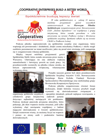 W roku spółdzielczości, w sobotę 31 marca, mieliśmy przyjemność gościć wszystkich zainteresowanych na Pierwszym Pikniku Spółdzielczym zorganizowanym przez Stowarzyszenie LGD „Zielone Sąsiedztwo” we współpracy z grupą inicjatywną, która została powołana w celu utworzenia na terenie Podkowy Leśnej i Brwinowa spółdzielni socjalnej. Spotkanie odbyło się na terenie CKiIO w Podkowie Leśnej. Podczas pikniku zaprezentowały się spółdzielnie socjalne oraz organizacje, które wspierają ich powstawanie i działalność, dzięki czemu mieszkańcy Podkowy i okolic mogli osobiście porozmawiać na temat możliwości, jakie się przed nimi otwierają, jeśli zaangażują się w zorganizowanie własnej spółdzielni. Między innymi mieliśmy przyjemność gościć Spółdzielnię MaM, która została utworzona przez mamy z Warszawy. Ułatwiająca im ona zdobycie większej samodzielności i łatwiejszy powrót na rynek pracy. Jej przedstawicielki rozstawiły na pikniku własne stoisko, na którym zaprezentowały świąteczną, własnoręcznie wykonaną ofertę. Ponadto naszymi gośćmi byli także przedstawiciele Spółdzielni Socjalnej Artystów UAD, Stowarzyszenia Socjalnego Bursa Kofeda, Fundacji Rozwoju Społeczeństwa Obywatelskiego oraz nieformalnej grupy Brwinowska Kooperatywa Spożywcza. Podczas pikniku zorganizowano również forum dyskusyjne, dzięki któremu wszyscy przybyli mogli wymienić się doświadczeniami związanymi z organizacją spółdzielni socjalnych – specjaliści doradzali, polecali najlepsze rozwiązania, a członkowie grupy inicjatywnej zadawali pytania dotyczące najbardziej nurtujących ich problemów. Podczas dyskusji panowała przyjazna atmosfera, która pokazuje, jak duże wsparcie można otrzymać, jeśli tylko wykażemy chęć nawiązania współpracy z ludźmi mającymi doświadczenie w kwestii spółdzielczości. Dzięki rozmowom wiemy, że możemy liczyć na wsparcie i pomoc ze strony osób i podmiotów bardziej doświadczonych. Jako że planowana na naszym terenie spółdzielnia socjalna ma zajmować się między innymi opieką nad dziećmi i ich edukacją poprzez zabawę, jedna z członkiń grupy inicjatywnej przygotowała dla dzieciaków gry i zabawy integracyjne, a roześmiane buzie naszych małych gości, do których należały również dzieci z ośrodka dla uchodźców na Dębaku, były najlepszym świadectwem, że przyjemnie spędziły czas podczas pikniku. Mimo niesprzyjającej i zmiennej pogody udało nam się również rozpalić ognisko, nad którym chętni mogli upiec kiełbaski oraz przygotowane specjalnie dla wegetarian warzywa –nie ma przecież prawdziwego pikniku bez ogniska, a żadne dziecko nie będzie w pełni zadowolone, jeśli nie przypiecze sobie własnego kawałka chleba nad ogniem. Dorośli także z przyjemnością korzystali z ciepła promieniującego od ogniska i rozmowy toczyły się przy nim jeszcze długo po planowanym zakończeniu naszego pierwszego pikniku spółdzielczego. Pod koniec marca zawiązała się formalna grupa inicjatywna. Obecnie pozostaje nam włożyć jak najwięcej czasu i wysiłku w stworzenie Spółdzielni, która spełni oczekiwania zarówno jej założycieli, jak i mieszkańców Podkowy Leśnej i okolic, którzy będą mogli korzystać z jej usług i pomocy. To spotkanie w szerszym gronie udowodniło nam, że mimo dużego nakładu pracy, która nas czeka, warto to robić. Kaja Łęcka W imieniu Zarządu Stowarzyszenia dziękujemy za obecność wszystkim gościom Pikniku, szczególnie serdecznie dziękujemy koordynatorom p. Arturowi Zielińskiemu i Kaji Łęckiej, oraz Adze Papis i Ani Zych. Wasze ciasta i kanapki były zdrowe i pyszne a zaanimowane zabawy edukacyjne i wesołe. Dziękujemy także członkom LGD; Ewie Chojeckiej, Piotrowi Skalskiemu i Basi Potkańskiej. Jak zawsze można na Was polegać. Anna Łukasiewicz, Prezes