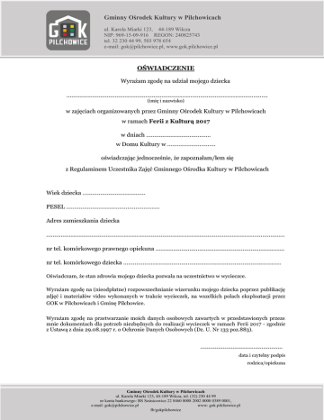 Zgoda na udział w zajęciach Ferie z Kulturą