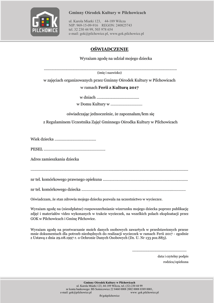 Gminny Ośrodek Kultury w Pilchowicach ul. Karola Miarki 123, 44-189 Wilcza NIP: 969-15-09-916 REGON: 240825743 tel. 32 230 44 99, 503 978 654 e-mail: [email protected], www.gok.pilchowice.pl OŚWIADCZENIE Wyrażam zgodę na udział mojego dziecka ............................................................................................................................. (imię i nazwisko) w zajęciach organizowanych przez Gminny Ośrodek Kultury w Pilchowicach w ramach Ferii z Kulturą 2017 w dniach …..................................... w Domu Kultury w ………………………… oświadczając jednocześnie, że zapoznałam/łem się z Regulaminem Uczestnika Zajęć Gminnego Ośrodka Kultury w Pilchowicach Wiek dziecka ….................................... PESEL …………………………………………………. Adres zamieszkania dziecka .................................................................................................................................................... nr tel. komórkowego prawnego opiekuna ................................................................................ nr tel. komórkowego dziecka …………………………………………………………………………..………… Oświadczam, że stan zdrowia mojego dziecka pozwala na uczestnictwo w wycieczce. Wyrażam zgodę na (nieodpłatne) rozpowszechnianie wizerunku mojego dziecka poprzez publikację zdjęć i materiałów video wykonanych w trakcie wycieczek, na wszelkich polach eksploatacji przez GOK w Pilchowicach i Gminę Pilchowice. Wyrażam zgodę na przetwarzanie moich danych osobowych zawartych w przedstawionych przeze mnie dokumentach dla potrzeb niezbędnych do realizacji wycieczek w ramach Ferii 2017 - zgodnie z Ustawą z dnia 29.08.1997 r. o Ochronie Danych Osobowych (Dz. U. Nr 133 poz.883). ................................................... data i czytelny podpis rodzica/opiekuna Gminny Ośrodek Kultury w Pilchowicach ul. Karola Miarki 123, 44-189 Wilcza, tel. (32) 230 44 99 nr konta bankowego: BS Sośnicowice 22 8460 0008 2002 0008 0389 0001, e-mail: [email protected] www: gok.pilchowice.pl fb/gokpilchowice Gminny Ośrodek Kultury w Pilchowicach ul. Karola Miarki 123, 44-189 Wilcza NIP: 969-15-09-916 REGON: 240825743 tel. 32 230 44 99, 503 978 654 e-mail: [email protected], www.gok.pilchowice.pl REGULAMIN UCZESTNIKA ZAJĘĆ Gminnego Ośrodka Kultury w Pilchowicach 1. Wszyscy uczestnicy zobowiązani są do posłuszeństwa i wykonywania poleceń opiekunów. 2. Zabrania się samowolnego oddalania od grupy. 3. Należy przestrzegać punktualnego stawiania się w miejscach zbiórek. 4. Wszelkie niedyspozycje trzeba zgłaszać opiekunowi; zabrania się przyjmowania leków bez wiedzy opiekuna. 5. Zabrania się spożywania i posiadania wszelkich używek (alkohol, papierosy, narkotyki); w przypadku stwierdzenia posiadania ich lub spożycia, kierownik wycieczki jest zobowiązany do powiadomienia rodziców. 6. W miejscach spożywania posiłków i miejscach zwiedzania należy przestrzegać wewnętrznych regulaminów ośrodków. 7. Należy zachowywać się stosownie do miejsca pobytu (zakaz niszczenia przyrody, zakaz rozpalania ogniska w miejscach niedozwolonych). 8. Dbać o bezpieczeństwo swoje i innych. 9. Każdy uczestnik powinien być wyposażony w odpowiedni strój - obuwie zmienne i wygodny strój (w zależności od rodzaju wycieczki – ciepłe ubranie, łyżwy, napój, kanapka, itp). 10. Za wszelkie szkody wyrządzone podczas zajęć/wycieczek odpowiada prawny opiekun uczestnika wycieczki. 11. Rodzice/prawni opiekunowie ponoszą odpowiedzialność za zdrowie i bezpieczeństwo dzieci do momentu przyprowadzenia oraz od chwili odebrania dziecka po zajęciach 12. Uczestnicy potwierdzają własnoręcznym podpisem fakt zapoznania się z regulaminem i zobowiązują się przestrzegać zawartych w nich zasad, jeżeli uczestnikiem zajęć jest osoba niepełnoletnia podpis składa prawny opiekun dziecka. Regulamin może być uzupełniane na bieżąco przez opiekunów zajęć, gdy będzie tego wymagało bezpieczeństwo uczestników. ................................................. data i czytelny podpis rodzica/opiekuna Gminny Ośrodek Kultury w Pilchowicach ul. Karola Miarki 123, 44-189 Wilcza, tel. (32) 230 44 99 nr konta bankowego: BS Sośnicowice 22 8460 0008 2002 0008 0389 0001, e-mail: [email protected] www: gok.pilchowice.pl fb/gokpilchowice