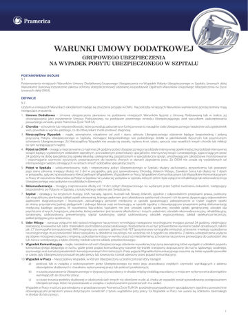 WARUNKI UMOWY DODATKOWEJ GRUPOWEGO UBEZPIECZENIA NA WYPADEK POBYTU UBEZPIECZONEGO W SZPITALU POSTANOWIENIA OGÓLNE §1 Postanowienia niniejszych Warunków Umowy Dodatkowej Grupowego Ubezpieczenia na Wypadek Pobytu Ubezpieczonego w Szpitalu (zwanych dalej Warunkami) stanowią rozszerzenie zakresu ochrony ubezpieczeniowej udzielanej na podstawie Ogólnych Warunków Grupowego Ubezpieczenia na Życie (zwanych dalej OWU). DEFINICJE §2 Użytym w niniejszych Warunkach określeniom nadaje się znaczenie przyjęte w OWU. Na potrzeby niniejszych Warunków wymienione poniżej terminy mają następujące znaczenia: 1.Umowa Dodatkowa – Umowa ubezpieczenia zawierana na podstawie niniejszych Warunków łącznie z Umową Podstawową lub w trakcie jej obowiązywania jako rozszerzenie Umowy Podstawowej, na podstawie pisemnego wniosku Ubezpieczającego, pod warunkiem zaakceptowania powyższego wniosku przez Pramerica Życie TUiR SA; 2. Choroba – schorzenie lub nieprawidłowość, które powodują zaburzenia w funkcjonowaniu narządów ciała Ubezpieczonego niezależnie od czyjejkolwiek woli, powstałe w wyniku patologii, co do której lekarz może postawić diagnozę; 3.Nieszczęśliwy Wypadek – nagłe, zewnętrzne, niezależne od woli i stanu zdrowia Ubezpieczonego zdarzenie będące bezpośrednią i jedyną przyczyną Pobytu Ubezpieczonego w Szpitalu, niemające bezpośredniego lub pośredniego źródła w jakimkolwiek fizycznym lub psychicznym schorzeniu Ubezpieczonego. Za Nieszczęśliwy Wypadek nie uważa się zawału, wylewu krwi, udaru, zatrucia oraz wszelkich innych chorób lub infekcji (w tym występujących nagle); 4.Pobyt na OIOM – trwający nieprzerwanie co najmniej 24 godziny pobyt Ubezpieczonego na oddziale intensywnej opieki medycznej (oddział intensywnej terapii) będący wydzielonym oddziałem szpitalnym, prowadzonym przez lekarzy specjalistów intensywnej terapii i anestezjologii, zapewniającym przez 24 godziny na dobę specjalistyczną opiekę lekarską i pielęgniarską, zaopatrzonym w specjalistyczny sprzęt, umożliwiającym całodobowe monitorowanie i wspomaganie czynności życiowych, przeznaczonym do leczenia chorych w stanach zagrożenia życia. Za OIOM nie uważa się wydzielonych sal intensywnego nadzoru istniejących w ramach innych oddziałów specjalistycznych; 5.Pobyt w Szpitalu – udokumentowany, stały i nieprzerwany pobyt Ubezpieczonego w Szpitalu służący zachowaniu, przywróceniu lub poprawie jego stanu zdrowia, trwający dłużej niż 3 dni w przypadku, gdy jest spowodowany Chorobą, Udarem Mózgu, Zawałem Serca lub dłużej niż 1 dzień w przypadku, gdy jest spowodowany Nieszczęśliwym Wypadkiem, Wypadkiem w Pracy, Wypadkiem Komunikacyjnym lub Wypadkiem Komunikacyjnym w Pracy. W rozumieniu Warunków za Pobyt w Szpitalu nie uważa się: pobytów w szpitalu, których celem była wyłącznie rehabilitacja lub rekonwalescencja Ubezpieczonego oraz pobytów na oddziałach dziennych; 6. Rekonwalescencja – trwający nieprzerwanie dłużej niż 14 dni pobyt Ubezpieczonego na wydanym przez Szpital zwolnieniu lekarskim, następujący bezpośrednio po Pobycie w Szpitalu, z tytułu którego należne jest Świadczenie; 7. Szpital – działający na terytorium Europy, USA, Kanady, Japonii, Australii lub Nowej Zelandii, zgodnie z odpowiednimi przepisami prawa, publiczny lub niepubliczny zamknięty zakład opieki zdrowotnej, którego zadaniem jest całodobowa opieka nad chorymi i ich leczenie, dysponujący odpowiednim zapleczem diagnostycznym i leczniczym, zatrudniający personel medyczny w sposób gwarantujący zabezpieczenie w trybie ciągłym opieki ze strony przynajmniej jednej pielęgniarki i jednego lekarza oraz archiwizujący w sposób zgodny z obowiązującymi przepisami pełną dokumentację medyczną każdego pacjenta. W rozumieniu Warunków Szpitalem nie jest: ośrodek opieki społecznej, ośrodek opieki geriatrycznej, ośrodek dla psychicznie chorych, hospicjum, placówka, której zadaniem jest leczenie alkoholizmu i innych uzależnień, ośrodek rekonwalescencyjny, rehabilitacyjny, sanatoryjny, uzdrowiskowy, prewentoryjny, szpital sanatoryjny, szpital uzdrowiskowy, ośrodek wypoczynkowy, zakład opiekuńczo-leczniczy, zakład pielęgnacyjno-opiekuńczy; 8.Udar Mózgu – oznacza wyłącznie taki epizod mózgowo-naczyniowy wywołujący następstwa neurologiczne trwające ponad 24 godziny, obejmujący zakrzepicę, krwawienie lub zator materiałem pochodzenia pozaczaszkowego. Rozpoznanie musi być potwierdzone wynikami badań obrazowych, takimi jak: CT (tomografia komputerowa), MRI (magnetyczny rezonans jądrowy) lub PET (pozytronowa tomografia emisyjna), a istnienie trwałego uszkodzenia neurologicznego musi potwierdzić lekarz specjalista w dziedzinie neurologii, nie wcześniej niż 6 tygodni po zdarzeniu. Z zakresu ubezpieczenia wyłącza się objawy mózgowe związane z migreną, uszkodzenia mózgu w wyniku urazu lub niedotlenienia, schorzenia naczyniowe prowadzące do uszkodzeń oka lub nerwu wzrokowego, a także choroby niedokrwienne układu przedsionkowego; 9.Wypadek Komunikacyjny – nagłe, niezależne od woli Ubezpieczonego zdarzenie wywołane przyczyną zewnętrzną, które wystąpiło z udziałem pojazdu komunikacyjnego będącego w ruchu, gdzie przez pojazd komunikacyjny rozumie się środek transportu dopuszczony do ruchu lądowego, wodnego, szynowego oraz samolot pasażerskich koncesjonowanych linii lotniczych. Przez pojęcie Wypadku Komunikacyjnego rozumie się także wypadki powstałe w czasie, gdy Ubezpieczony poruszał się jako pieszy lub rowerzysta i został uderzony przez pojazd komunikacyjny; 10.Wypadek w Pracy – Nieszczęśliwy Wypadek, w którym Ubezpieczony uczestniczył oraz który nastąpił: a)podczas lub w związku z wykonywaniem przez Ubezpieczonego na rzecz jego pracodawcy zwykłych czynności wynikających z zakresu obowiązków służbowych i charakteru wykonywanej pracy lub poleceń przełożonych; b)w czasie pozostawa