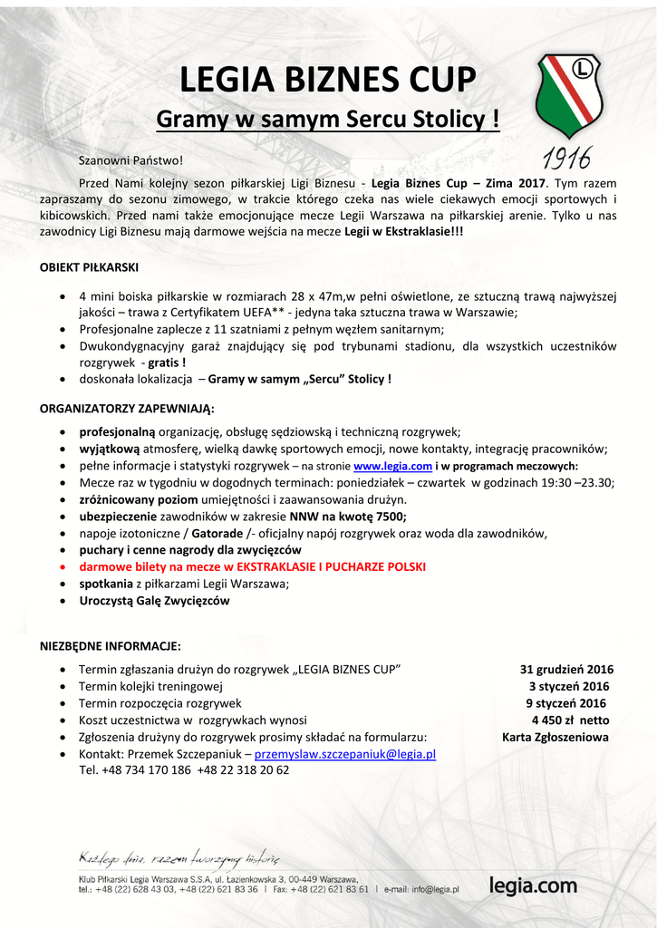 LEGIA BIZNES CUP Gramy w samym Sercu Stolicy ! Szanowni Państwo! Przed Nami kolejny sezon piłkarskiej Ligi Biznesu - Legia Biznes Cup – Zima 2017. Tym razem zapraszamy do sezonu zimowego, w trakcie którego czeka nas wiele ciekawych emocji sportowych i kibicowskich. Przed nami także emocjonujące mecze Legii Warszawa na piłkarskiej arenie. Tylko u nas zawodnicy Ligi Biznesu mają darmowe wejścia na mecze Legii w Ekstraklasie!!! OBIEKT PIŁKARSKI 4 mini boiska piłkarskie w rozmiarach 28 x 47m,w pełni oświetlone, ze sztuczną trawą najwyższej jakości – trawa z Certyfikatem UEFA** - jedyna taka sztuczna trawa w Warszawie; Profesjonalne zaplecze z 11 szatniami z pełnym węzłem sanitarnym; Dwukondygnacyjny garaż znajdujący się pod trybunami stadionu, dla wszystkich uczestników rozgrywek - gratis ! doskonała lokalizacja – Gramy w samym „Sercu” Stolicy ! ORGANIZATORZY ZAPEWNIAJĄ: profesjonalną organizację, obsługę sędziowską i techniczną rozgrywek; wyjątkową atmosferę, wielką dawkę sportowych emocji, nowe kontakty, integrację pracowników; pełne informacje i statystyki rozgrywek – na stronie www.legia.com i w programach meczowych: Mecze raz w tygodniu w dogodnych terminach: poniedziałek – czwartek w godzinach 19:30 –23.30; zróżnicowany poziom umiejętności i zaawansowania drużyn. ubezpieczenie zawodników w zakresie NNW na kwotę 7500; napoje izotoniczne / Gatorade /- oficjalny napój rozgrywek oraz woda dla zawodników, puchary i cenne nagrody dla zwycięzców darmowe bilety na mecze w EKSTRAKLASIE I PUCHARZE POLSKI spotkania z piłkarzami Legii Warszawa; Uroczystą Galę Zwycięzców NIEZBĘDNE INFORMACJE: Termin zgłaszania drużyn do rozgrywek „LEGIA BIZNES CUP” Termin kolejki treningowej Termin rozpoczęcia rozgrywek Koszt uczestnictwa w rozgrywkach wynosi Zgłoszenia drużyny do rozgrywek prosimy składać na formularzu: Kontakt: Przemek Szczepaniuk – [email protected] Tel. +48 734 170 186 +48 22 318 20 62 31 grudzień 2016 3 styczeń 2016 9 styczeń 2016 4 450 zł netto Karta Zgłoszeniowa