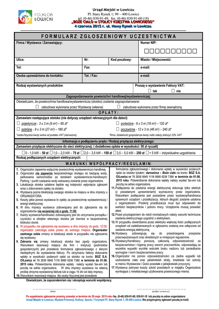 Urząd Miejski w Łowiczu Pl. Stary Rynek 1; 99 – 400 Łowicz tel. (0-46) 830-91-49, fax. (0-46) 830-91-60 (18) „„BBO OŻŻEE CCIIAAŁŁO Ow w SSTTO OLLIICCYY KKSSIIĘĘSSTTW WAA ŁŁO OW WIICCKKIIEEGGO O”” 44 cczzeerrw c a 2 0 1 5 r . u l . N o w y R y n e k w Ł o w i c z u wca 2015 r. ul. Nowy Rynek w Łowiczu FORMULARZ ZGŁOSZENIOWY UCZESTNICTWA Firma / Wystawca / Zamawiający: Numer NIP: □□□□□□□□□□ Ulica: Nr: Kod pocztowy: Tel: Fax: e-mail: Osoba upoważniona do kontaktu: Tel. / Fax: e-mail: Rodzaj wystawianych produktów: Miasto / Miejscowość: Proszę o wystawienie Faktury VAT: tak nie Zagospodarowanie powierzchni handlowej/wystawienniczej: Oświadczam, że powierzchnia handlowa/wystawiennicza (stoisko) zostanie zagospodarowane: zabudowa wykonana przez Wystawcę (własna) zabudowa wykonana przez firmę zewnętrzną OPŁATY: Zamawiam następujące stoisko (nie dotyczy urządzeń rekreacyjnych dla dzieci) pojedyncze - 3 x 3 m (9 m2) – 60 zł* podwójne - 6 x 3 m (18 m2) – 120 zł* potrójne - 9 x 3 m (27 m2) – 180 zł* poczwórne - 12 x 3 m (46 m2) – 240 zł* *osoba fizyczna kwoty wolne od podatku VAT (darowizna); *firma, działalność gospodarcza kwoty netto należy doliczyć 23% VAT Informacja o podłączeniu prądu / Rodzaj przyłącza elektrycznego: Zamawiam przyłącze elektryczne do sieci elektrycznej: ( dodatkowa opłata w wysokości: 50 zł ryczałt) 0 - 1,0 kW – 50 zł 1,0 – 2,0 kW – 75 zł 2,0 – 3,5 kW – 150 zł Rodzaj podłączanych urządzeń elektrycznych: 3,5 – 5,0 kW – 250 zł > 5 kW – indywidualne uzgodnienia W A R U N K I W S P Ó Ł P R A C Y / R E G U L A M I N: formularza zgłoszeniowego i dokonanie wpłaty w wysokości podanych 1. Organizator zapewnia wyłącznie powierzchnię wystawienniczo-handlową. opłat za stoisko tytułem: darowizna – Boże ciało na konto: BGŻ S.A. 2. Organizator nie zapewnia bezpośredniego dostępu do bieżącej wody, O/Łowicz nr 76 2030 0045 1110 0000 0236 7380 w terminie do 01.06. parkowania samochodów za stoiskiem wystawienniczo-handlowym; 2015 roku. Potwierdzenie dokonania wpłaty należy wysłać fax-em lub Parking i punkt czerpania wody wskazany zostanie przez organizatora. pocztą na adres organizatora. 3. Lokalizacja stoiska ustalana będzie wg kolejności wpłynięcia zgłoszeń 11. Podłączenia do zasilania energii elektrycznej dokonuje tylko elektryk wraz z dokonaniem opłaty za stoisko; (z posiadanymi uprawnieniami) wyznaczony przez organizatora. 4. Wystawca pozna lokalizację swojego stoiska na miejscu w dniu imprezy u Warunkiem podłączenia jest posiadanie przez wystawcę/handlowca ORGANIZATORA. sprawnych urządzeń i przedłużaczy, których długość zostanie ustalona 5. Koszty jakie ponosi wystawca to opłaty za powierzchnię wystawienniczą i z organizatorem. Przekrój przedłużacza musi być odpowiedni do energii elektrycznej. wartości bezpieczników i poboru mocy. Urządzenia muszą posiadać 6. W dniu imprezy wystawca zobowiązany jest do zgłoszenia się do atest. organizatorów nie wcześniej niż o godz. 11:00. 7. Każdy wystawca/handlowiec zobowiązany jest do utrzymania porządku i 12. Przed przystąpieniem do robót montażowych należy warunki techniczne zasilania elektrycznego uzgodnić z elektrykiem. czystości w obrębie własnego stoiska jak również w bezpośredniej 13. W przypadku stwierdzenia przez elektryka większej ilości podłączanych bliskości stoisk. urządzeń od zadeklarowanych w zgłoszeniu zostaną one odłączone od 8. W przypadku nie zgłoszenia się wystawcy w dniu imprezy do godz. 12:00, zasilania energią elektryczną. organizator zastrzega sobie prawo do wolnego miejsca. Organizator zastrzega sobie zmiany w lokalizacji stoisk w przypadku nie zgłoszenia 14. Wystawcy zobowiązują się do przestrzegania przepisów przeciwpożarowych oraz określonych w niniejszym regulaminie. się wystawcy. 9. Zabrania się zmiany lokalizacji stoiska bez zgody organizatora. 15. Wystawcy/handlowcy ponoszą całkowitą odpowiedzialność za bezpieczeństwo i higienę pracy swoich pracowników, odpowiadają za Warunkiem rezerwacji miejsca dla firm i instytucji (podmiotów wszelkie wypadki wynikłe wskutek braku nadzoru lub zaniedbania gospodarczych) jest przesłanie formularza zgłoszeniowego z danymi wymogów i norm bezpieczeństwa pracy. niezbędnymi do wystawienia faktury. Po otrzymaniu faktury dokonanie wpłaty w wysokości podanych opłat za stoisko na konto: BGŻ S.A. 16. Organizator nie ponosi odpowiedzialności za żadne wypadki lub uszkodzenie ciała oraz jakiekolwiek straty, kradzieże lub szkody O/Łowicz nr 76 2030 0045 1110 0000 0236 7380 w terminie do 01.06. w mieniu Wystawców i Gości powstałe z jakiejkolwiek przyczyny. 2015 roku. Potwierdzenie dokonania wpłaty należy wysłać fax-em lub pocztą na adres organizatora. W dniu imprezy wystawca na własną 17. Wystawca pokrywa koszty szkód powstałych w majątku Organizatora wynikające z niewłaściwego użytkowania powierzonego mienia. prośbę otrzyma wystawioną fakturę lub w ciągu 14 dni od daty imprezy. 10. Warunkiem rezerwacji miejsca dla osoby fizycznej jest przesłanie Oświadczam, że zapoznałem/am się i akceptuję warunki współpracy. ………………………… (data) ……………………………. (podpis wystawcy) Po wypełnieniu zgłoszenie prosimy przesłać w terminie do 29 maja 2015 roku fax. (0-46) 830-91-60, 830-91-18 lub pocztą na adres organizatora: Urząd Miejski w Łowiczu, Wydział Promocji, Kultury, Sportu i Turystyki Pl. Stary Rynek 1, 99-400 Łowicz. Nie przyjmujemy zgłoszeń pocztą (e-mail)