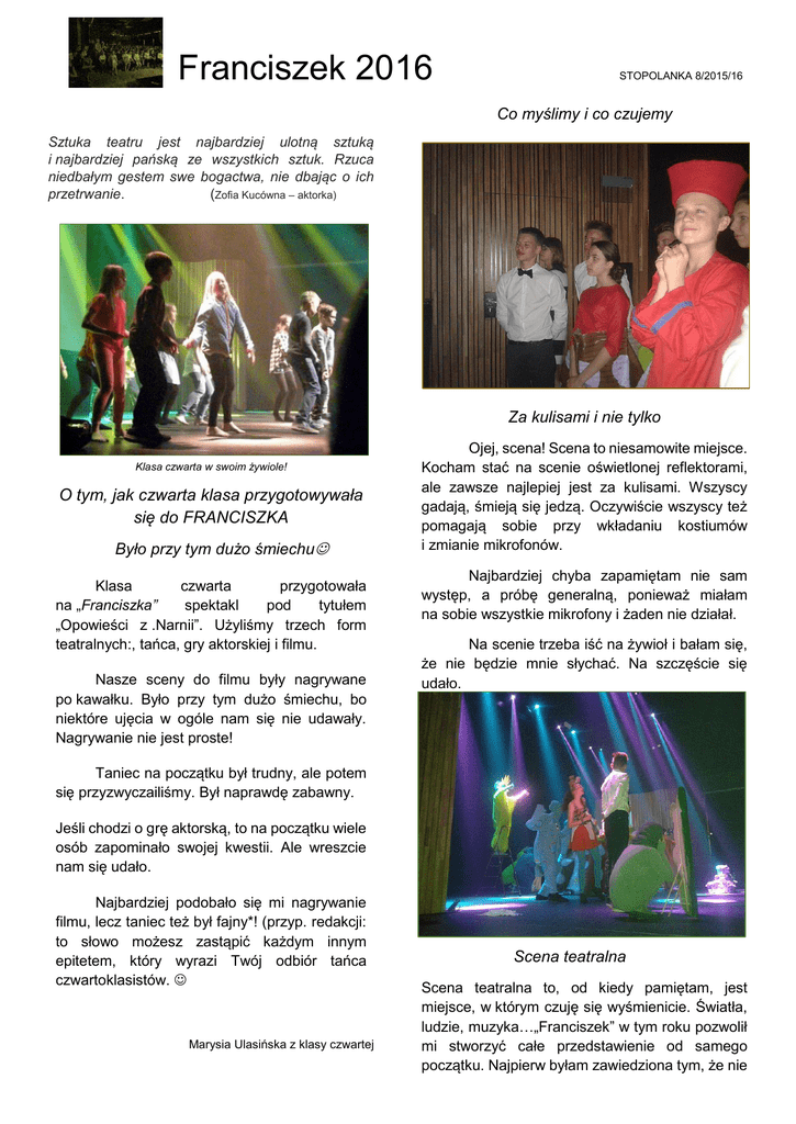 Franciszek 2016 STOPOLANKA 8/2015/16 Co myślimy i co czujemy Sztuka teatru jest najbardziej ulotną sztuką i najbardziej pańską ze wszystkich sztuk. Rzuca niedbałym gestem swe bogactwa, nie dbając o ich przetrwanie. (Zofia Kucówna – aktorka) Za kulisami i nie tylko Klasa czwarta w swoim żywiole! O tym, jak czwarta klasa przygotowywała się do FRANCISZKA Było przy tym dużo śmiechu Klasa czwarta przygotowała na „Franciszka” spektakl pod tytułem „Opowieści z .Narnii”. Użyliśmy trzech form teatralnych:, tańca, gry aktorskiej i filmu. Nasze sceny do filmu były nagrywane po kawałku. Było przy tym dużo śmiechu, bo niektóre ujęcia w ogóle nam się nie udawały. Nagrywanie nie jest proste! Ojej, scena! Scena to niesamowite miejsce. Kocham stać na scenie oświetlonej reflektorami, ale zawsze najlepiej jest za kulisami. Wszyscy gadają, śmieją się jedzą. Oczywiście wszyscy też pomagają sobie przy wkładaniu kostiumów i zmianie mikrofonów. Najbardziej chyba zapamiętam nie sam występ, a próbę generalną, ponieważ miałam na sobie wszystkie mikrofony i żaden nie działał. Na scenie trzeba iść na żywioł i bałam się, że nie będzie mnie słychać. Na szczęście się udało. Taniec na początku był trudny, ale potem się przyzwyczailiśmy. Był naprawdę zabawny. Jeśli chodzi o grę aktorską, to na początku wiele osób zapominało swojej kwestii. Ale wreszcie nam się udało. Najbardziej podobało się mi nagrywanie filmu, lecz taniec też był fajny*! (przyp. redakcji: to słowo możesz zastąpić każdym innym epitetem, który wyrazi Twój odbiór tańca czwartoklasistów. Marysia Ulasińska z klasy czwartej Scena teatralna Scena teatralna to, od kiedy pamiętam, jest miejsce, w którym czuję się wyśmienicie. Światła, ludzie, muzyka…„Franciszek” w tym roku pozwolił mi stworzyć całe przedstawienie od samego początku. Najpierw byłam zawiedziona tym, że nie Franciszek 2016 zobaczę naszego dzieła z widowni. A okazało się, że przedstawienie oglądane z garderoby to milion razy więcej emocji, śmiechu, stresu, smutku, radości. Wszystkie potknięcia i sukcesy przeżywaliśmy razem. Musieliśmy motywować się wzajemnie, żeby nie płakać nad jedną pomyłką i z podniesioną głową znów wejść na scenę! STOPOLANKA 8/2015/16 Na przekór grypie żołądkowej Próby do naszego przebiegały różnie. Czasem a czasem tragicznie. przedstawienia było dobrze, Nasze przedstawienie oceniam na 5 z minusem. Dlaczego tak słabo? No cóż, zacznę od tego, że miałam grypę żołądkową i za kulisami modliłam się, żeby nie zwymiotować na scenie. Na szczęście obyło się bez wypadku, pomijając ten, gdy w mojej scenie przestał działać mikrofon. Bogu dzięki, pani Beta dostawiła mi mikrofon i jakoś dałam radę. Gdy zeszłam ze sceny, moim jedynym celem było znalezienie mamy i pojechanie do domu. To było coś! Dowiedziałam się, że mam gorączkę. Ale czy mnie to obchodziło? Oczywiście, że nie! Zgadnij, kto to? Stres Na początku strach przed publiką oraz ogromny stres. Jednak po powiedzeniu pierwszej kwestii nie czułem już tego. Pomiędzy występami chodziłem po garderobie, żeby rozładować emocje. Po całym występie czułem się szczęśliwy, że już mam to za sobą. Po występie poszedłem się przejść, żeby znowu wyładować emocje. Taniec z Martą To było tak wielkie przeżycie, tyle emocji, że nie pamiętam , co się ze mną działo, po prostu film mi się urwał. Pamiętam tylko szalony taniec z Martą! „Lubimy Fizię Pończoszankę” Od dzieciństwa dziewczynki marzą, by zagrać rolę księżniczki, a tylko niektórym to się udaje! „Franciszek” wywarł na mnie wrażenie i wzbudził bardzo dużo emocji. wielkie Na początku wszystko wydawało się bardzo trudne i nie do zrobienia. Potrzebowałam jednak tylko trochę wiary w siebie i motywacji ze strony nauczycieli. Po występie, schodząc ze sceny, popłakałam się, ponieważ cała tona emocji zeszła w tym momencie ze mnie. Bardzo się cieszę, że miałam okazję wystąpić i zagrać moją wymarzoną rolę księżniczki. Franciszek 2016 Trzy słowa na miarę: STOPOLANKA 8/2015/16 „Dobrze widzi się tylko sercem” „Być albo nie być-oto jest pytanie” Moje wrażenia sceniczne są bardzo dobre. Denerwowałam się bardzo, ale w końcu poszło dobrze. Co prawda, miałam do powiedzenia tylko trzy słowa, ale były to bardzo stresujące trzy słowa. Mówiąc szczerze, nie chciałabym tego przeżyć ponownie. Scena to zdecydowanie nie miejsce dla mnie, ale moje wspomnienia z występu są pozytywne. Nie pamiętam szczególnie, co się tam działo, bo stres był naprawdę duży. Żadnych anegdot właśnie z tego powodu nie przytoczę. „Najważniejsze jest niewidoczne dla oczu.” Magia sceny Na początku trochę się stresowałam, ale z każdym kolejnym wyjściem na sceną, stresowałam się coraz mniej. Za każdym razem, gdy miałam coś powiedzieć, mikrofon włączał się dopiero w połowie mojego zdania. Raz nawet nie dostałam mikrofonu, więc musiałam krzyczeć, żeby ktokolwiek mógł mnie usłyszeć. Jednak bardzo dobrze wspominam każdy występ. Teksty zebrane i udostępnione przez Małgorzatę Polczyk Minionki wróciły Świat jest teatrem, aktorami ludzie., którzy kolejno wchodzą i znikają. Każdy tam aktor niejedną gra rolę... William Szekspir, Jak wam się podoba